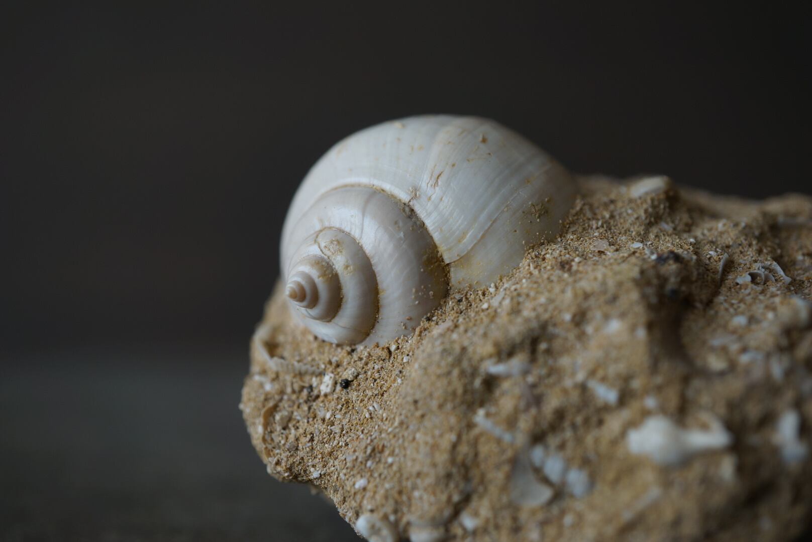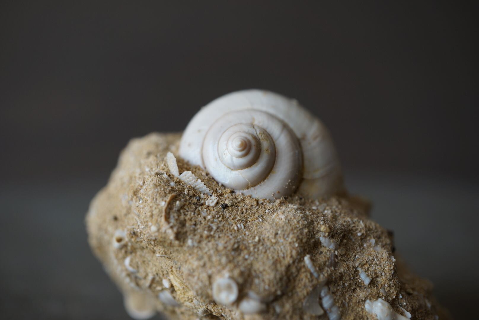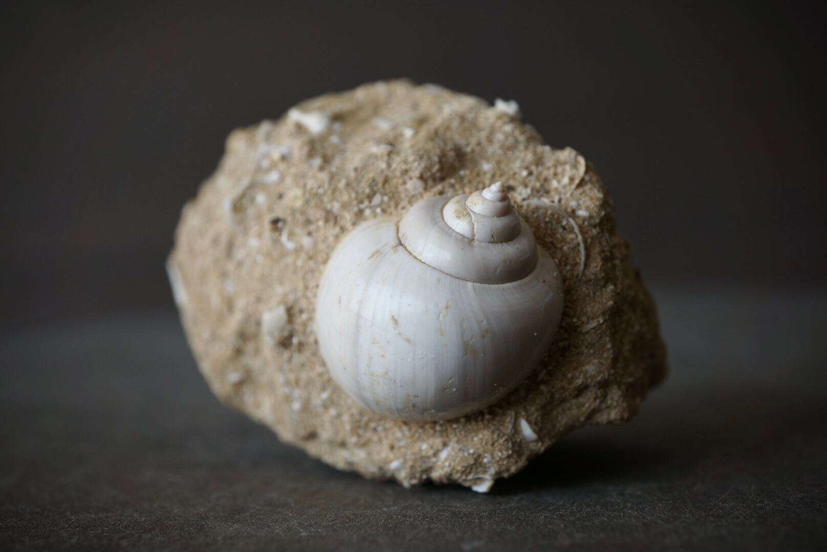 母岩には他種の貝殻や微細な海洋生物の痕跡が多数含まれており、一つの小さな海底断面を切り取ったかのような佇まいは遠い太古の海の静けさを今に伝えてくれるようです。