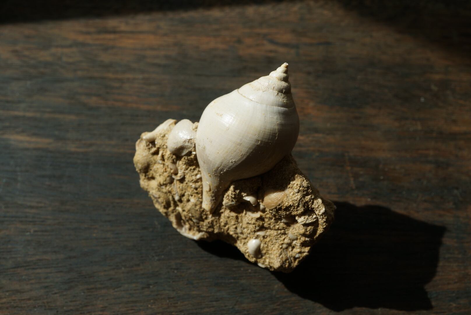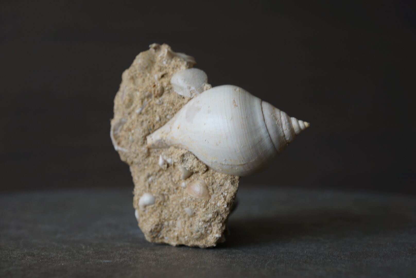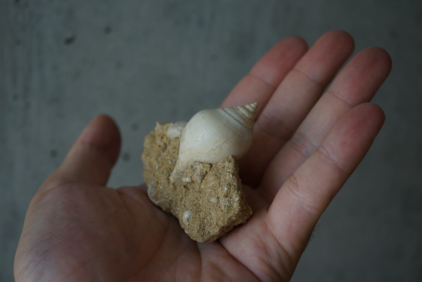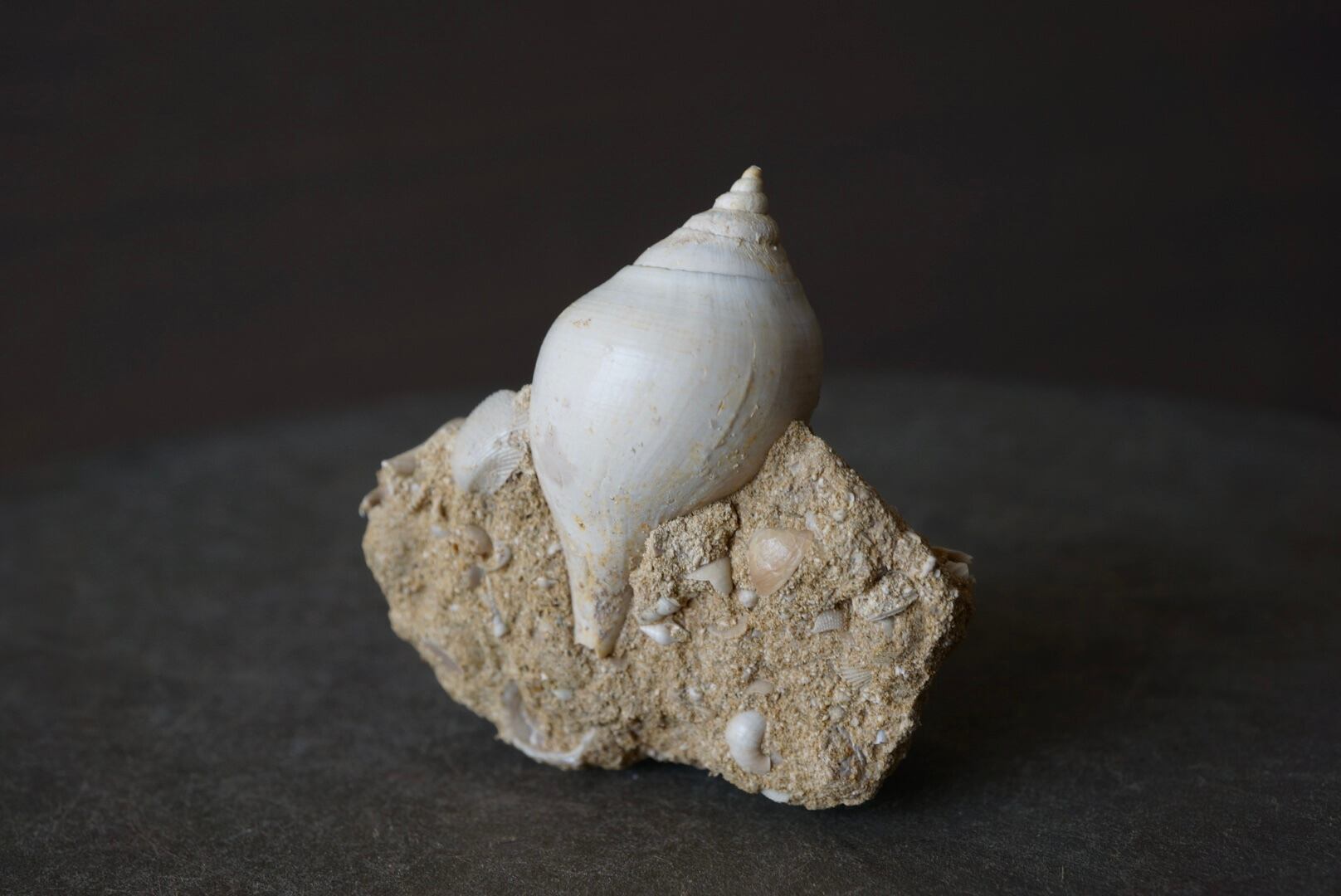 母岩には他種の貝殻や微細な海洋生物の痕跡が多数含まれており、一つの小さな海底断面を切り取ったかのような佇まいは遠い太古の海の静けさを今に伝えてくれるようです。