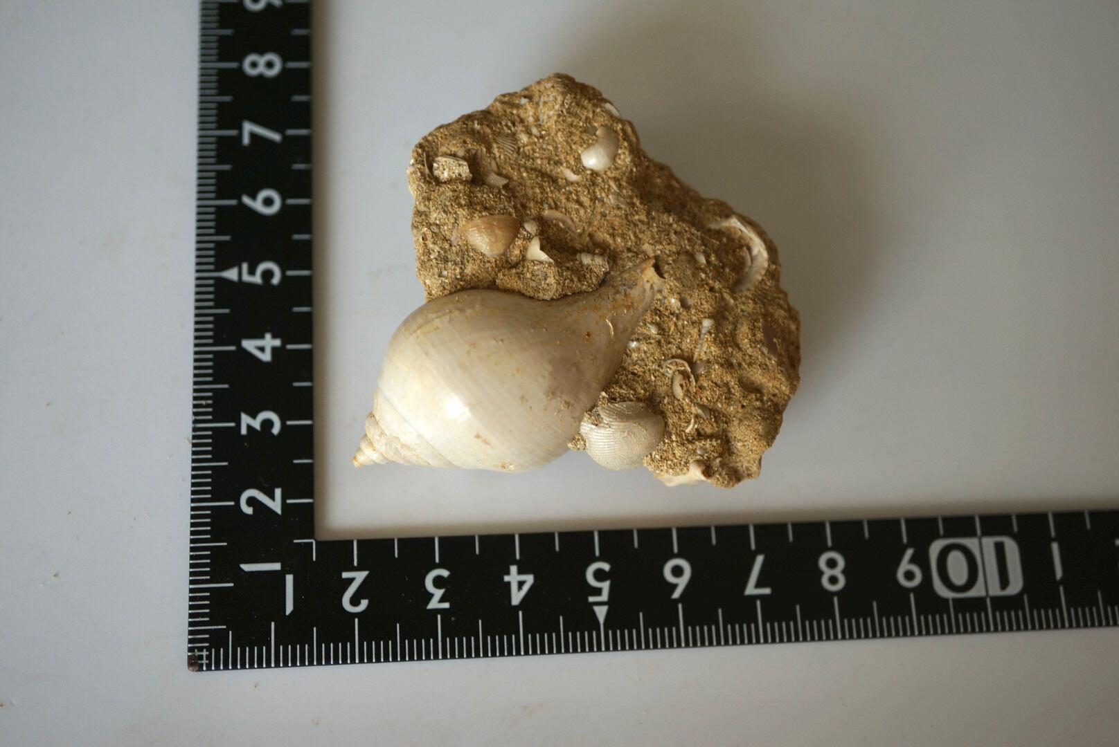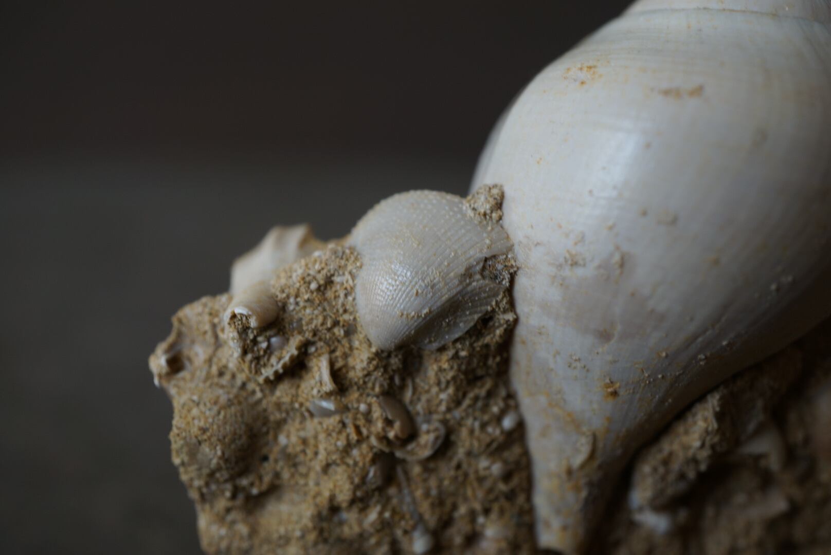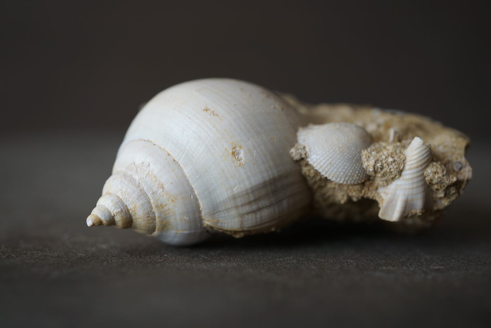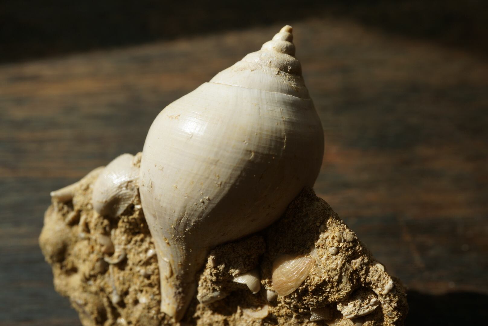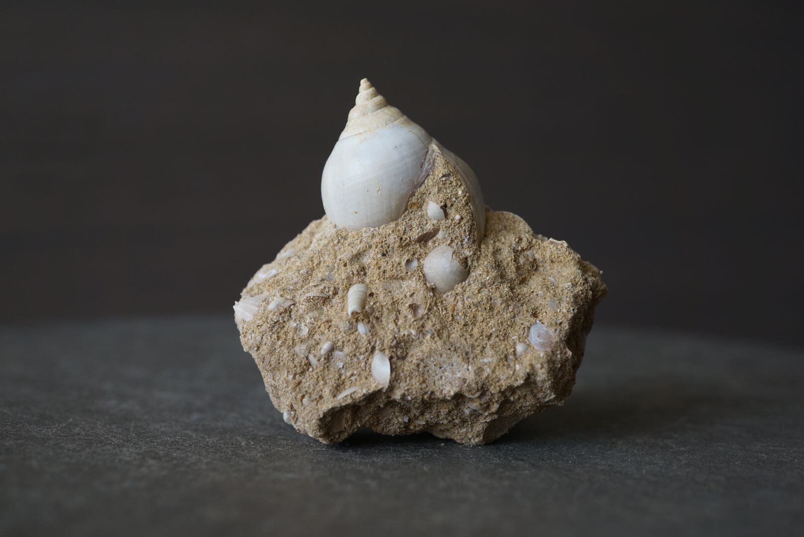 母岩には他種の貝殻や微細な海洋生物の痕跡が多数含まれており、一つの小さな海底断面を切り取ったかのような佇まいは遠い太古の海の静けさを今に伝えてくれるようです。