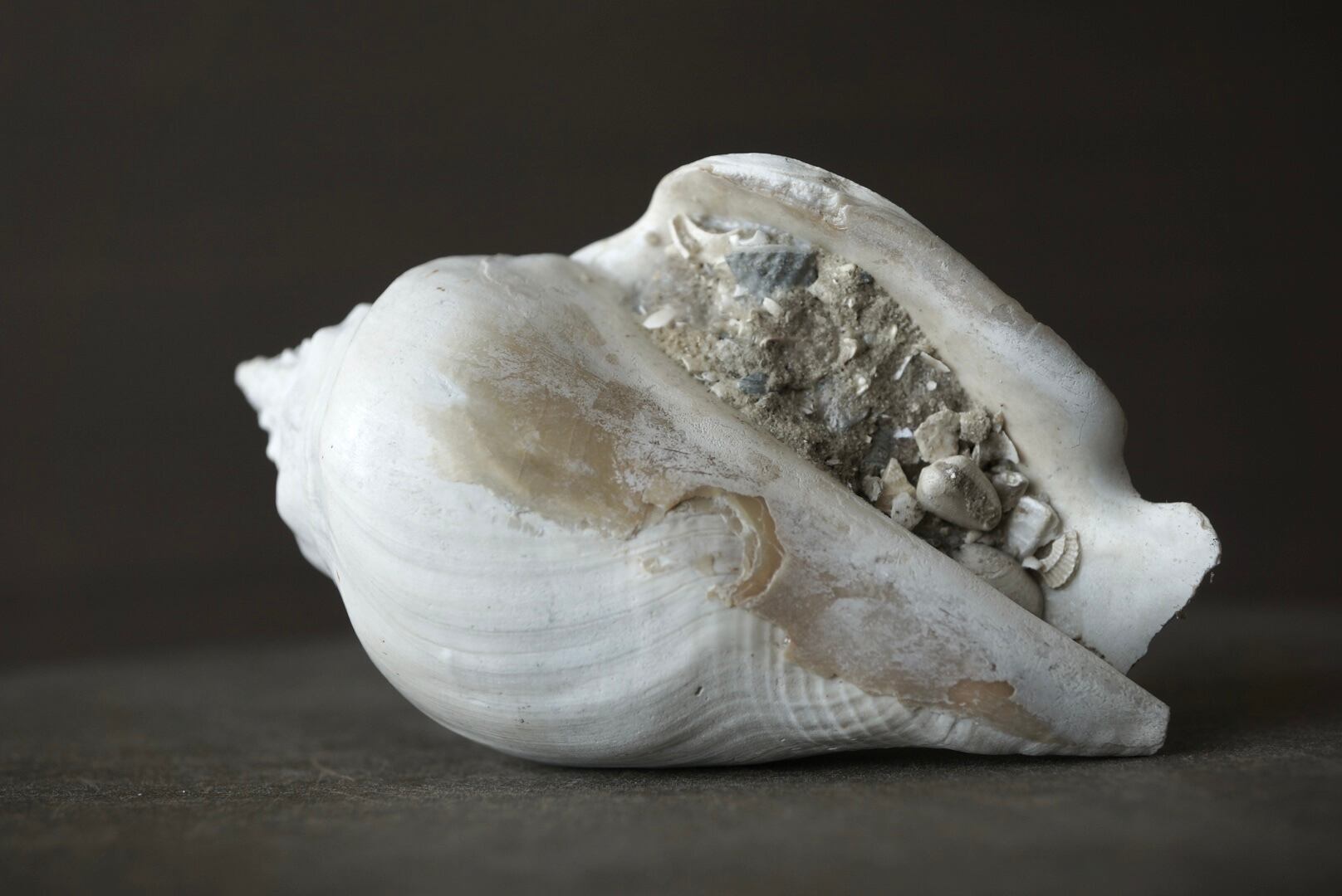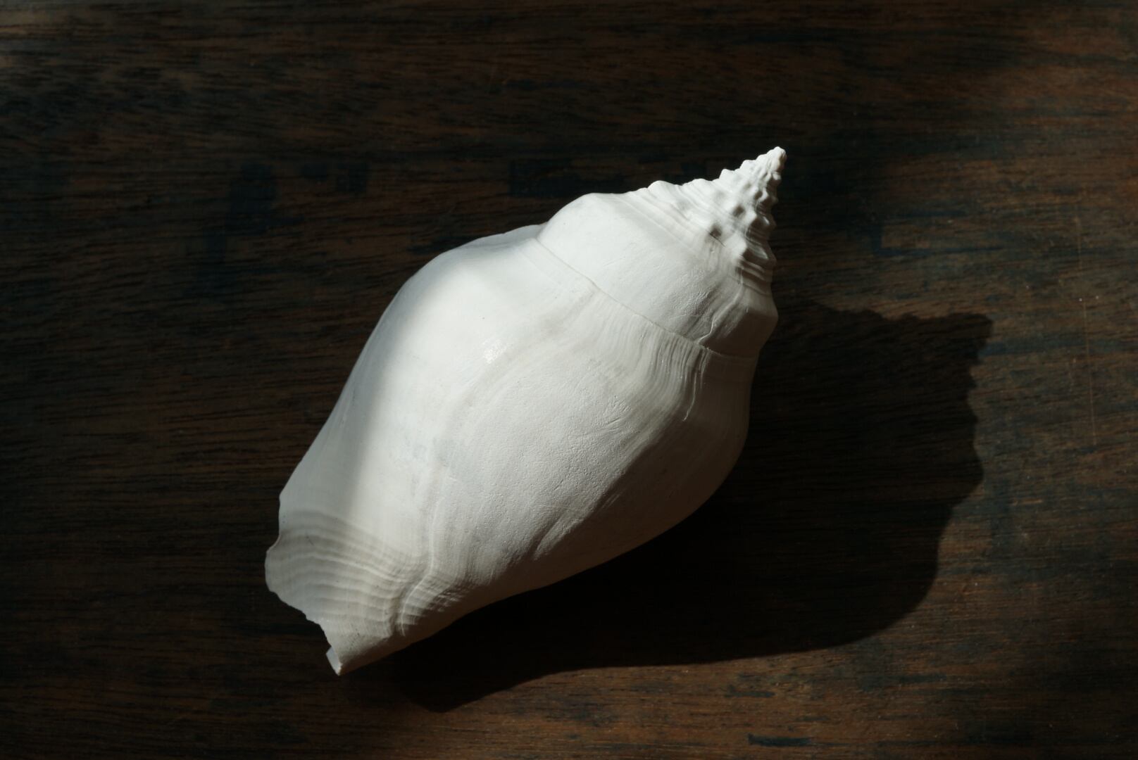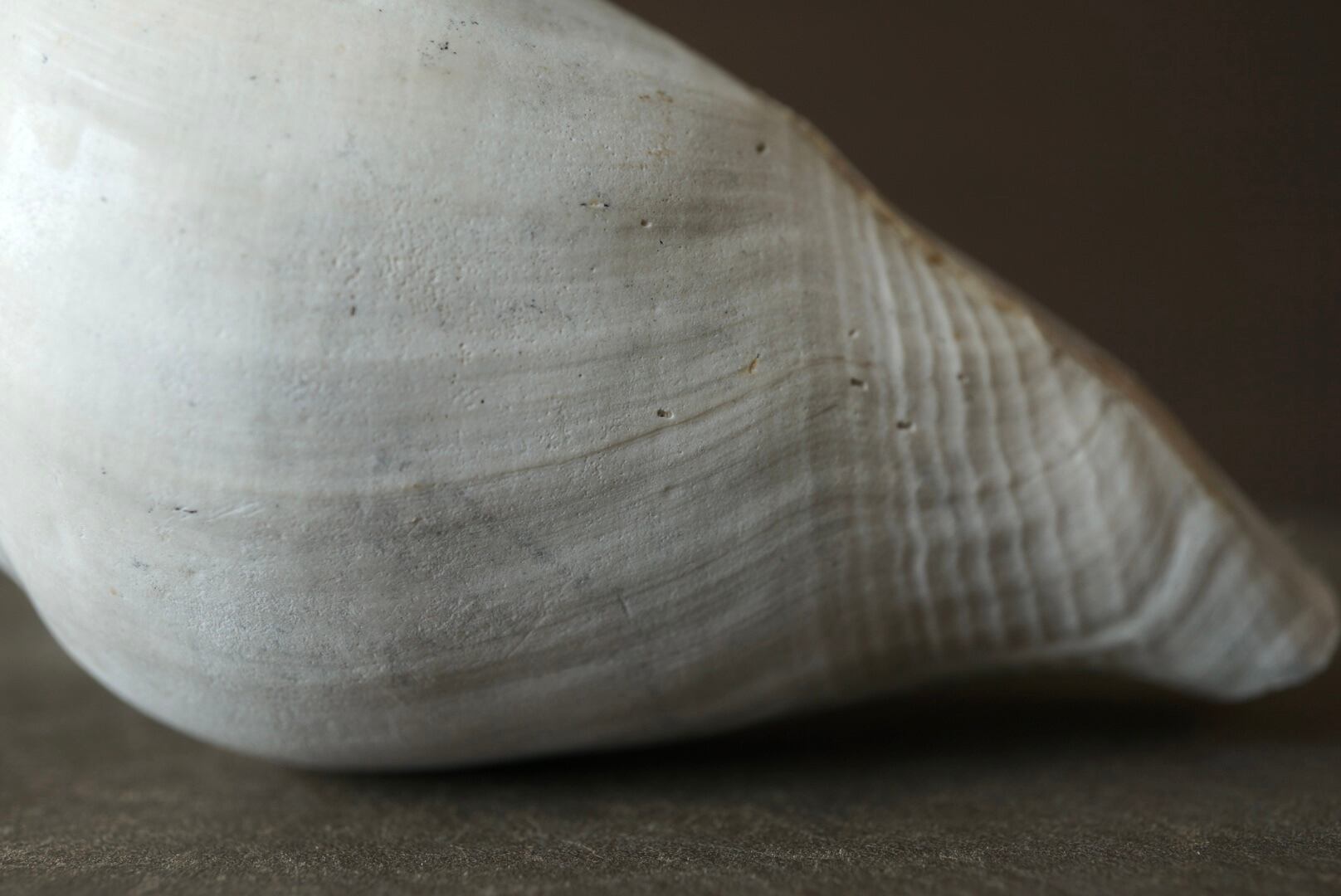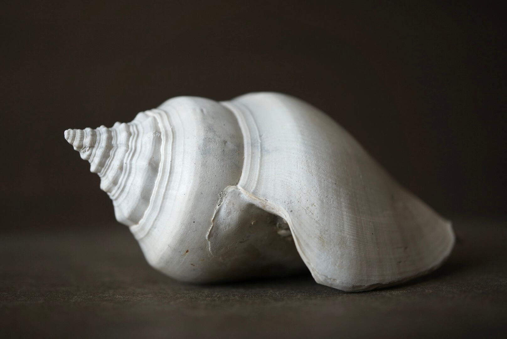 約100万年前(更新世)のフロリダ沿岸に生息していた大型の巻貝 Strombus alatus の化石です。ストロンブス類は現在も熱帯・亜熱帯の浅海に広く分布し、食用や装飾として人々に馴染み深い巻貝ですが、本石は地層中で長い時間を経て石化し、現生標本とは異なる重みと、白色の上品な風合いを纏っています。
