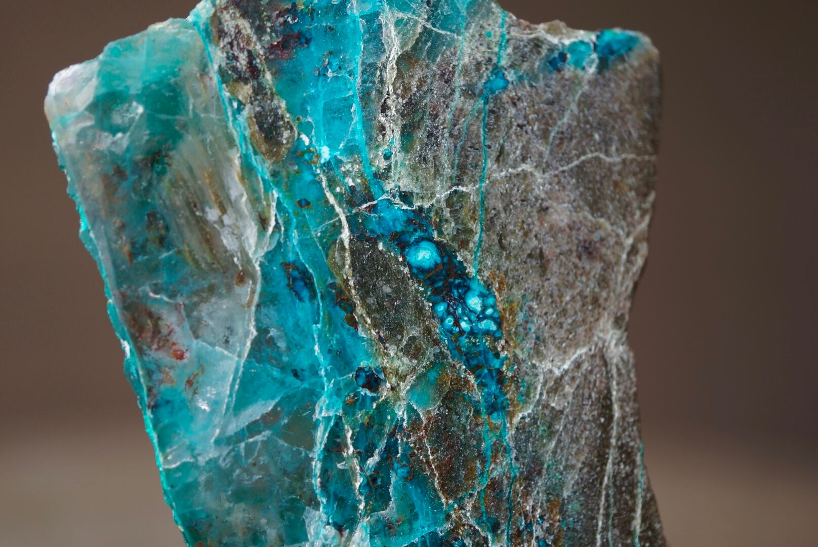 鮮烈な色彩のクリソコラ、マラカイト、キュプライト(赤銅鉱)、透明なクォーツが絵具のように美しく融和し、幻想的な風景を描いています。
