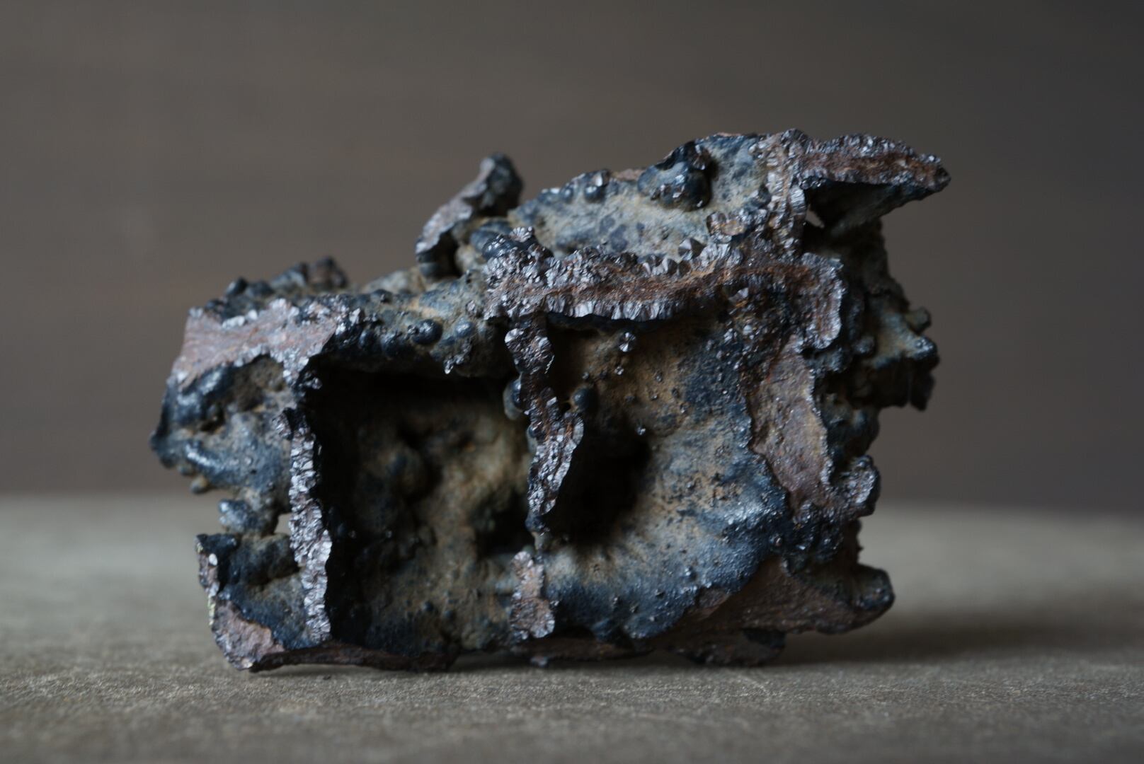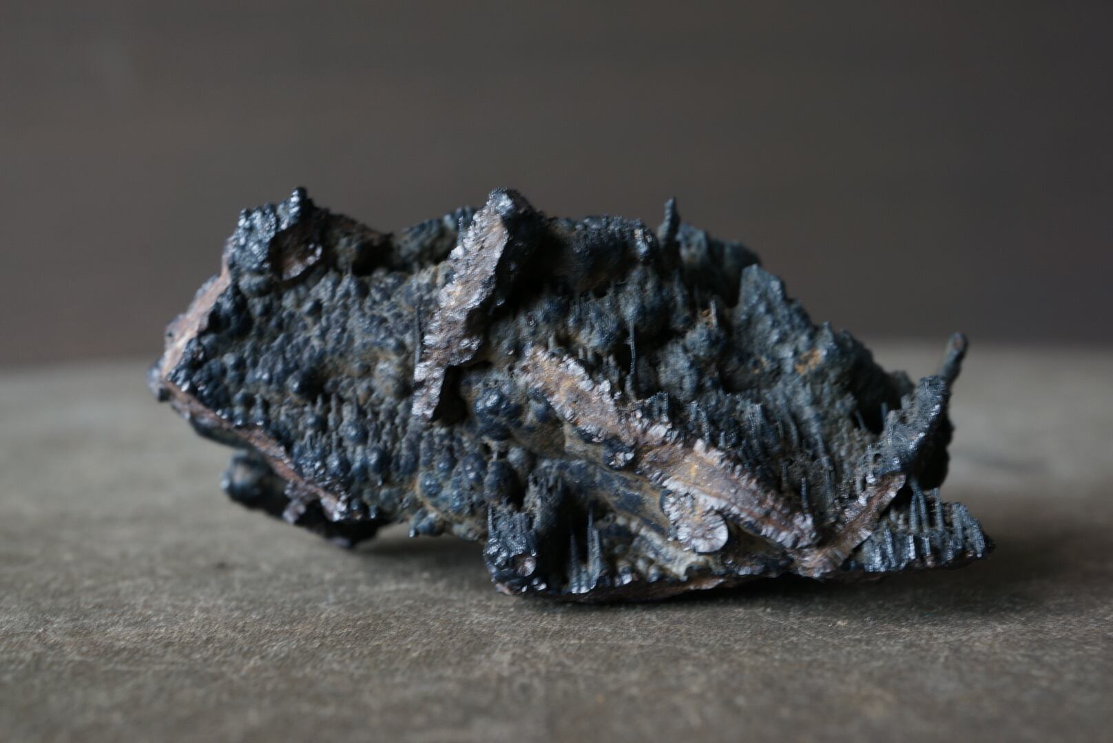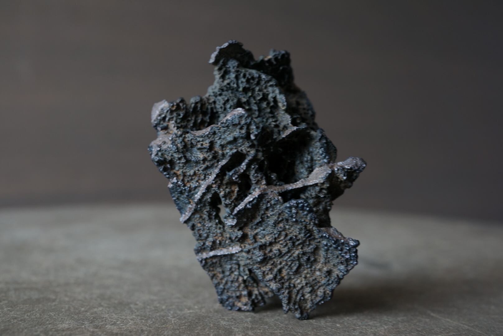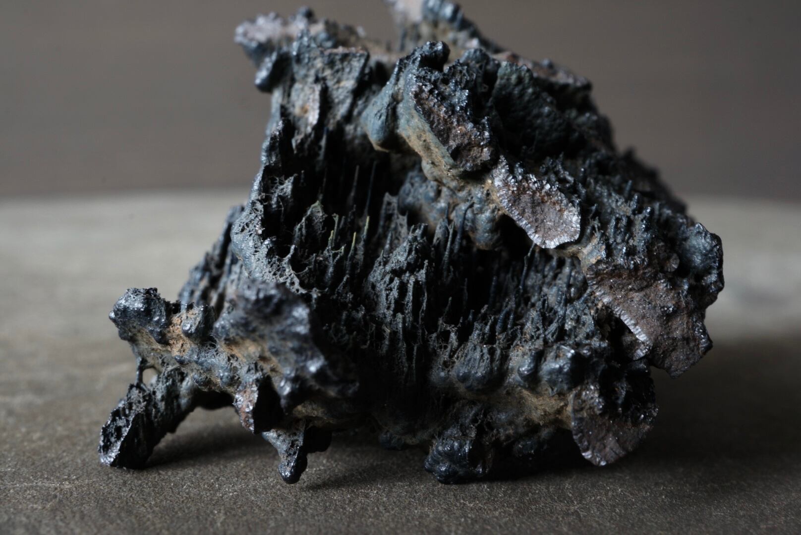 本石の内部には洞窟のような空隙が広がり、漆黒の針状結晶が密集する姿は鍾乳洞内部のダークな景観を想わせます。