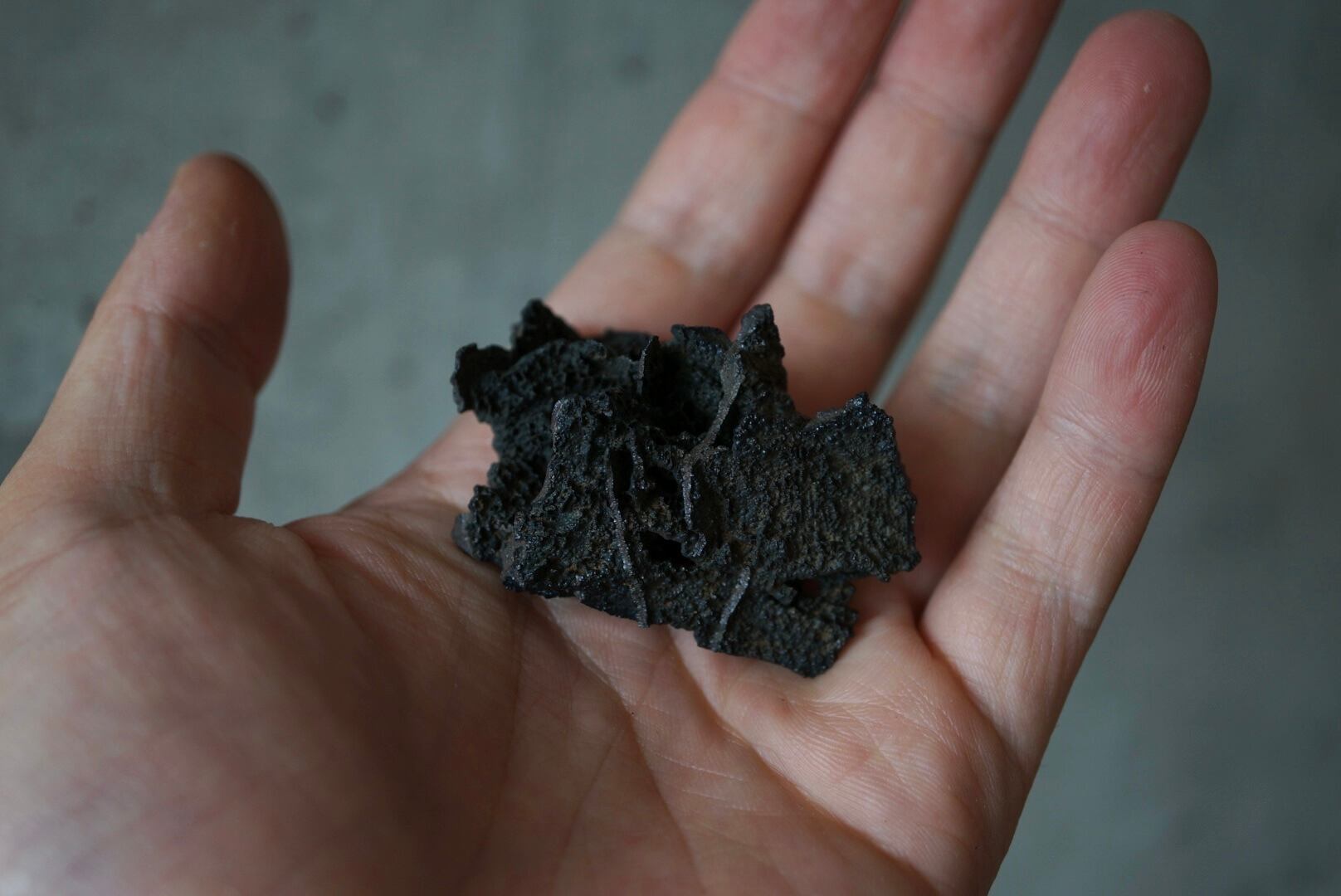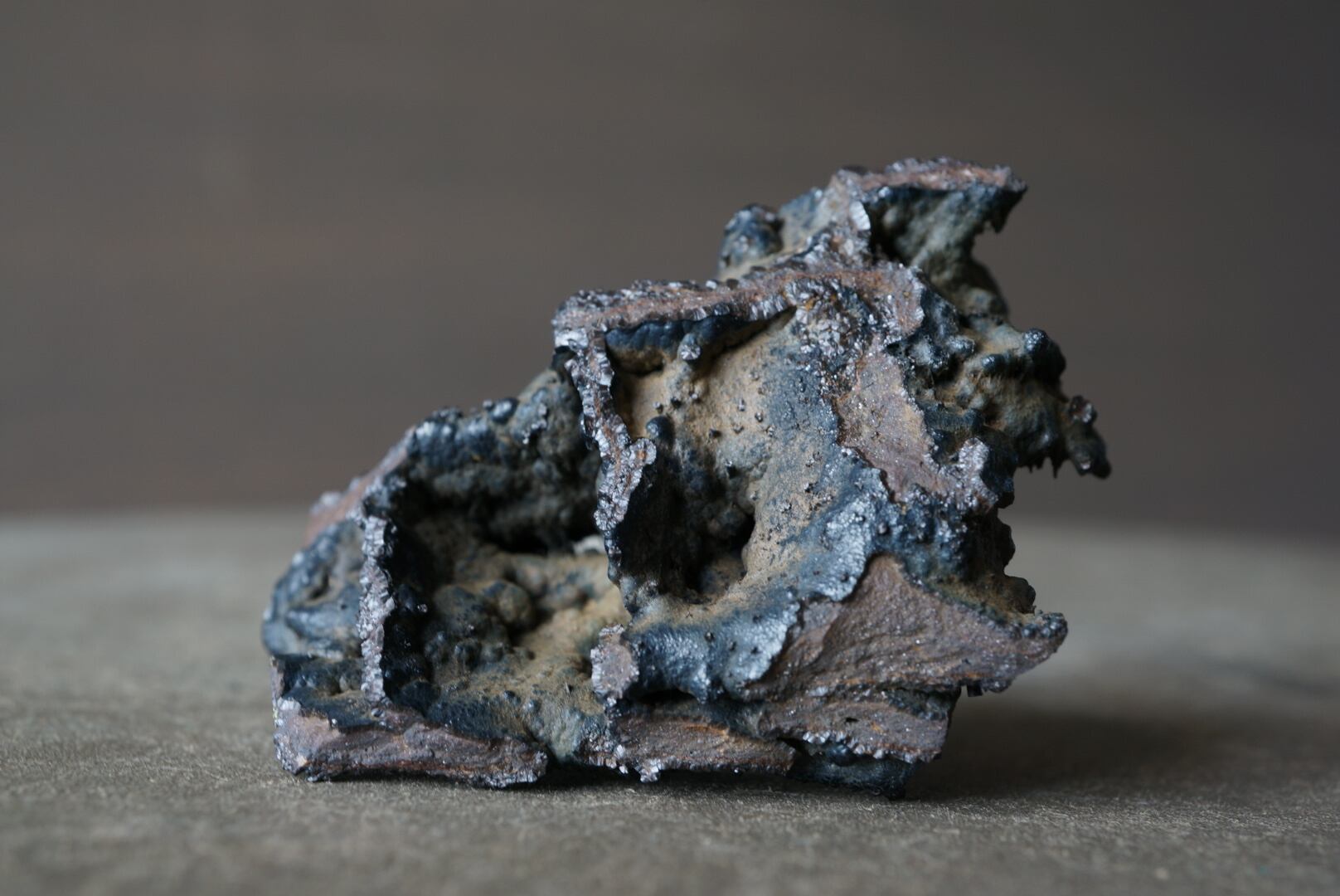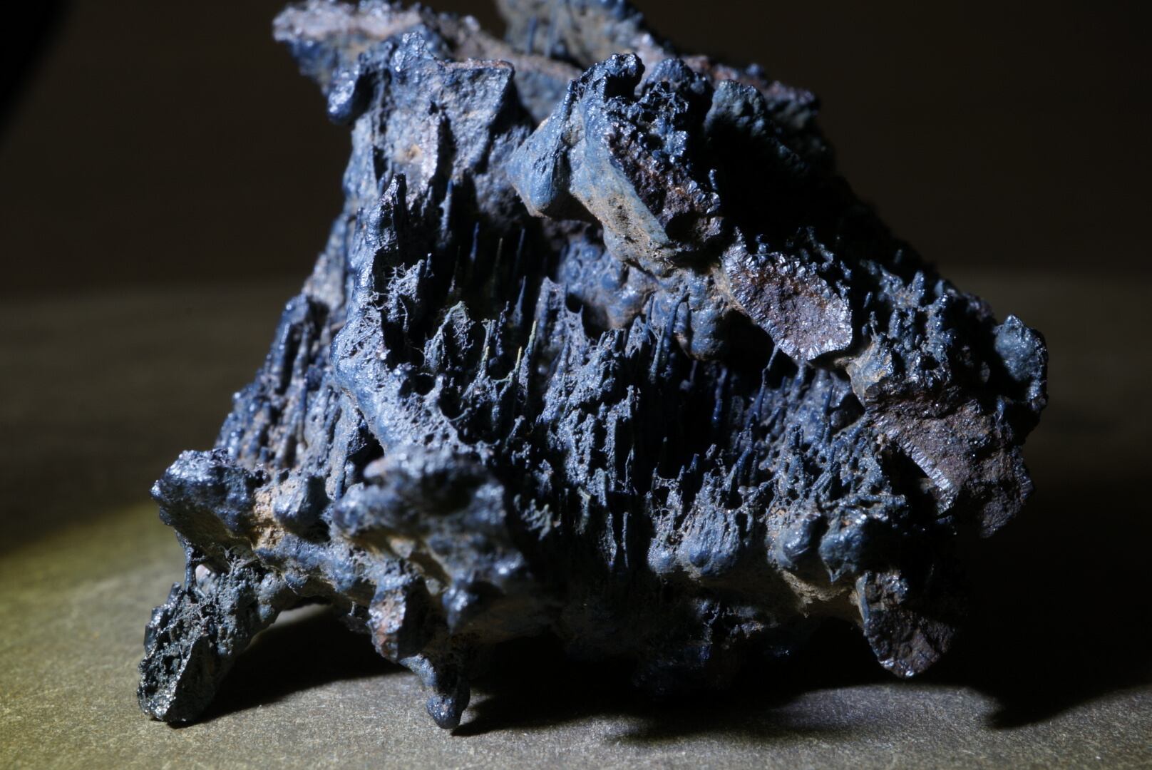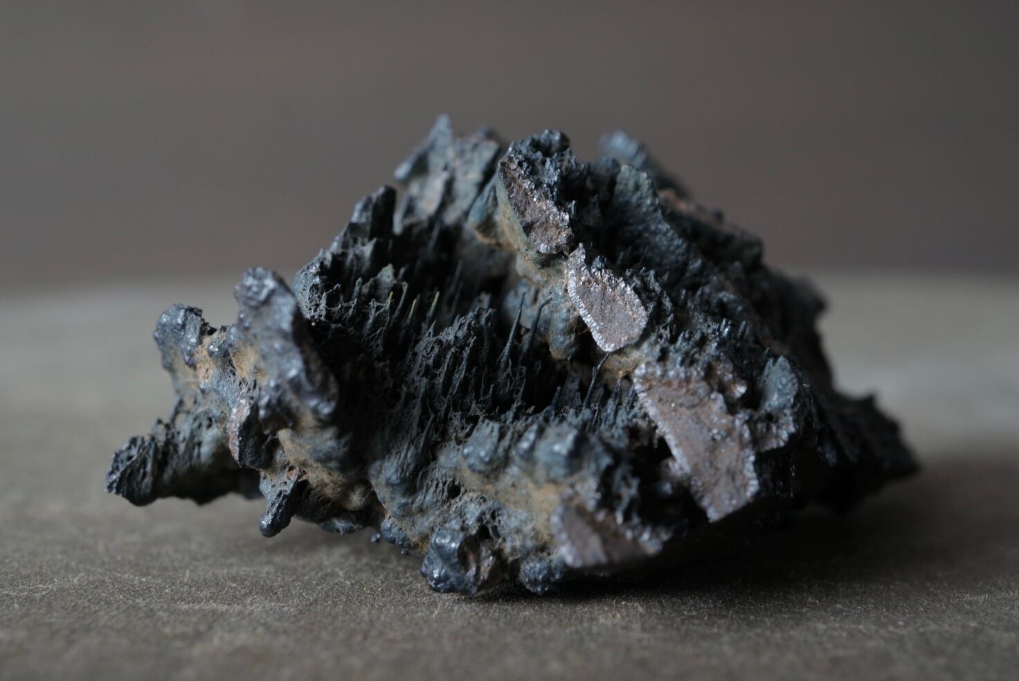 本石の内部には洞窟のような空隙が広がり、漆黒の針状結晶が密集する姿は鍾乳洞内部のダークな景観を想わせます。