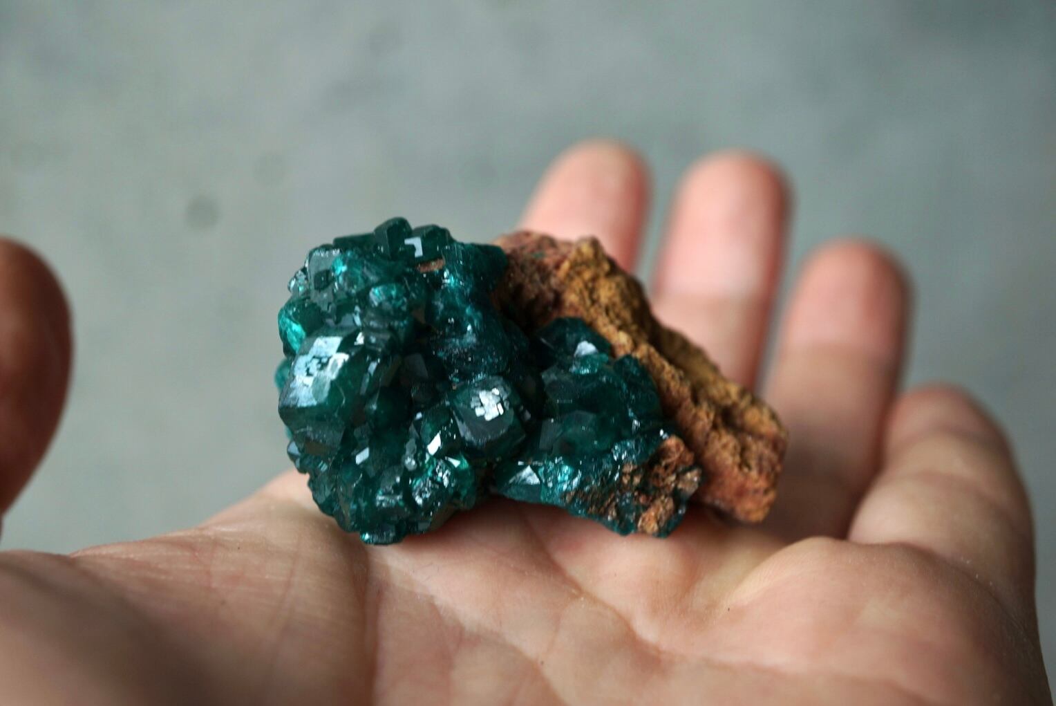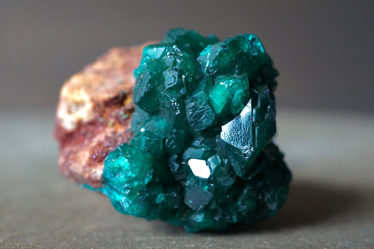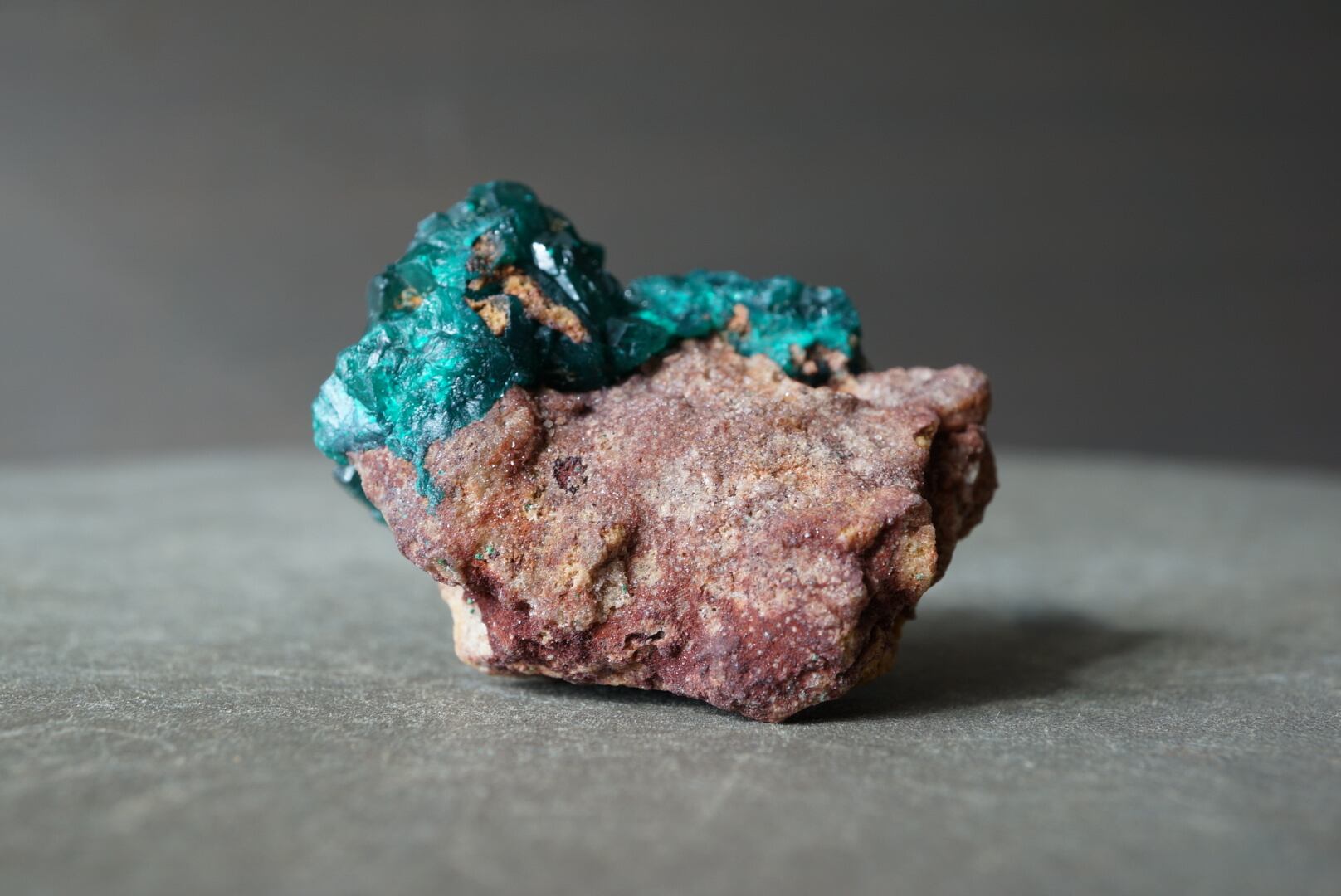 赤褐色の母岩に広がるキラキラとドゥルージーな輝きを下地に、端正で大ぶりなダイオプテーズ