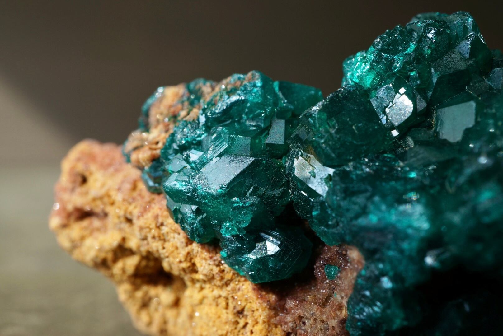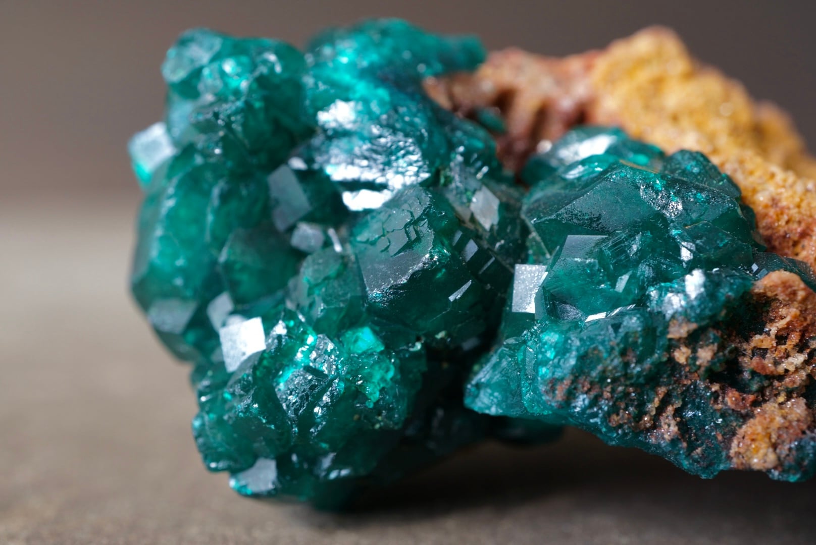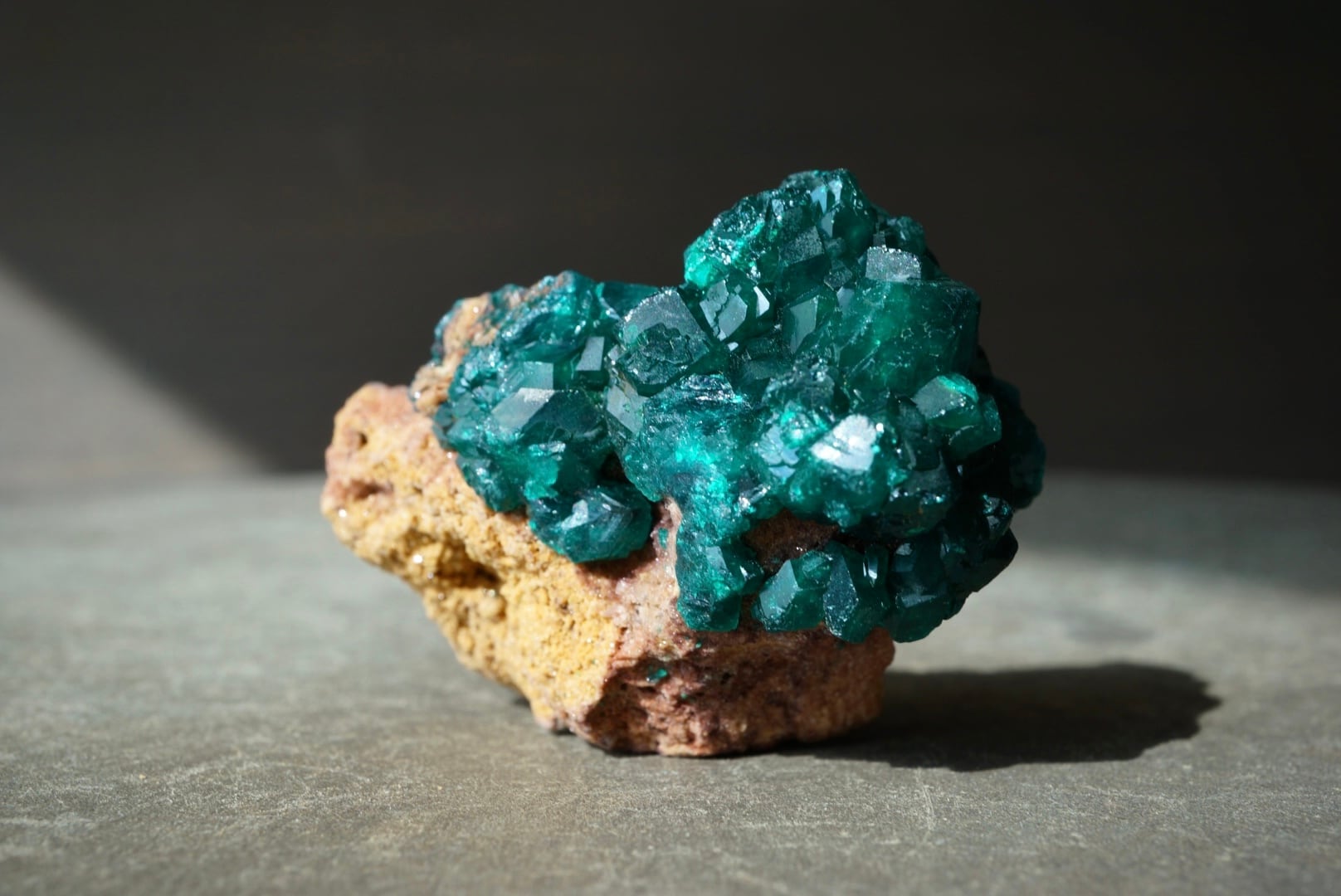 赤褐色の母岩に広がるキラキラとドゥルージーな輝きを下地に、端正で大ぶりなダイオプテーズ