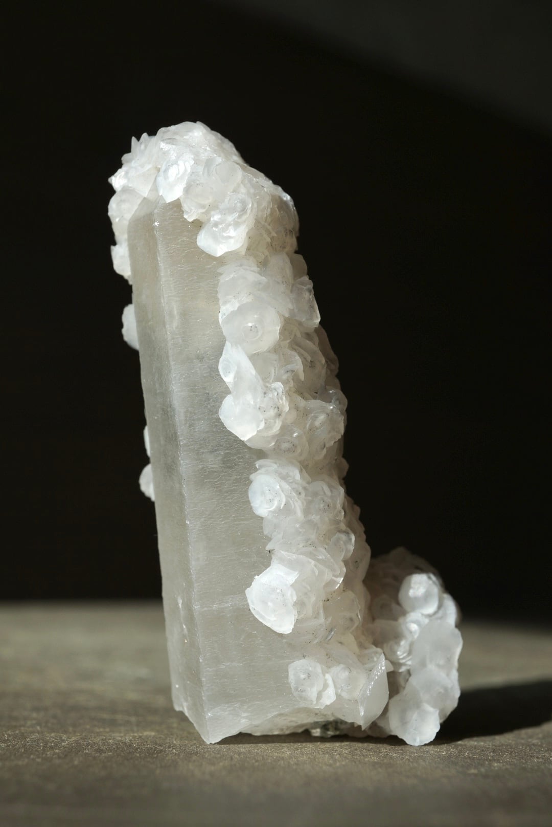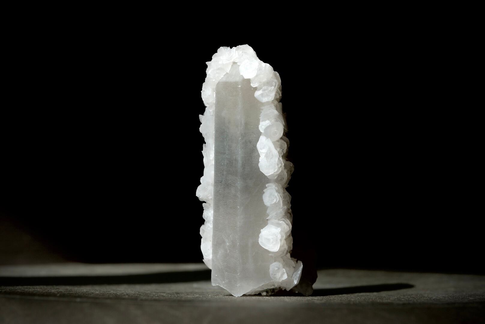 端正に立ち上がるクォーツを包み込むように、白いカルサイトが幾重にも咲き重なっています。