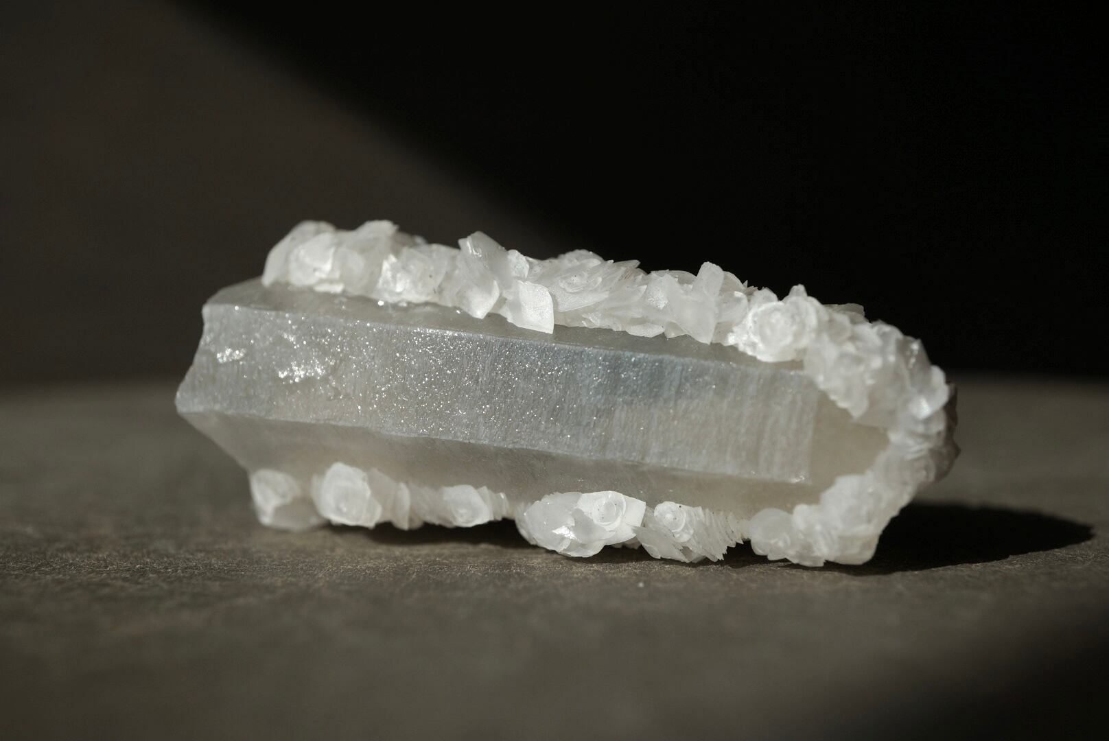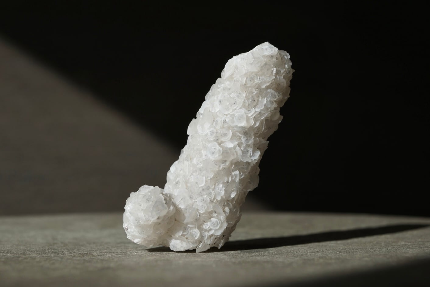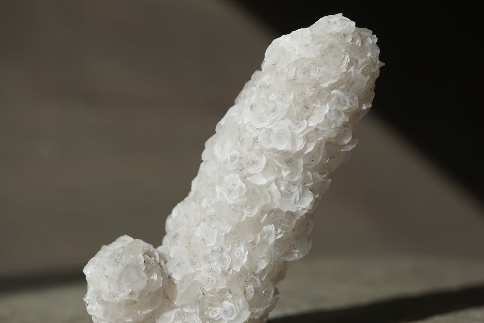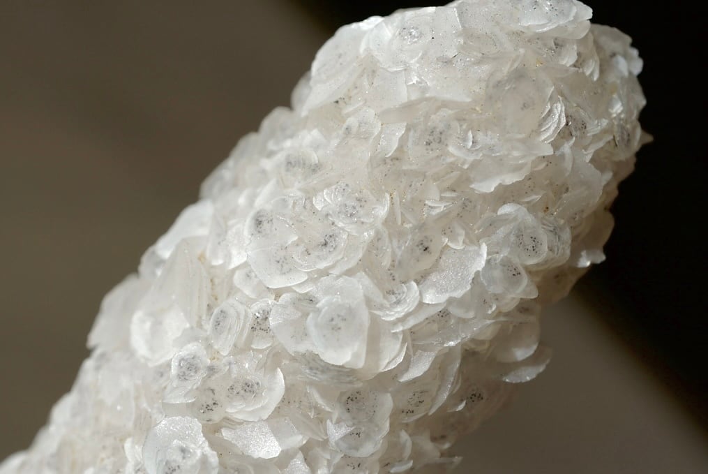 カルサイトは六方晶系の薄い板状結晶として成長し、その集合は白薔薇の群れを想わせる優美な姿を形作っています。