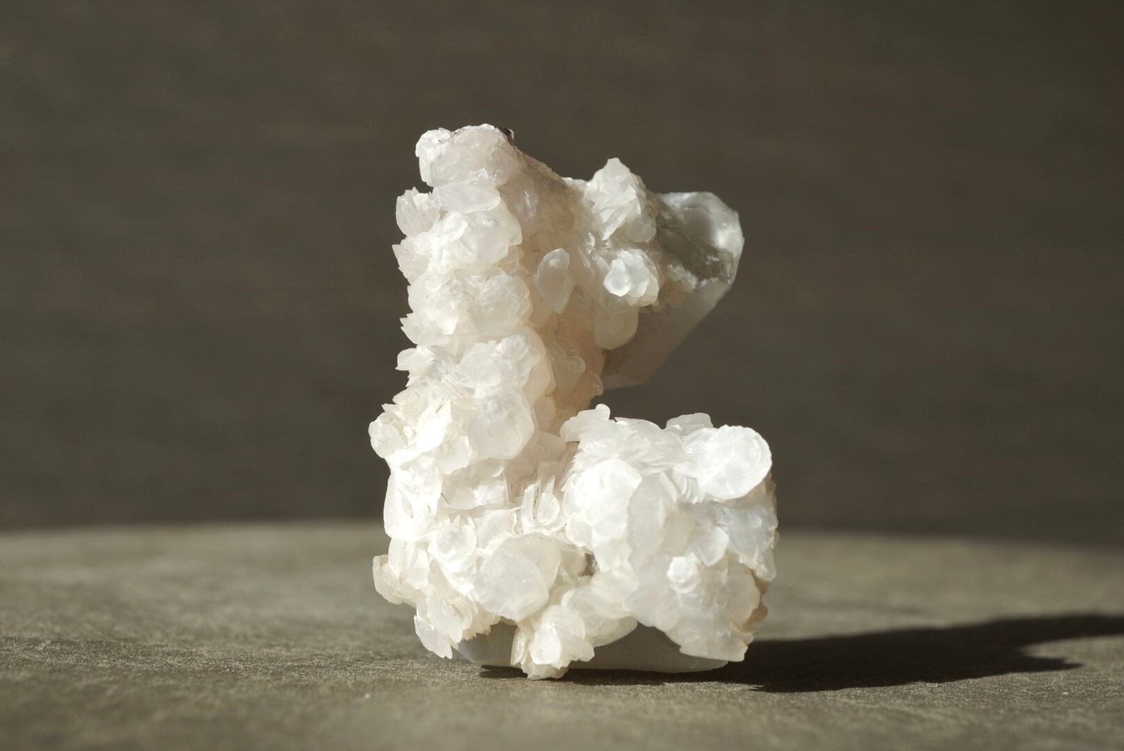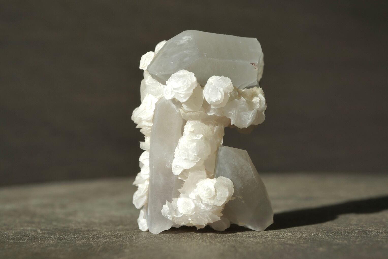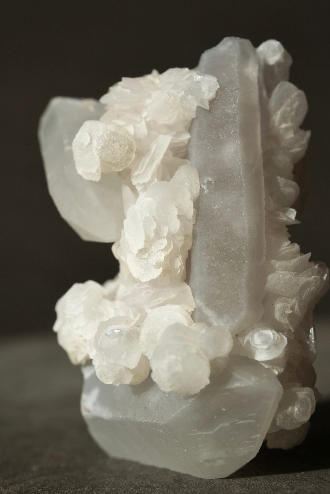 クォーツを包み込むように、白いカルサイトが幾重にも咲き重なっています。