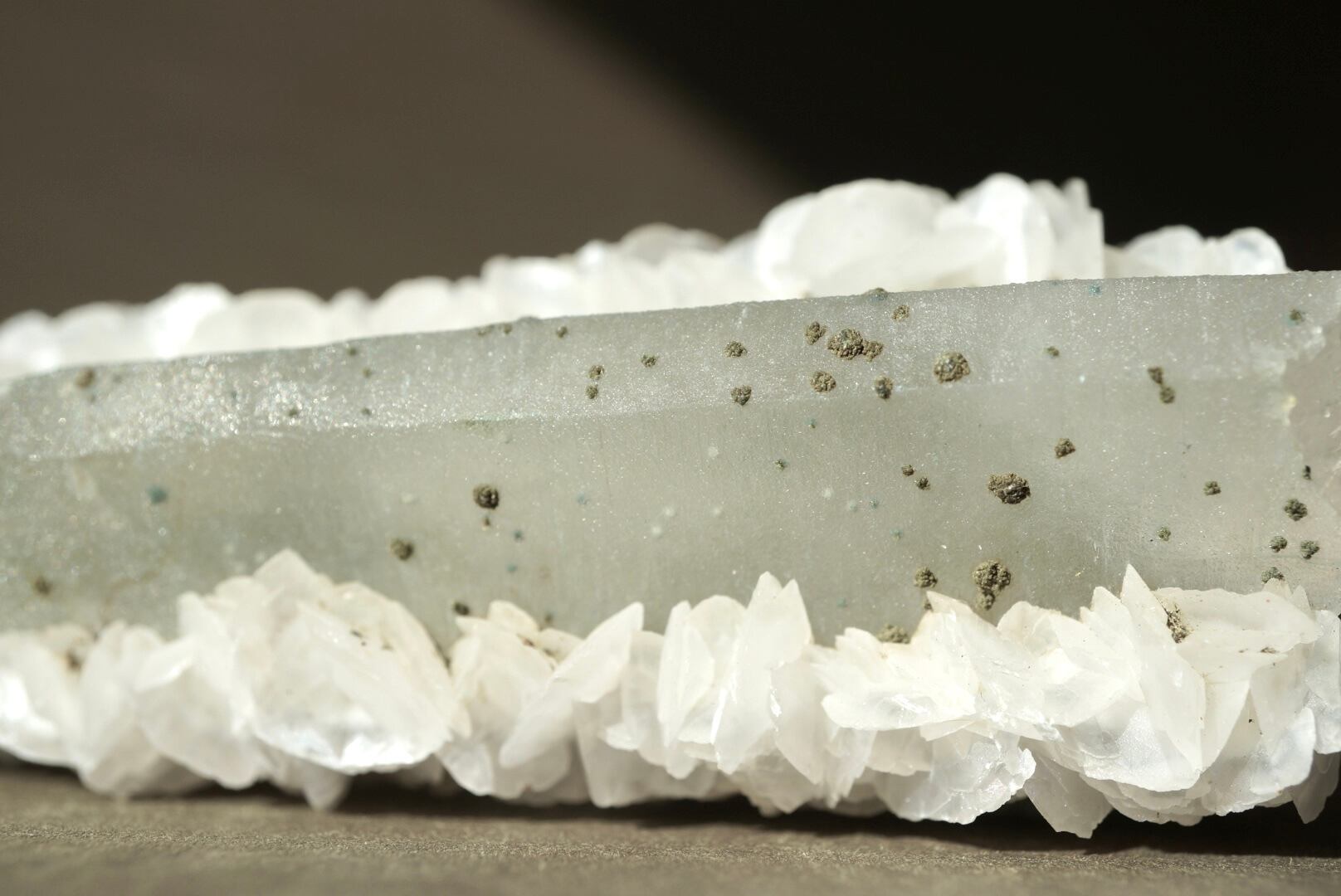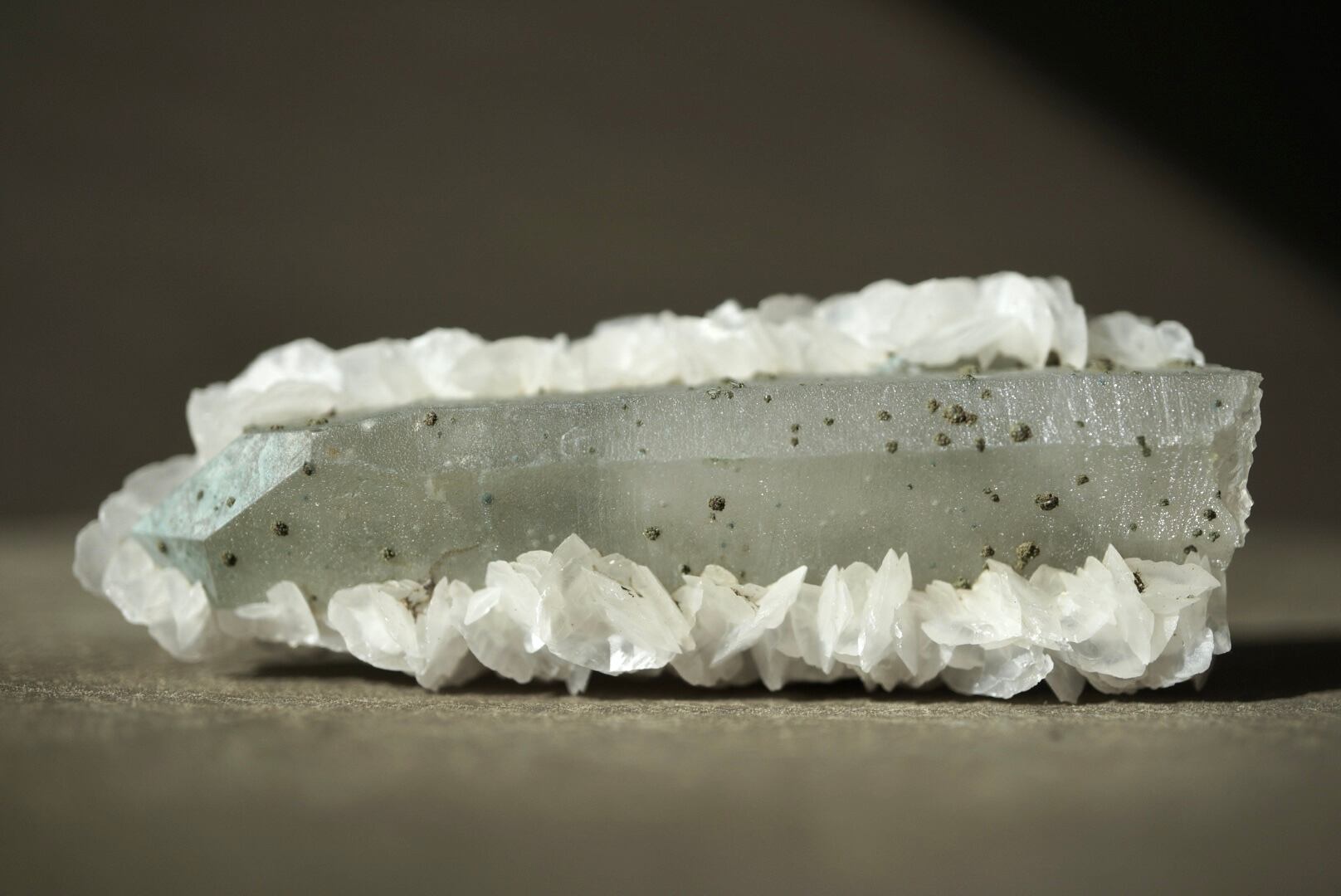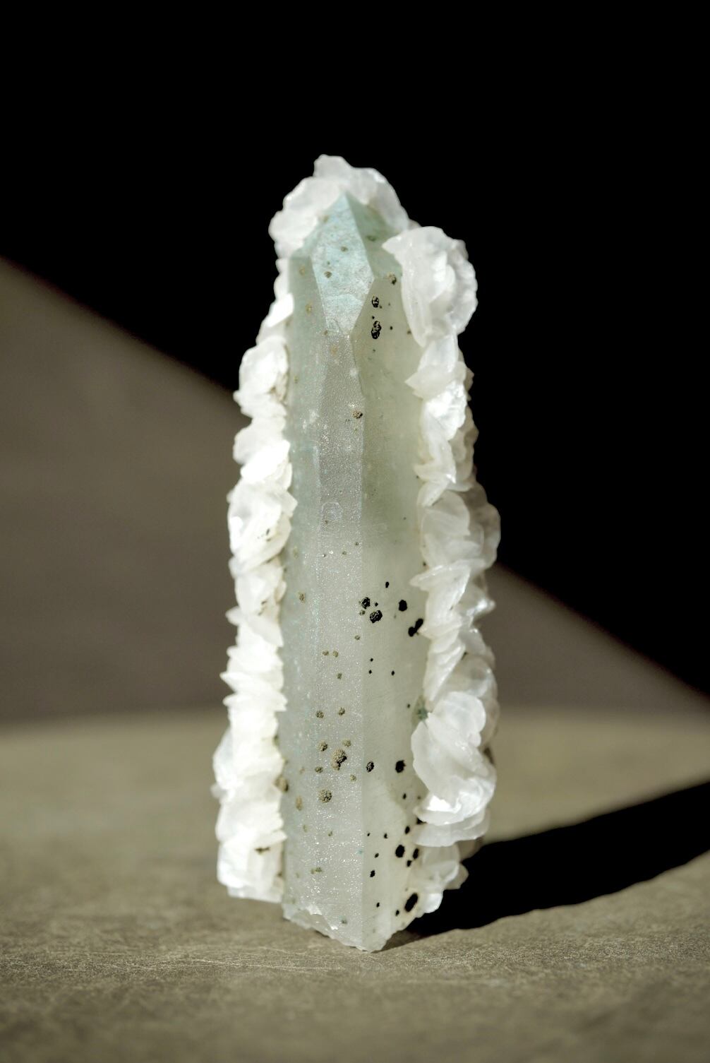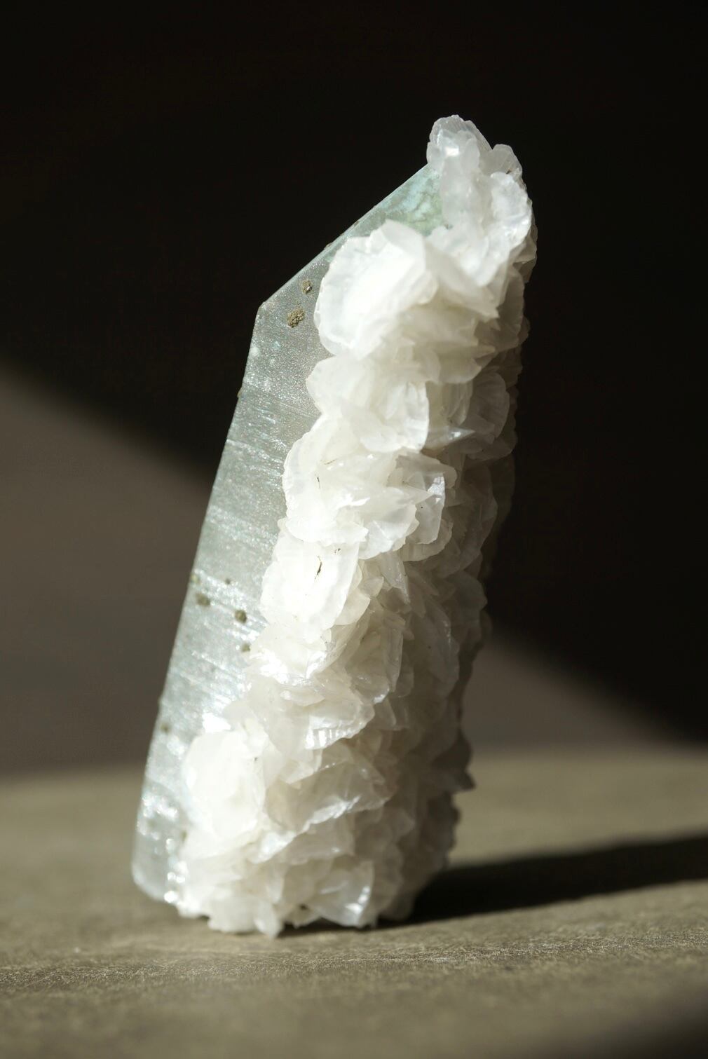 端正に立ち上がるクォーツを包み込むように、白いカルサイトが幾重にも咲き重なっています。