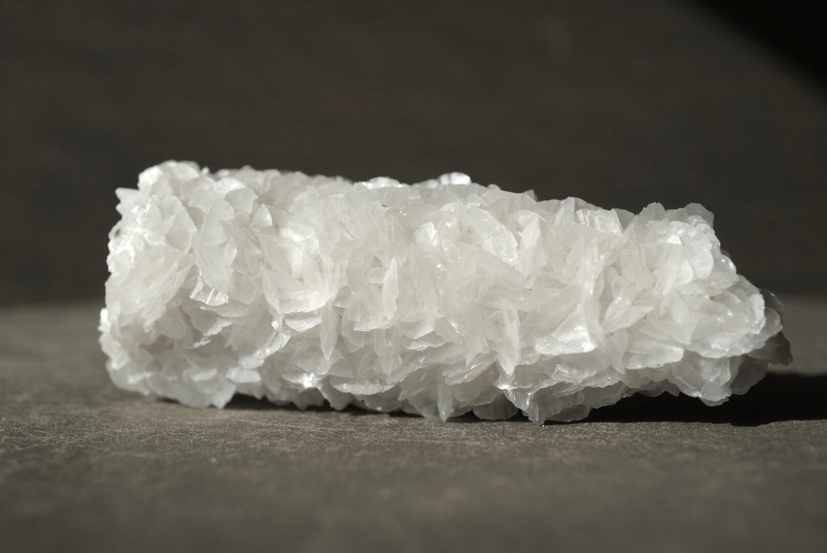 カルサイトは六方晶系の薄い板状結晶として成長し、その集合は白薔薇の群れを想わせる優美な姿を形作っています。
