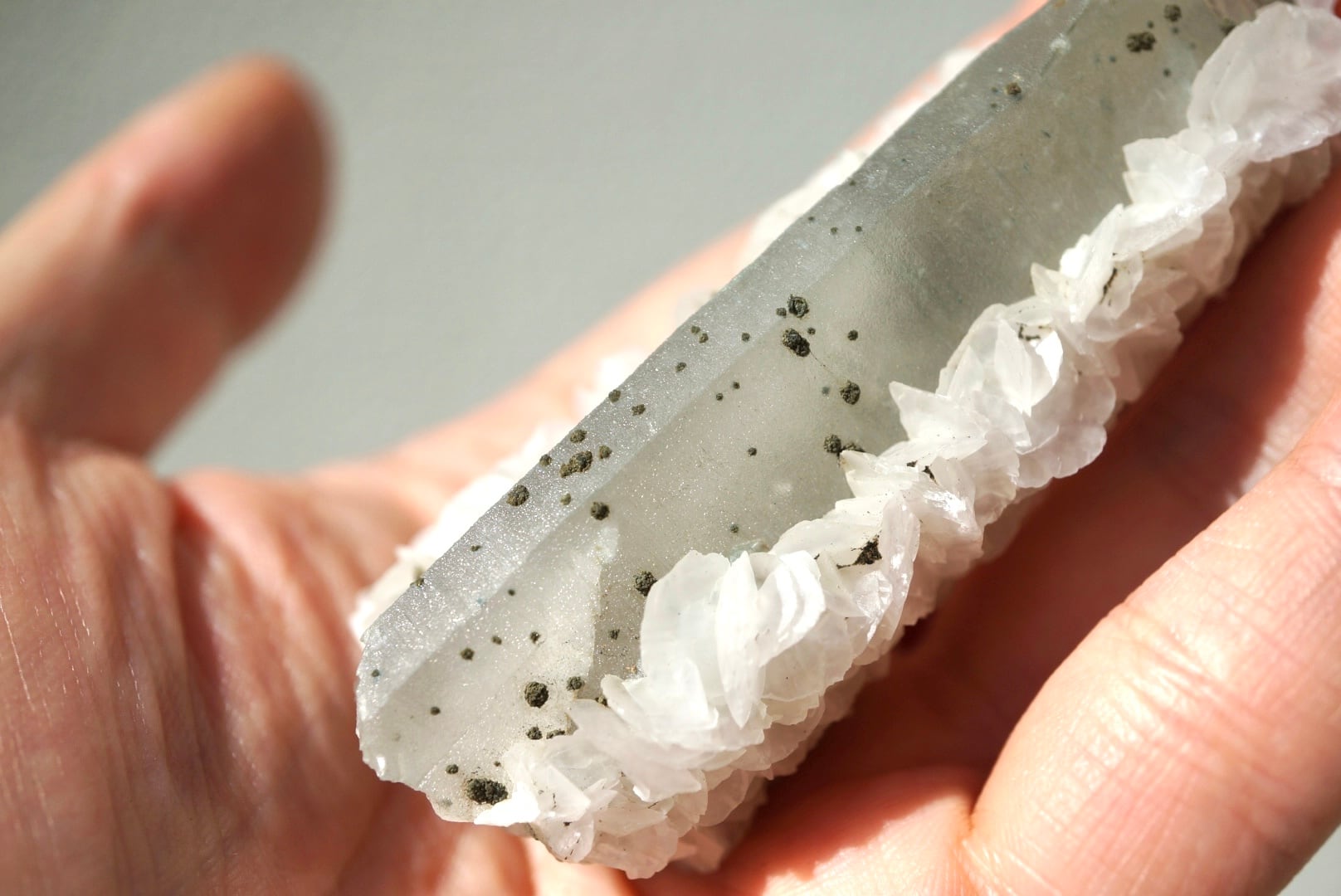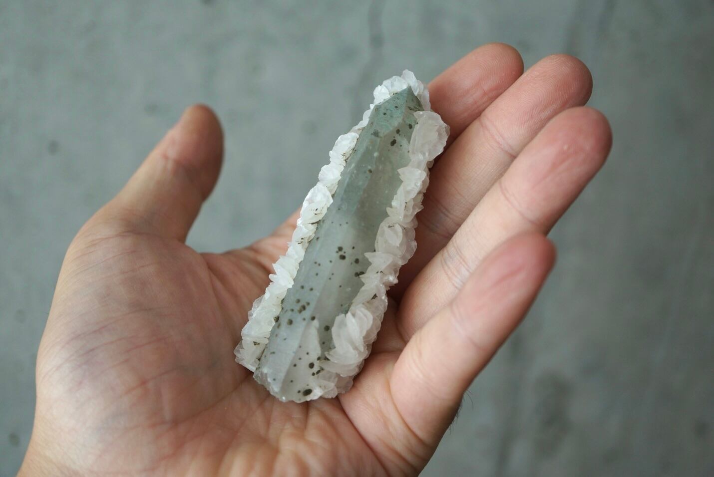 水晶表面と内部にはモスグリーンの球状クローライトが浮かび、本石をより愛らしく、特別なものにしています。