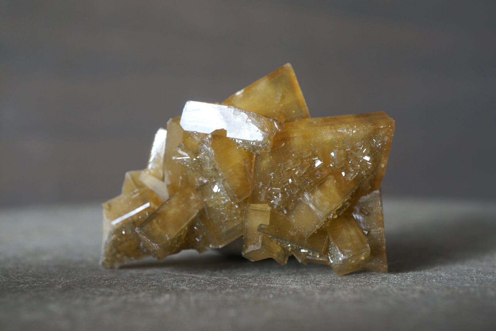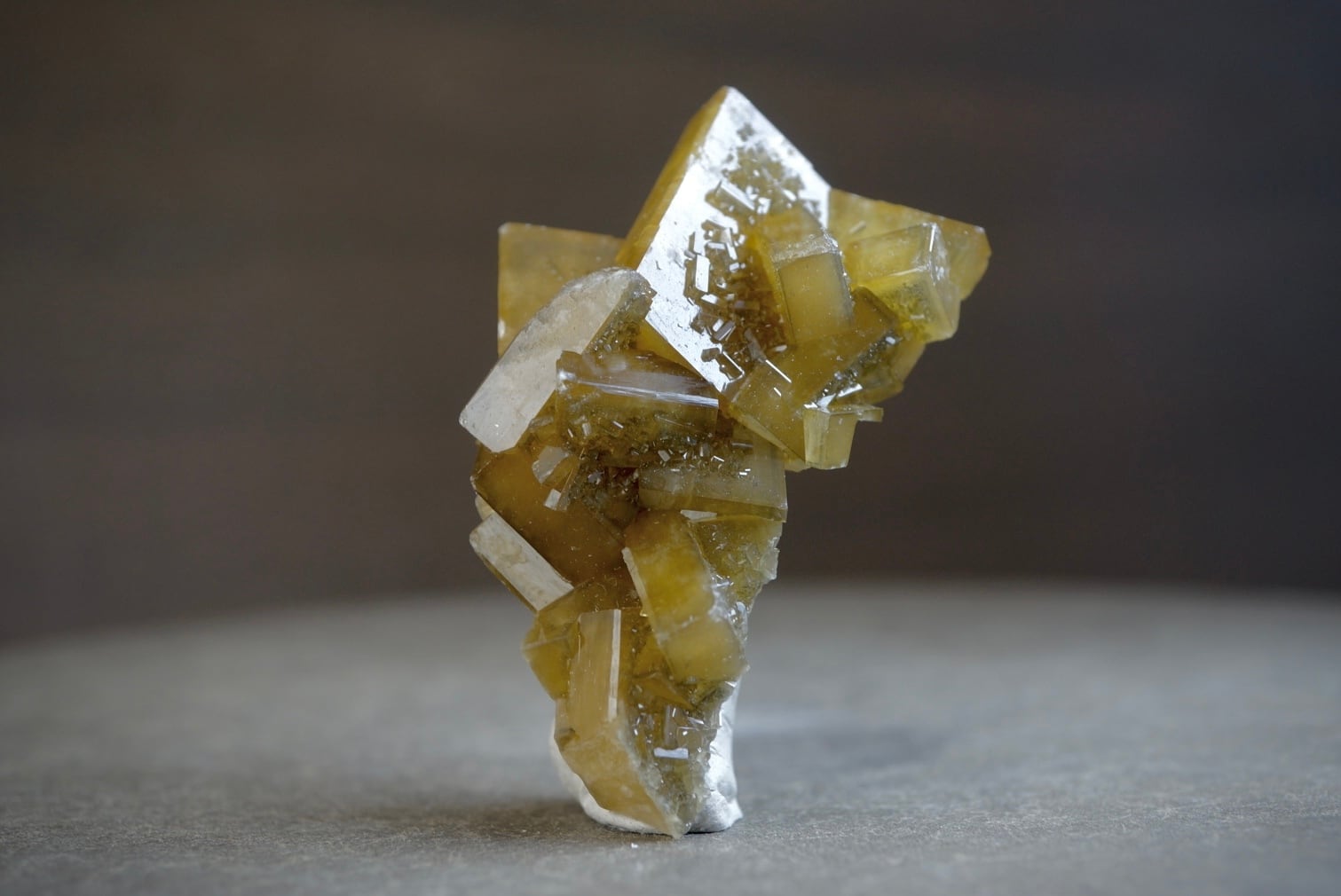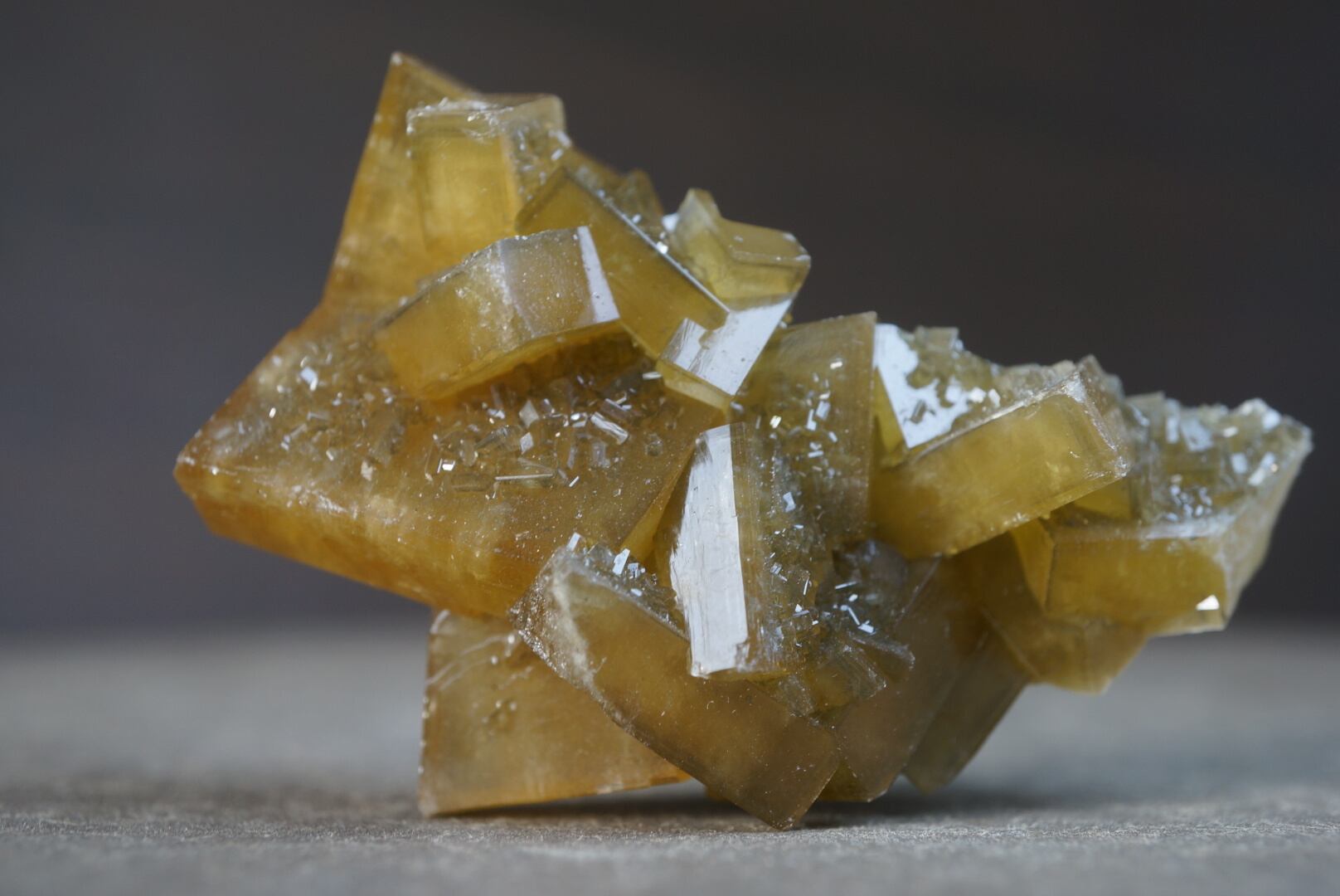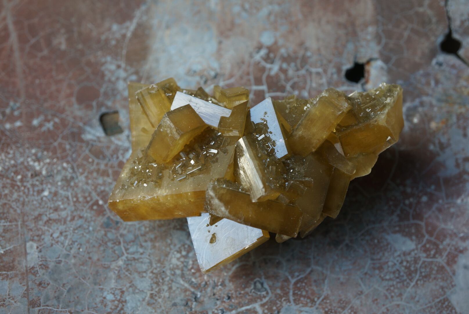 蜂蜜色~モスグリーンの結晶が幾何学的に重なり合い、明快な直線と面で構成されています。