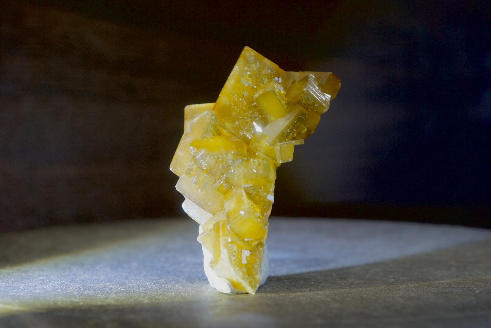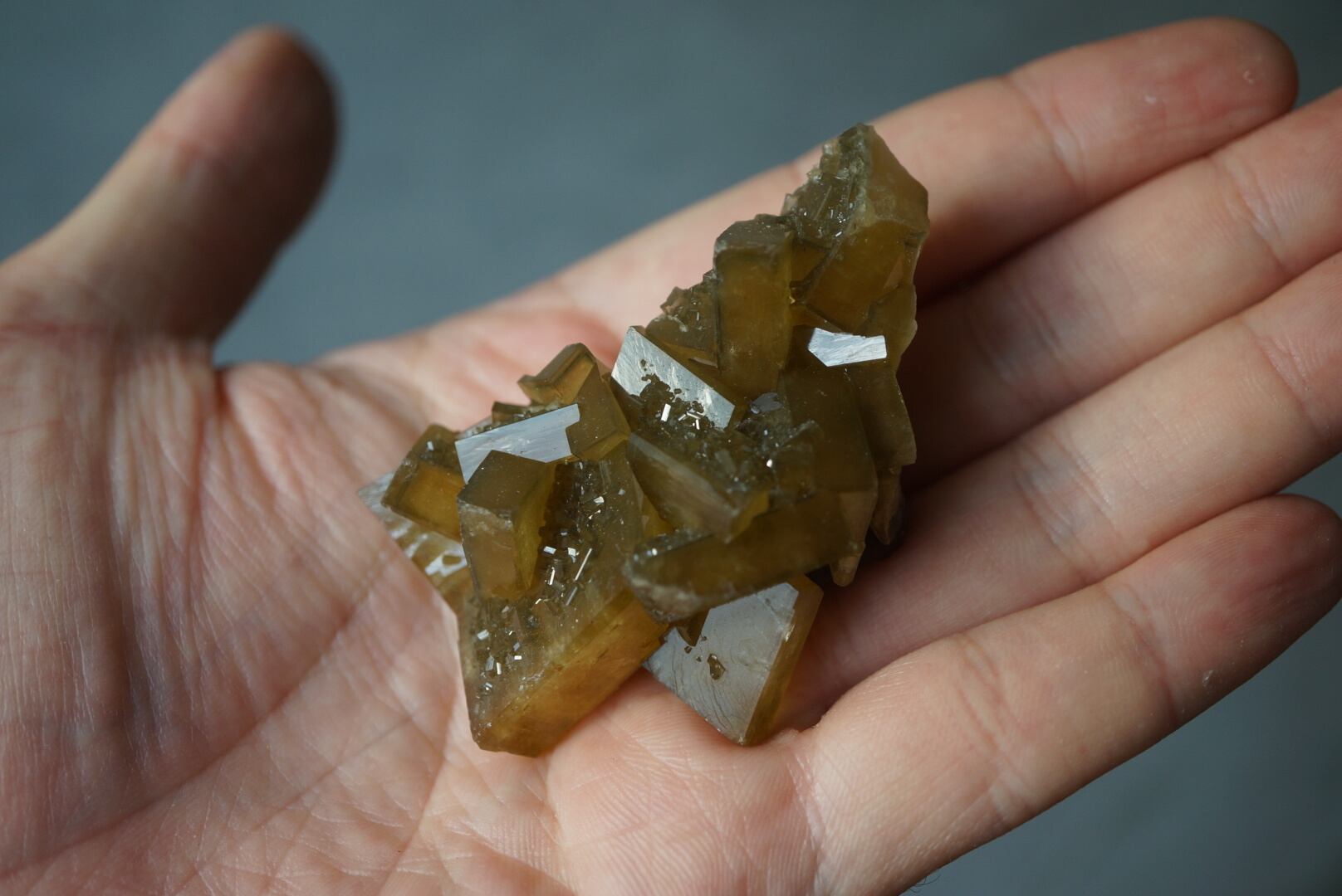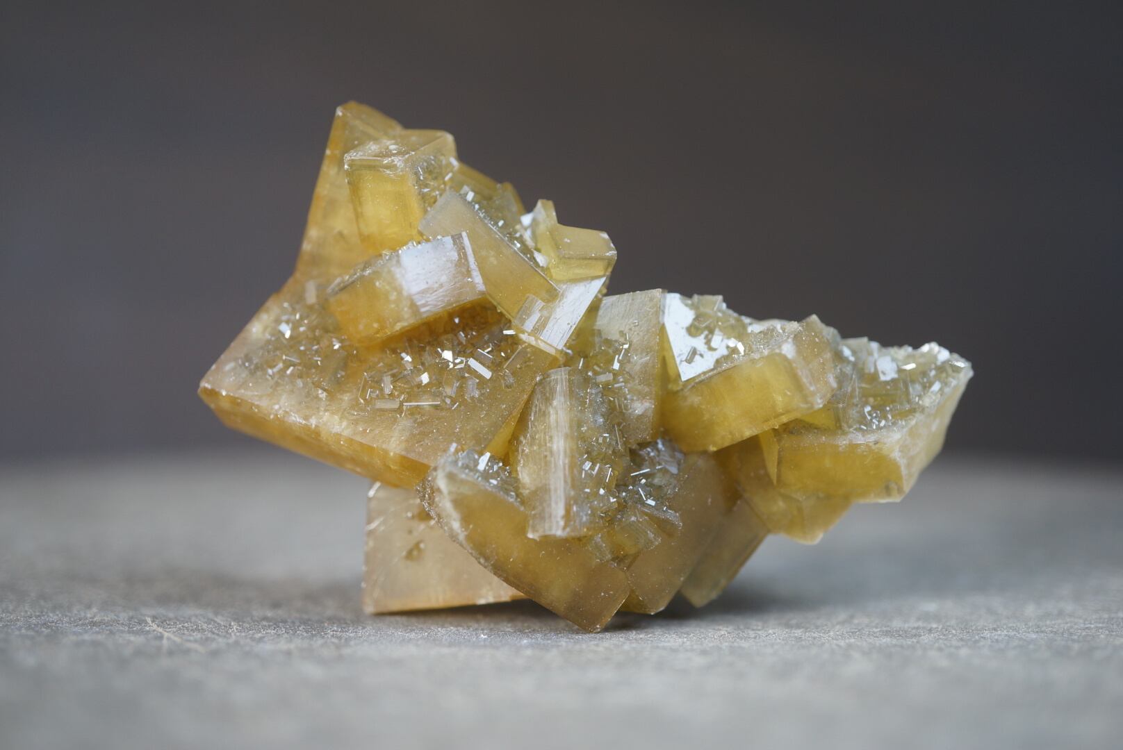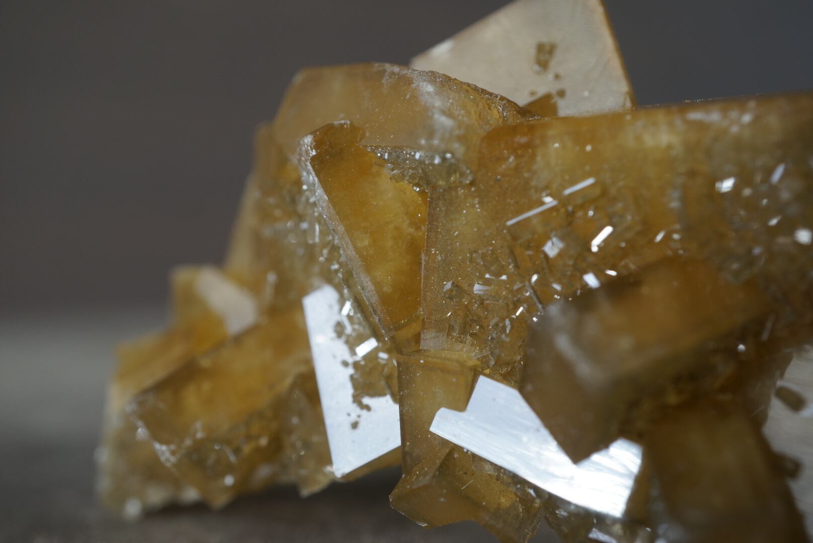 蜂蜜色~モスグリーンの結晶が幾何学的に重なり合い、明快な直線と面で構成されています。
