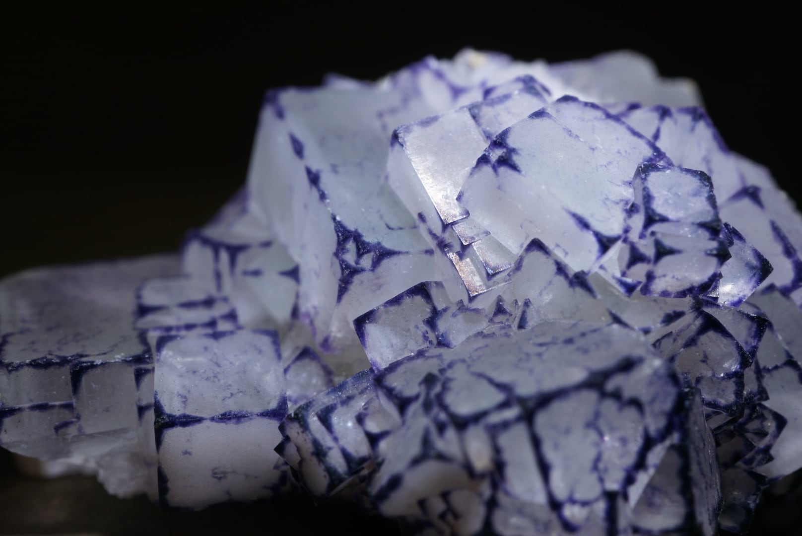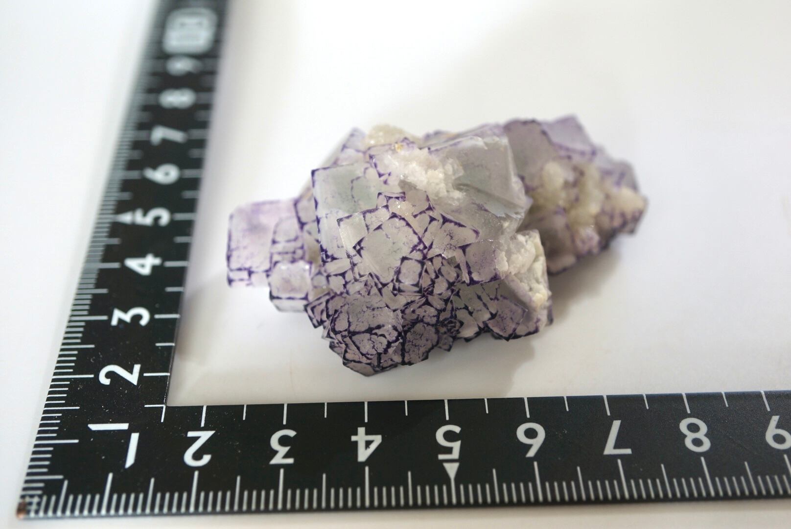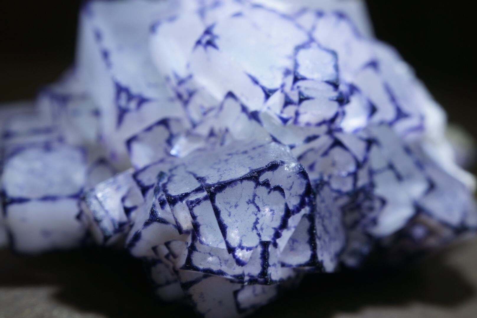 透明感のある淡青色の立方体結晶に紫のエッジがくっきりと浮かび上がっています。