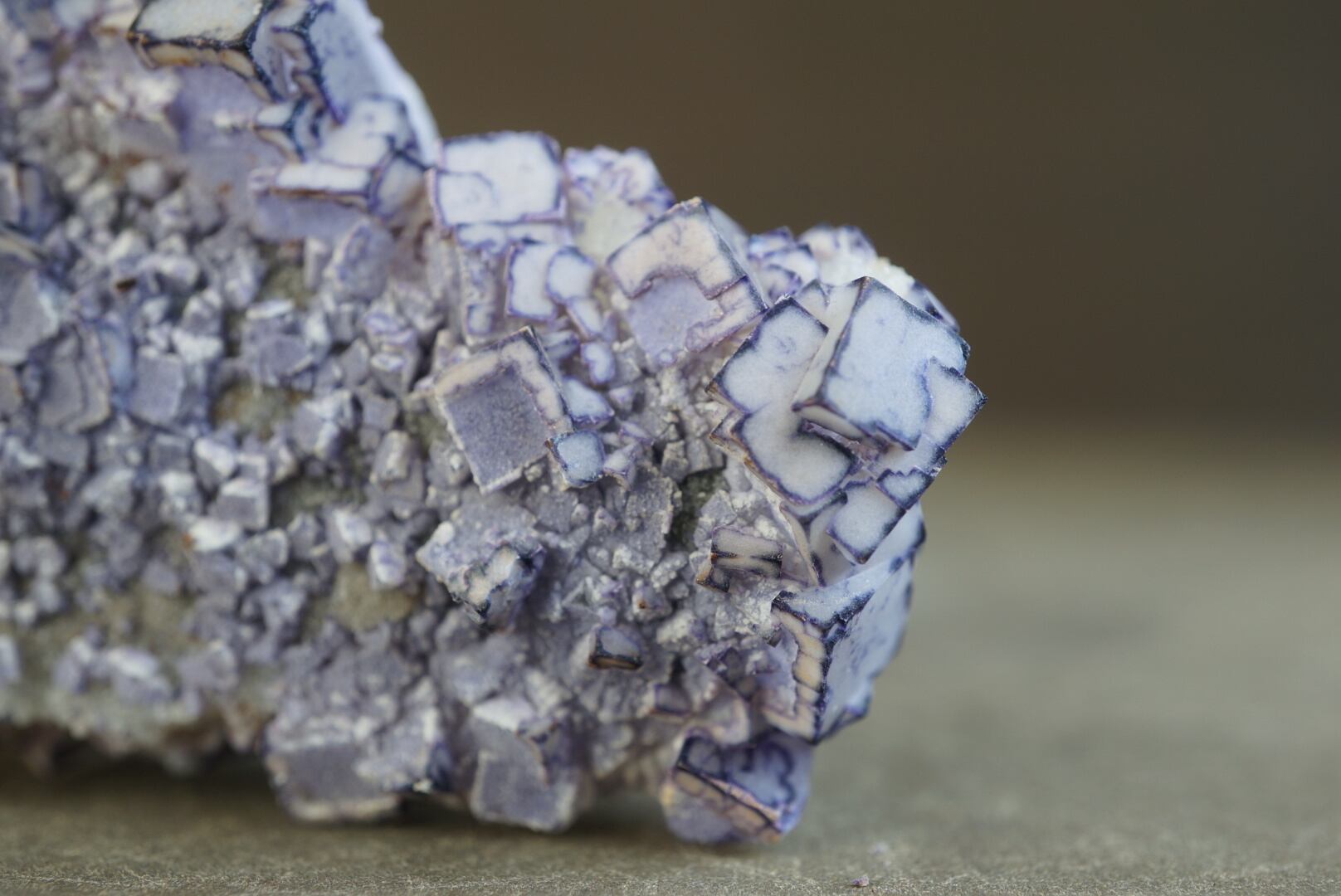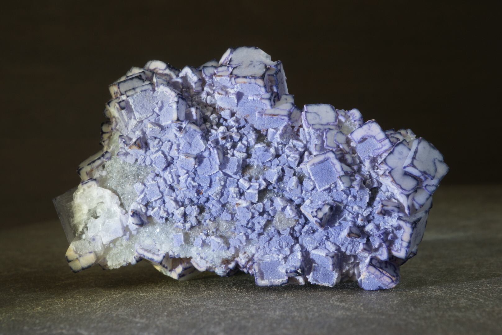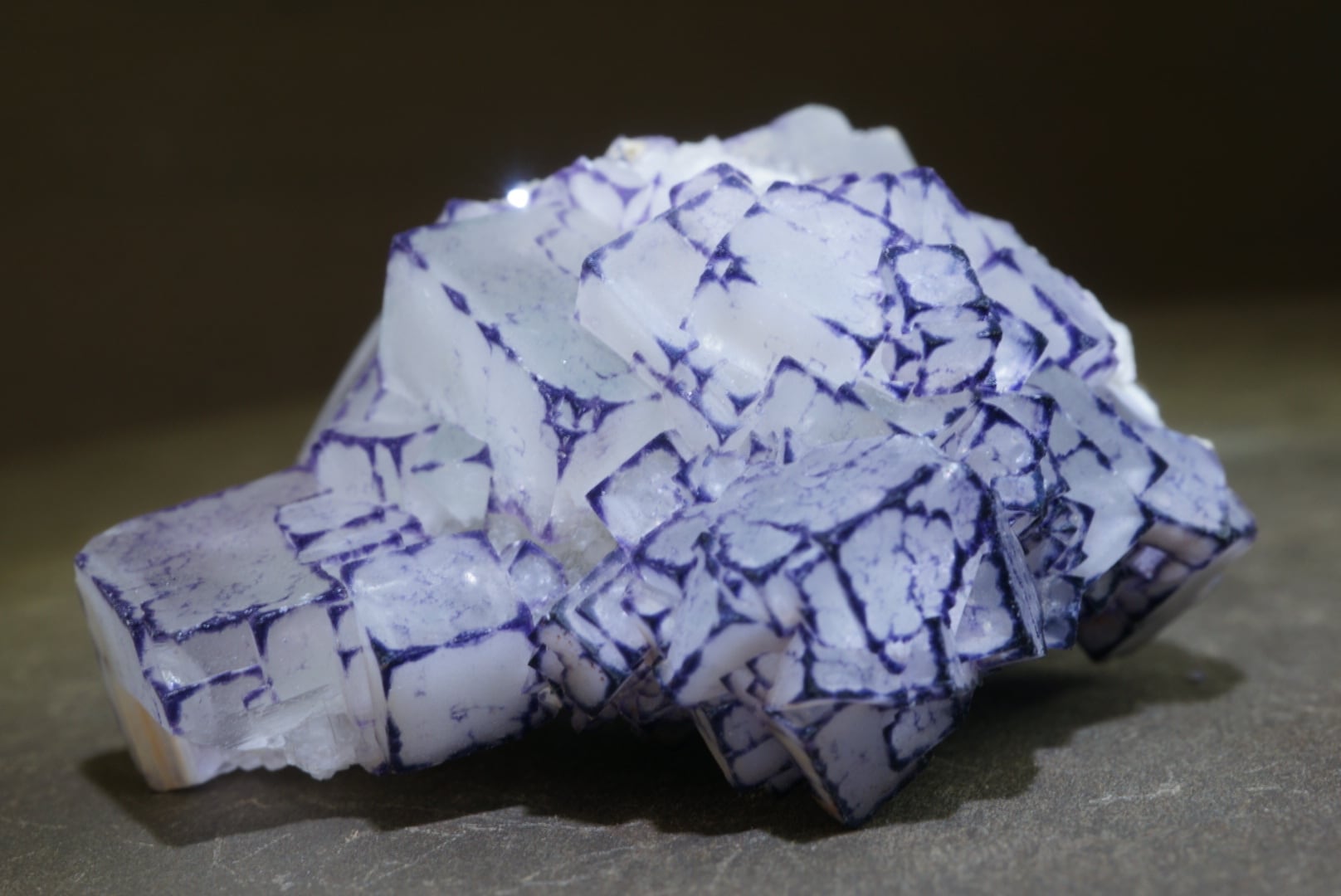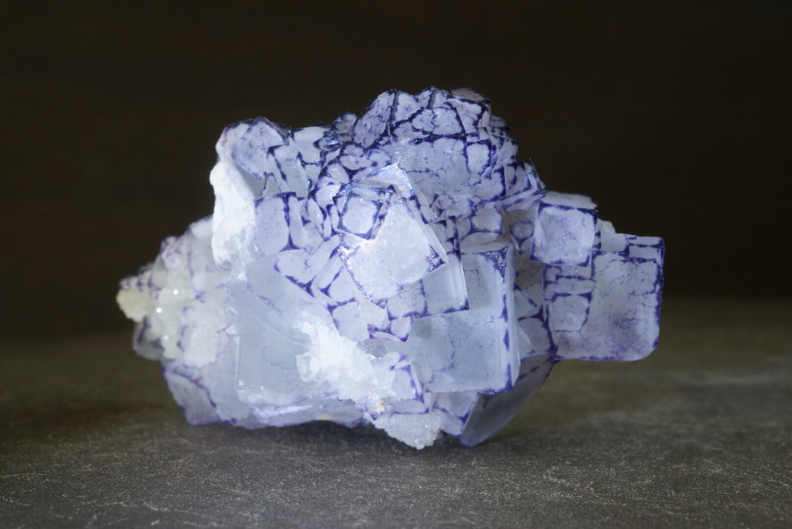 透明感のある淡青色の立方体結晶に紫のエッジがくっきりと浮かび上がっています。