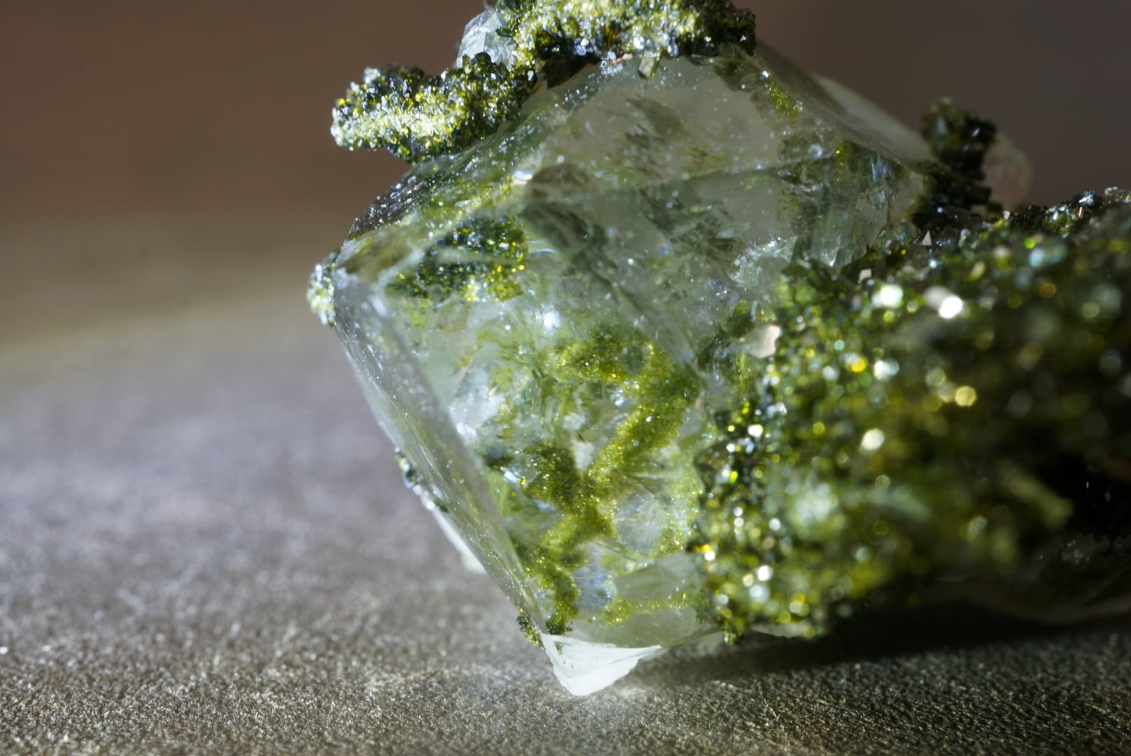 エピドート(緑簾石)は、主に変成岩や熱水鉱脈中に生成するケイ酸塩鉱物で、緑色の結晶を特徴とします。