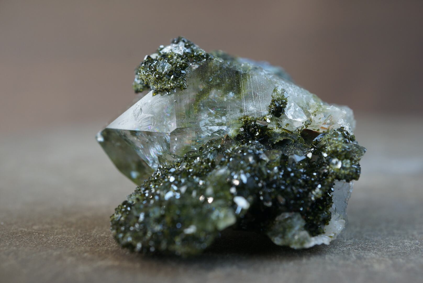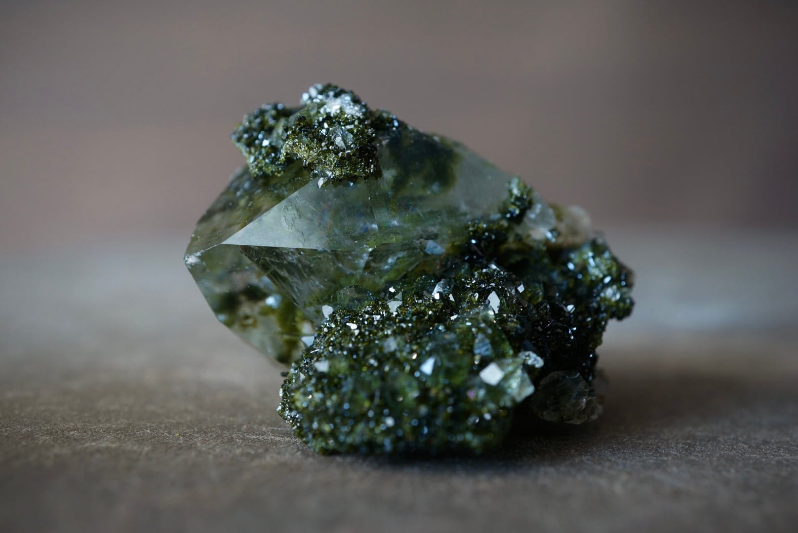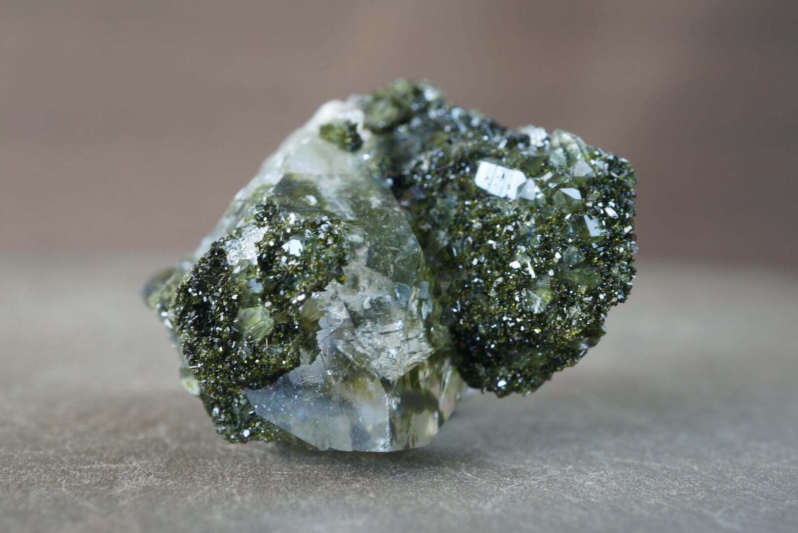 抹茶のような深い緑色のエピドートがクォーツ結晶と混ざり合い、きらびやかな光沢を放っています。
