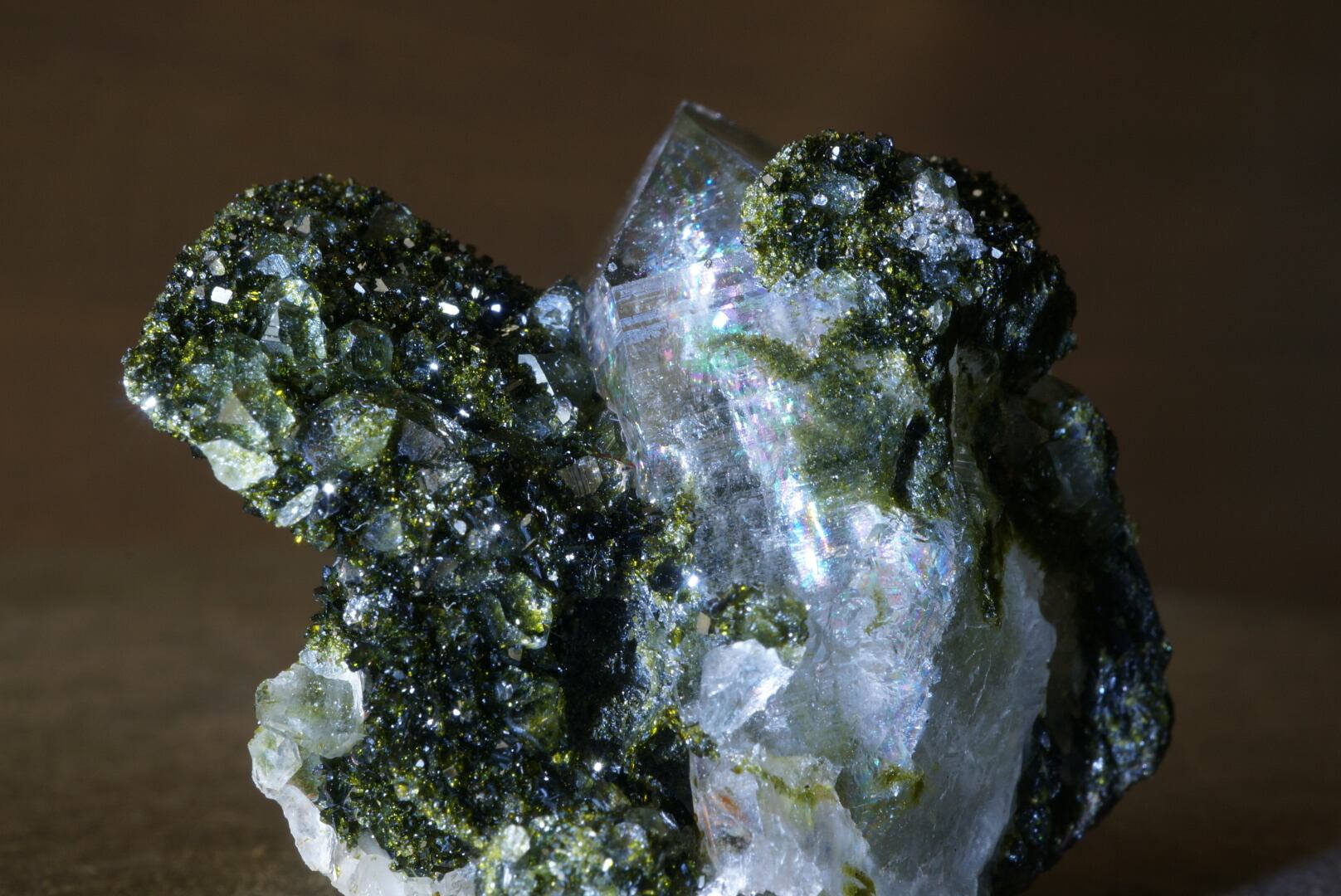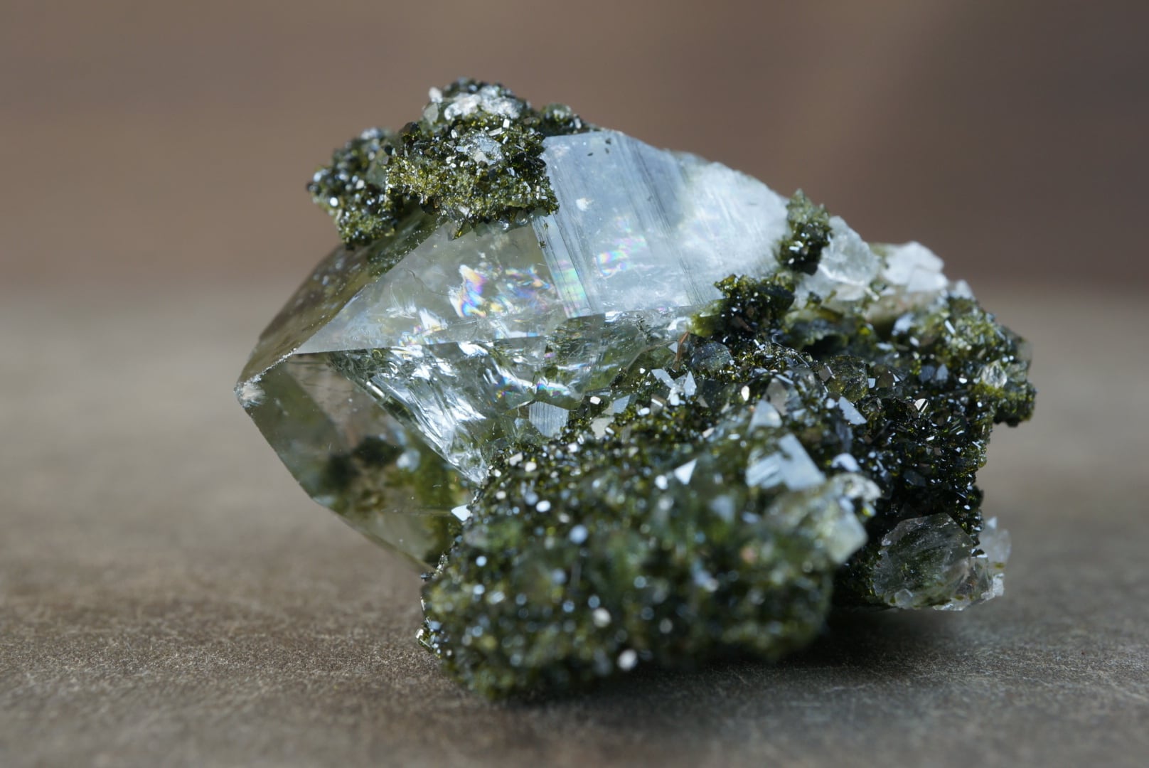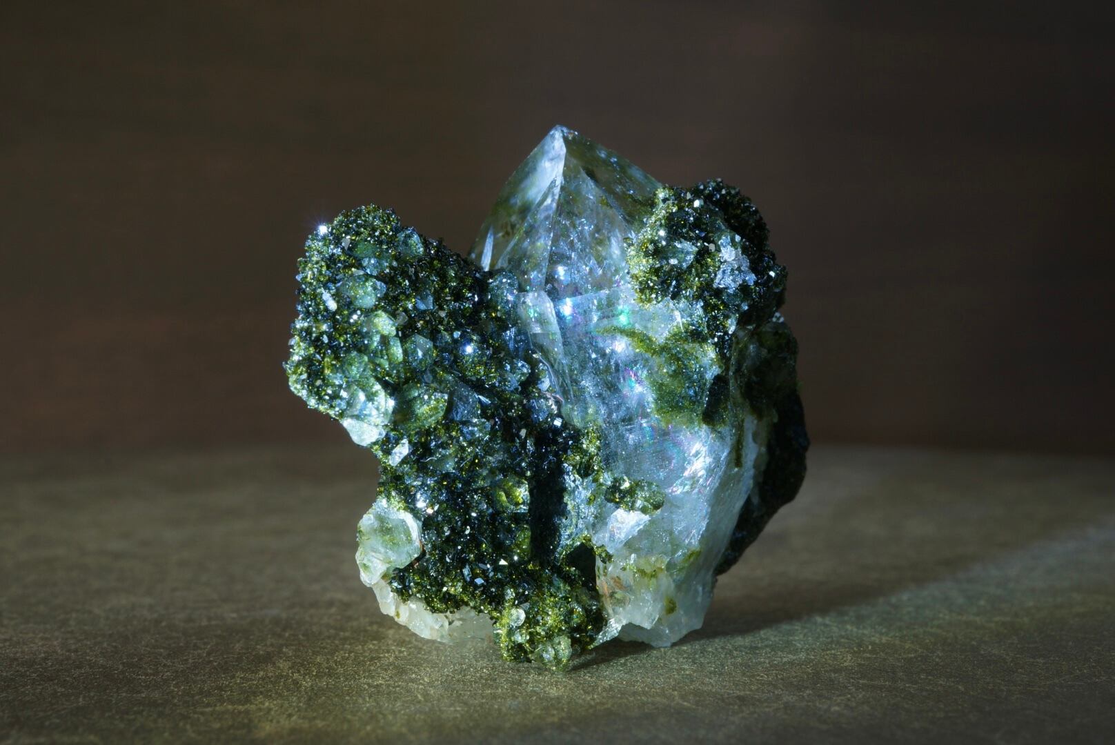 抹茶のような深い緑色のエピドートがクォーツ結晶と混ざり合い、きらびやかな光沢を放っています。
