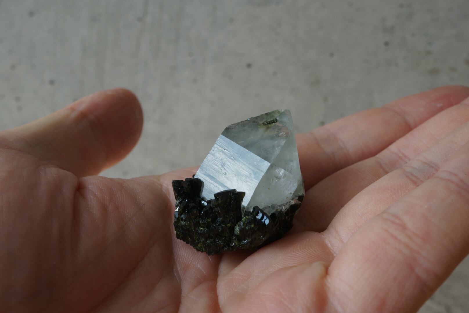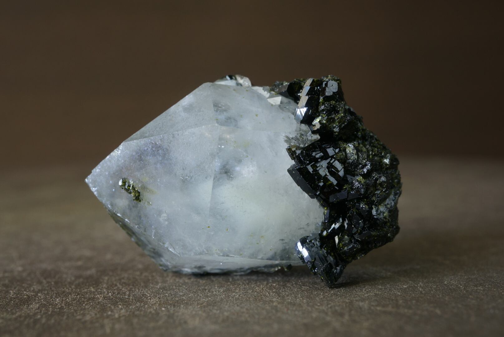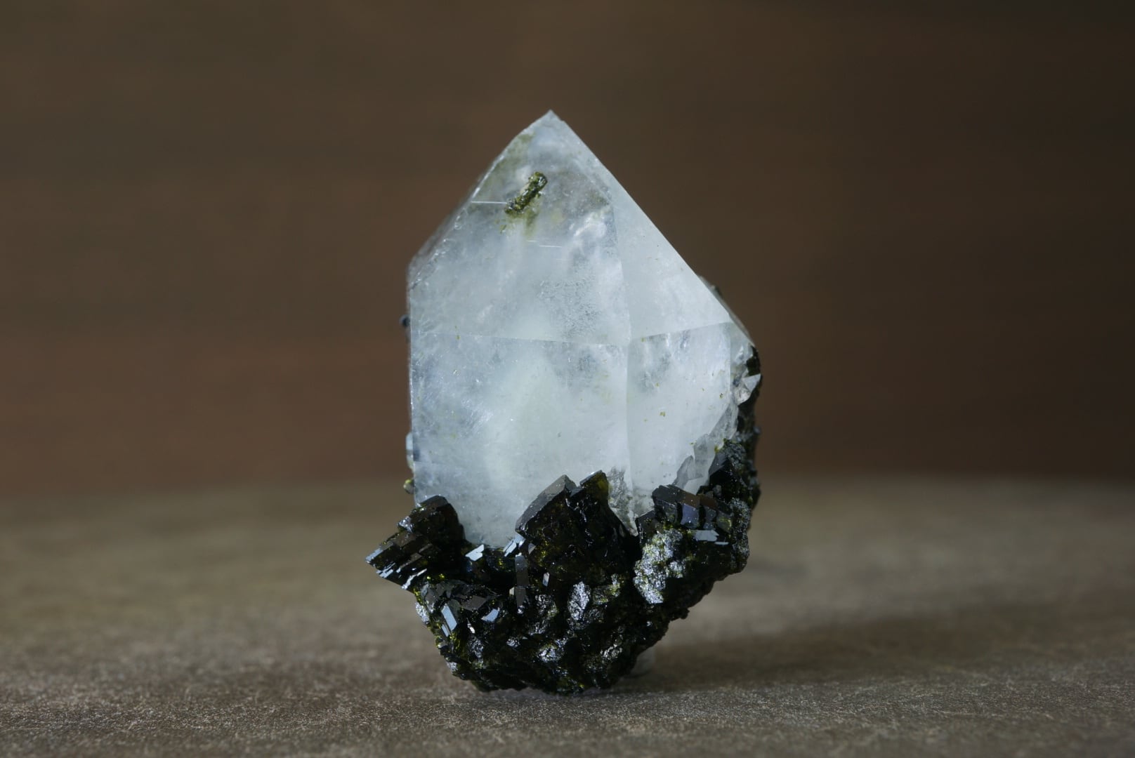 抹茶のような深い緑色のエピドートがクォーツ結晶と混ざり合い、きらびやかな光沢を放っています。