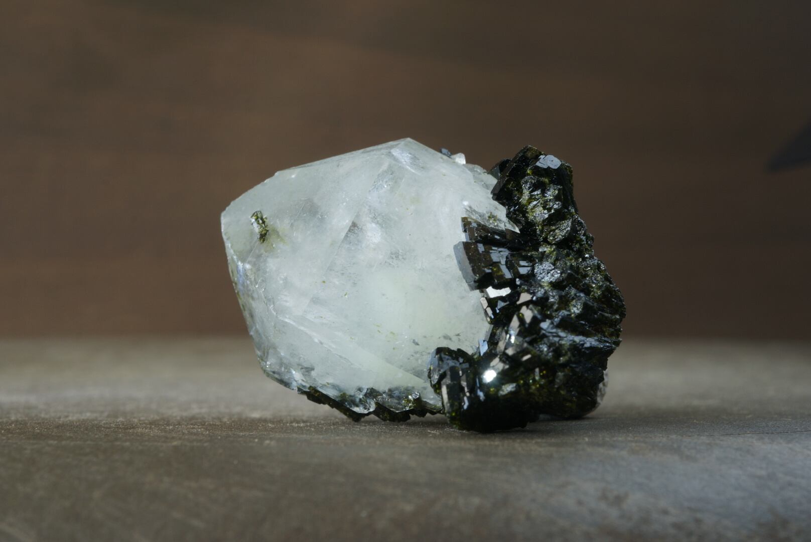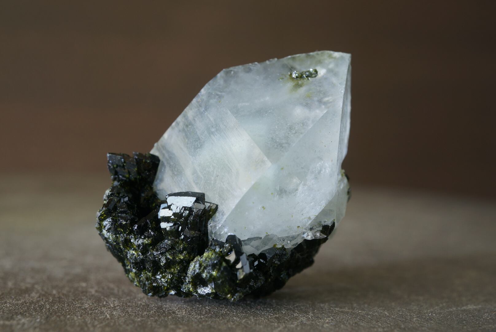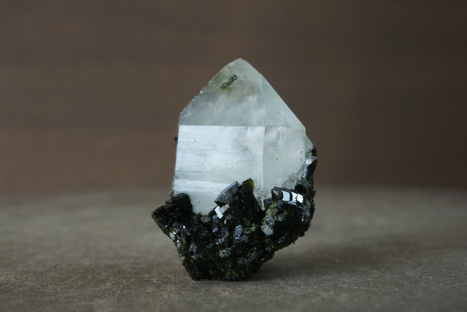 抹茶のような深い緑色のエピドートがクォーツ結晶と混ざり合い、きらびやかな光沢を放っています。