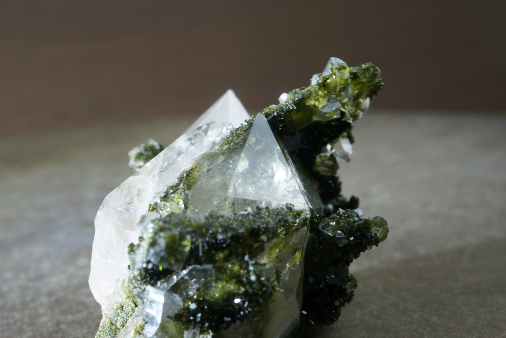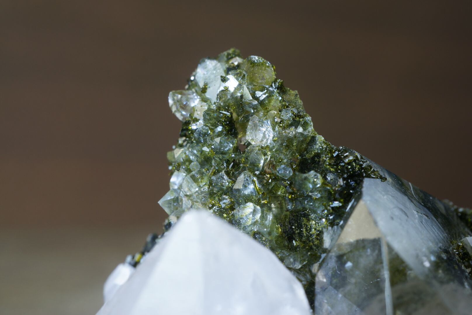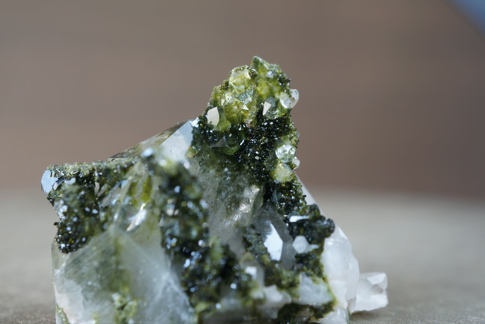 抹茶のような深い緑色のエピドートがクォーツ結晶と混ざり合い、きらびやかな光沢を放っています。