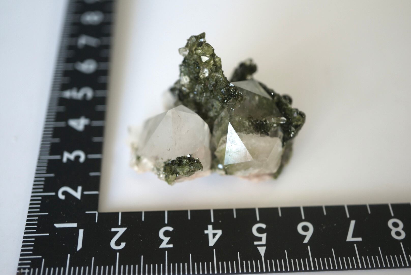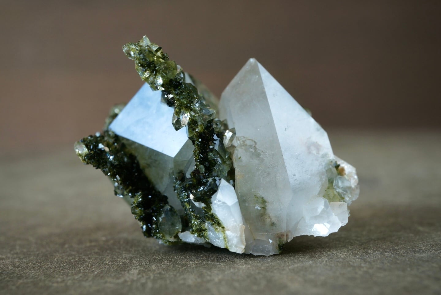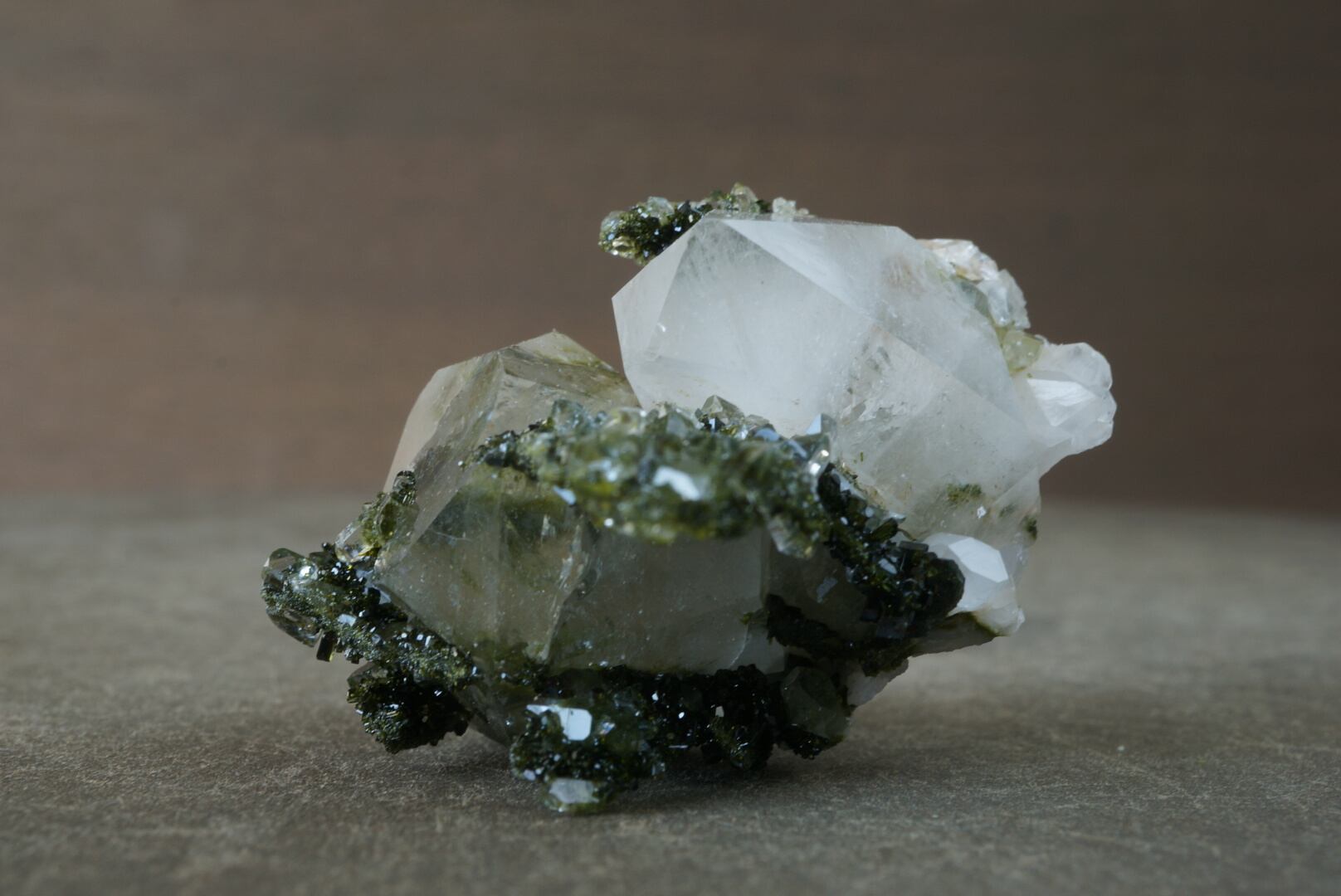 抹茶のような深い緑色のエピドートがクォーツ結晶と混ざり合い、きらびやかな光沢を放っています。