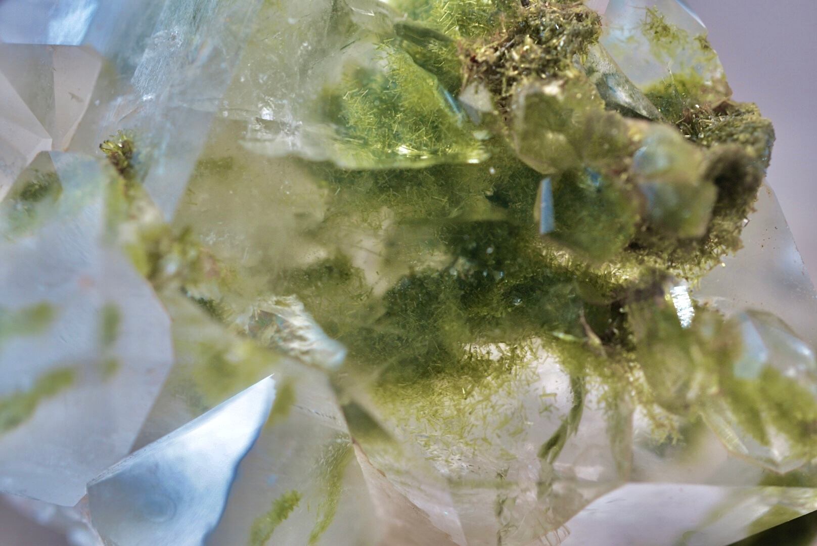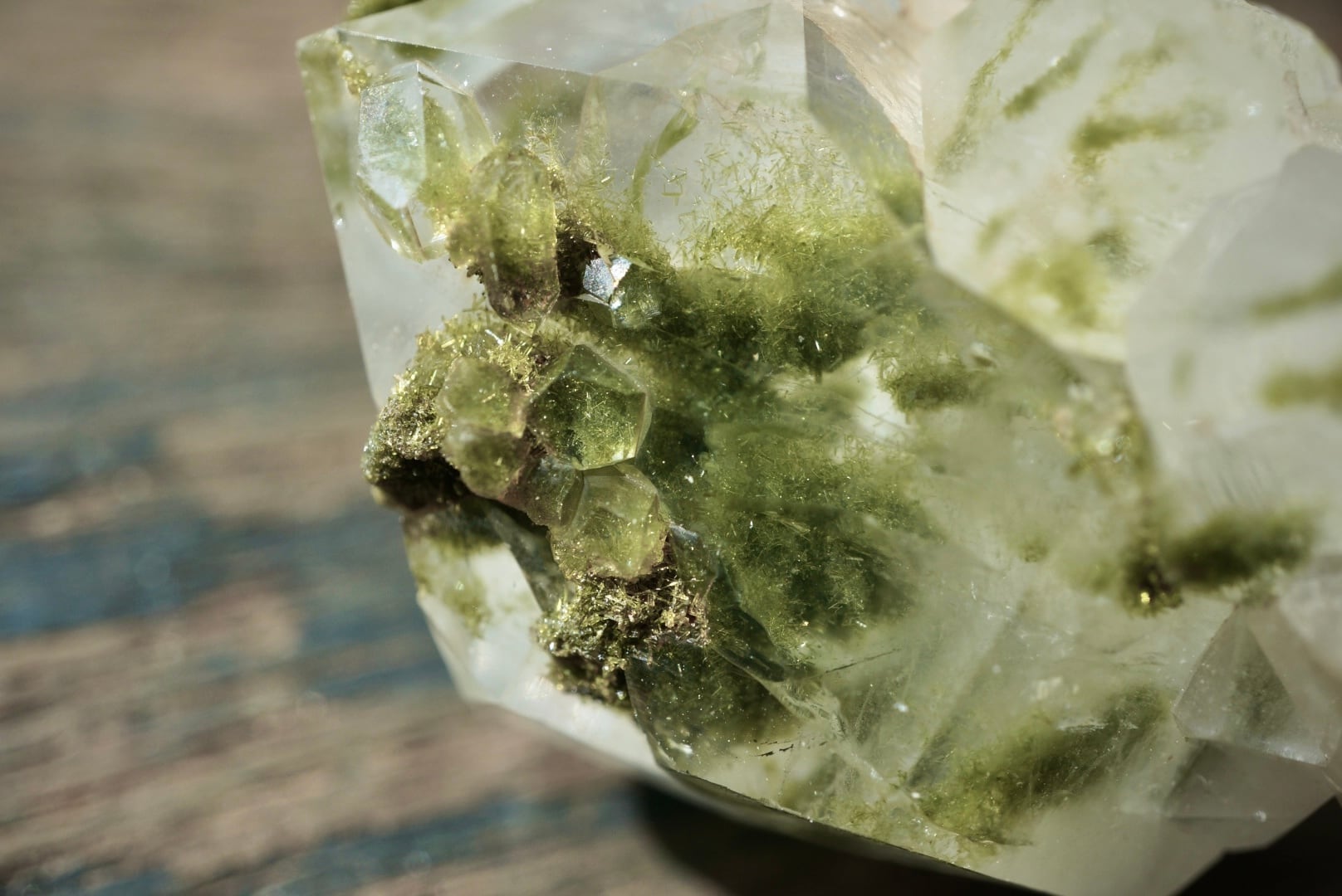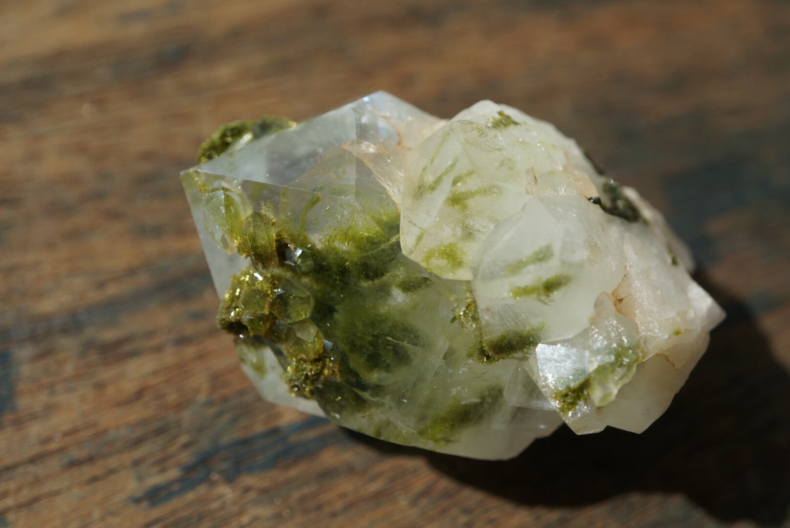 抹茶のような深い緑色のエピドートがクォーツ結晶と混ざり合い、きらびやかな光沢を放っています。