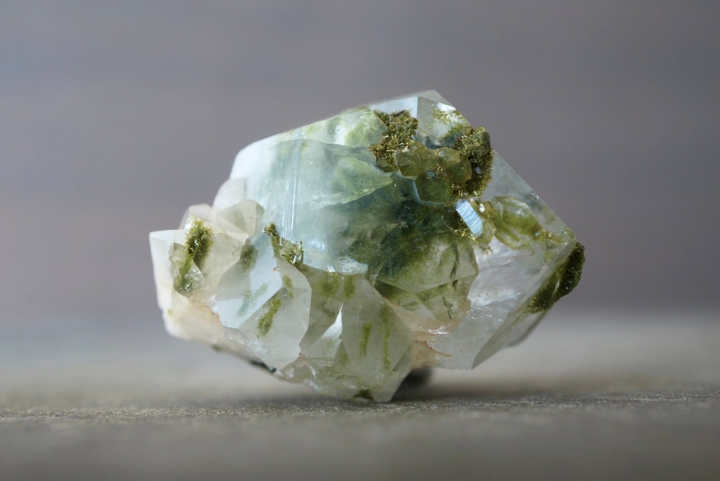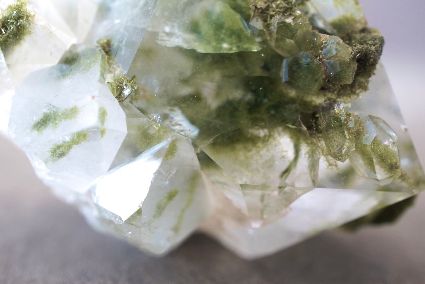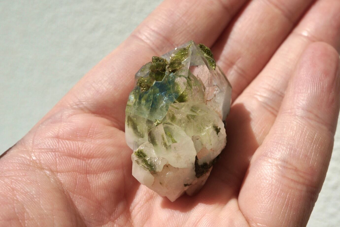 抹茶のような深い緑色のエピドートがクォーツ結晶と混ざり合い、きらびやかな光沢を放っています。