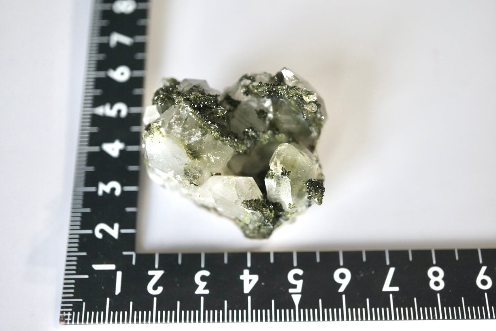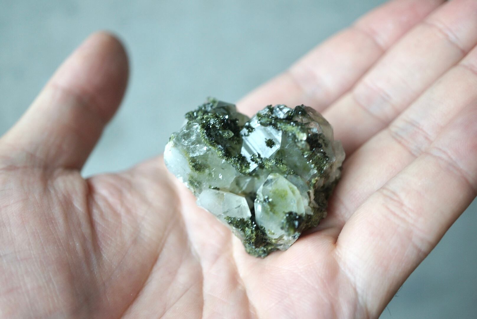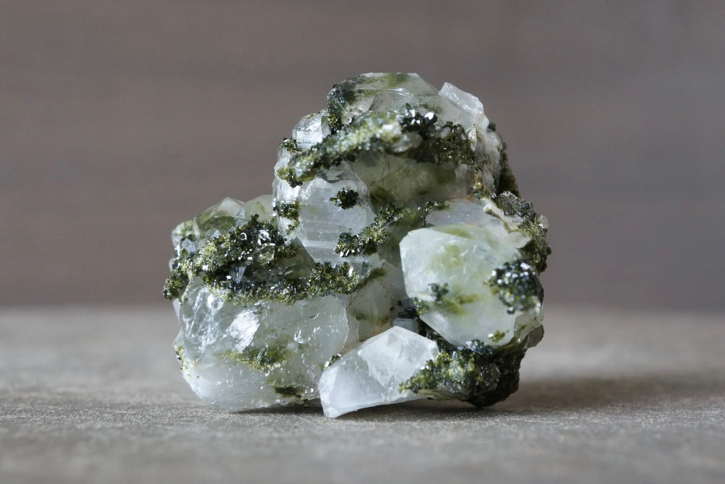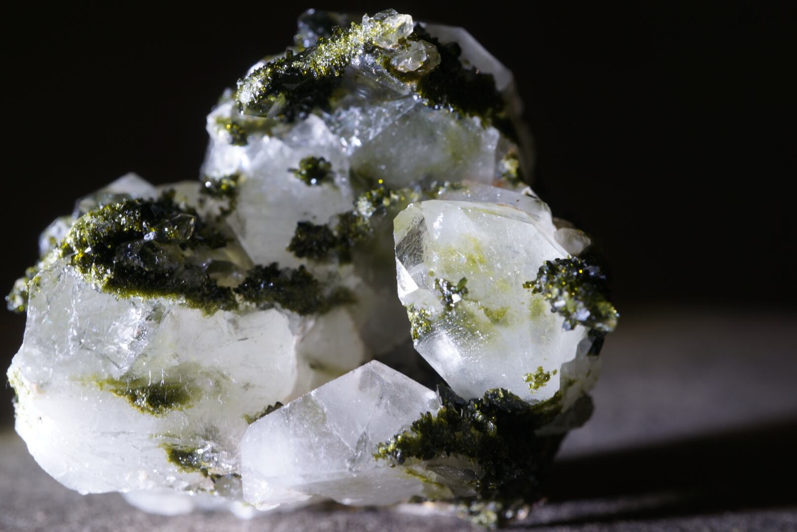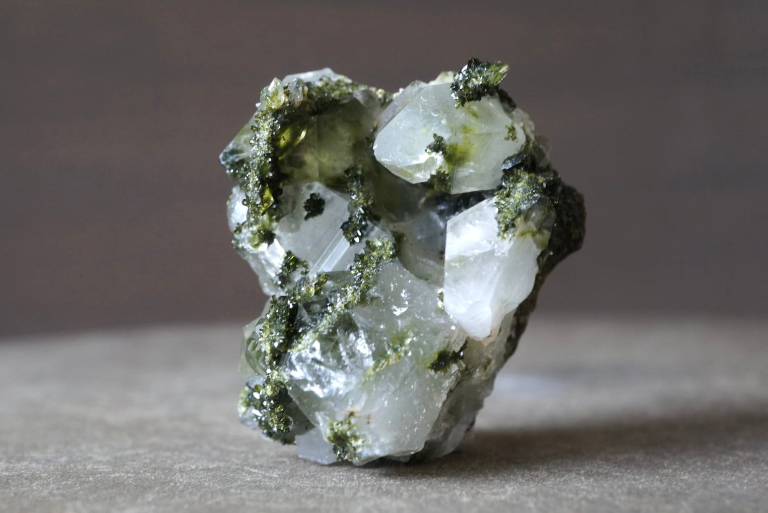 抹茶のような深い緑色のエピドートがクォーツ結晶と混ざり合い、きらびやかな光沢を放っています。