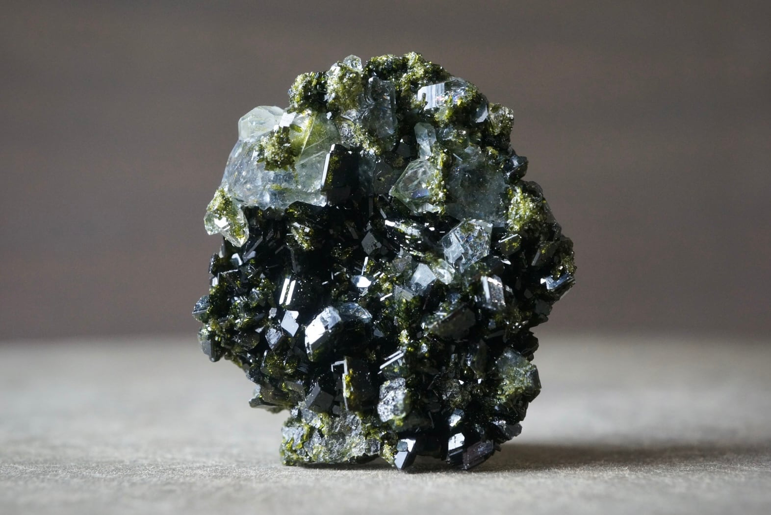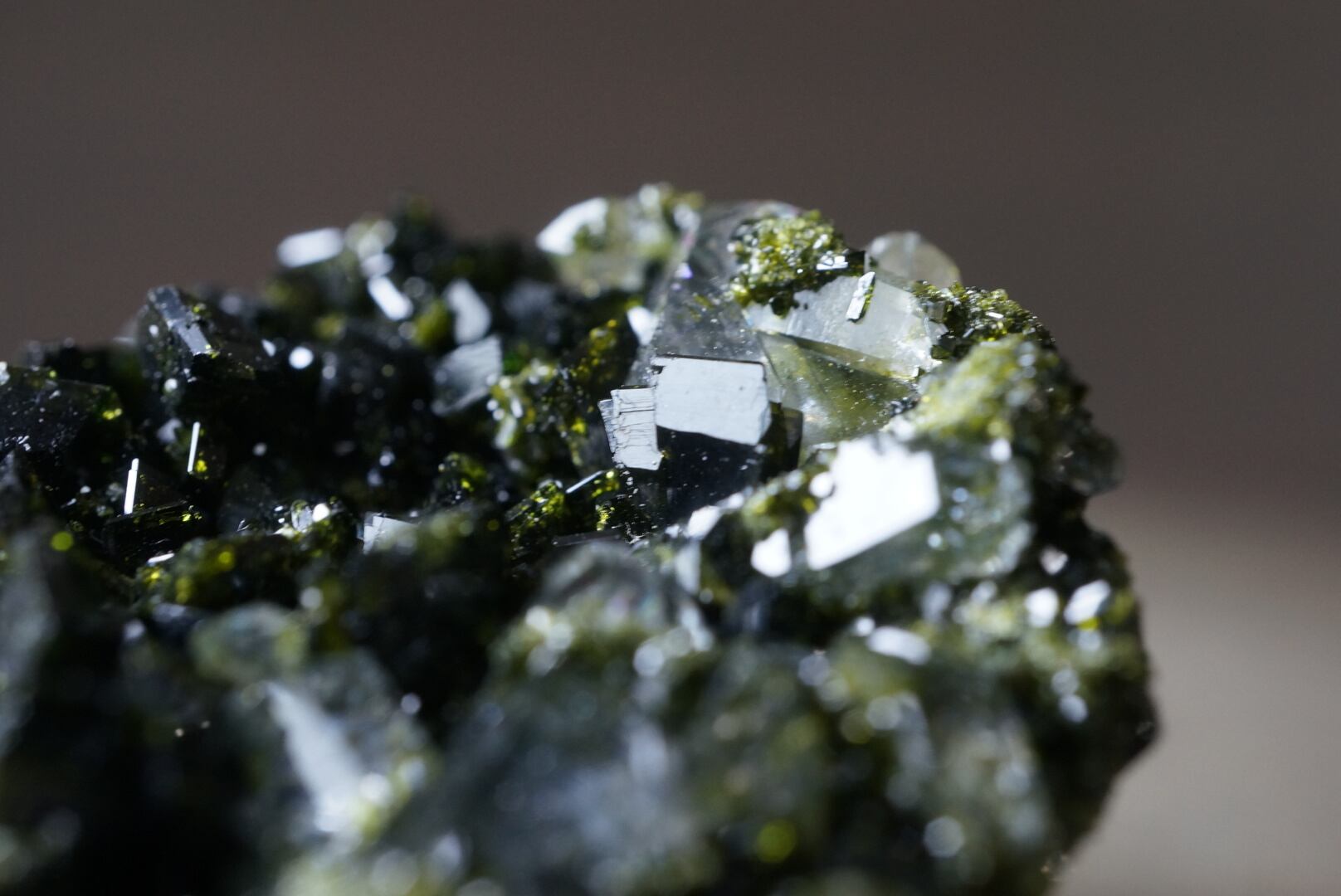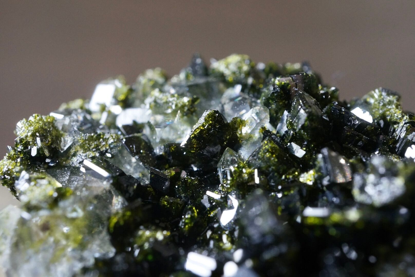 抹茶のような深い緑色のエピドートがクォーツ結晶と混ざり合い、きらびやかな光沢を放っています。