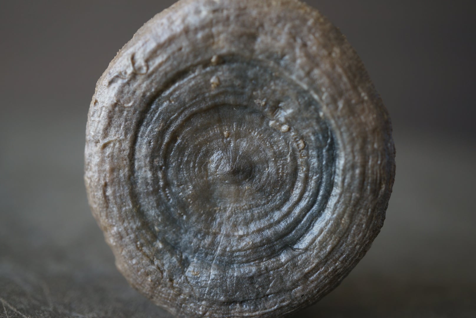 中央から外縁に向かって幾重にも重なる層は、かつての成長の痕跡を克明に残しており、背面には放射状の細やかな線と柔らかなくぼみが美しく残っています。