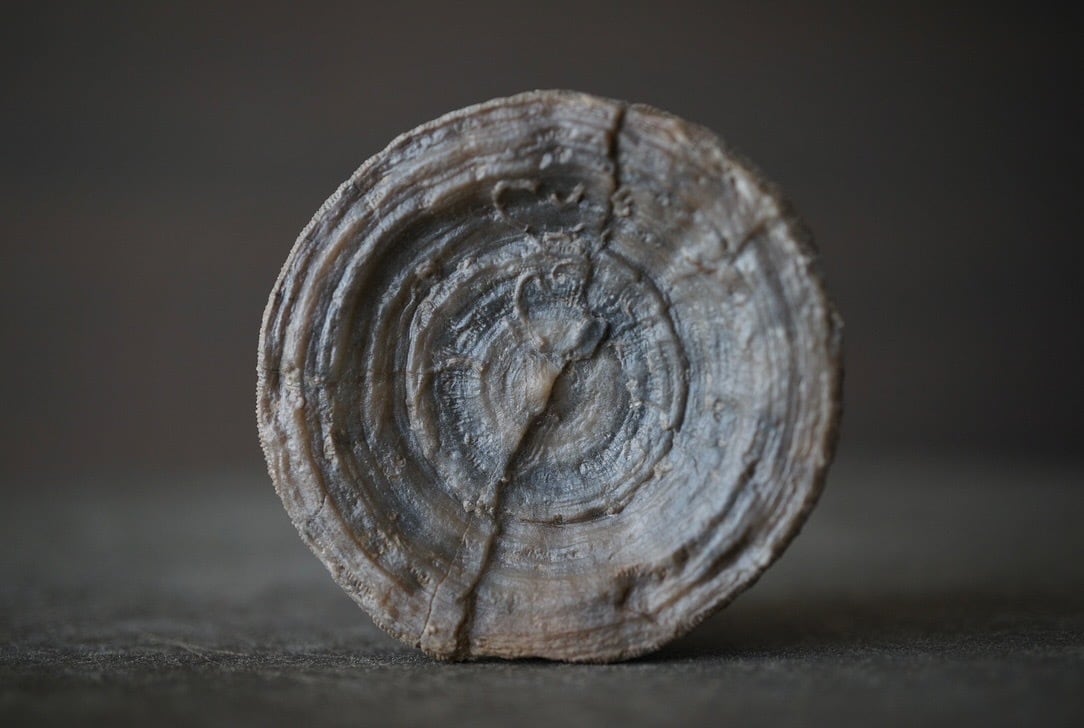 中央から外縁に向かって幾重にも重なる層は、かつての成長の痕跡を克明に残しており、背面には放射状の細やかな線と柔らかなくぼみが美しく残っています。