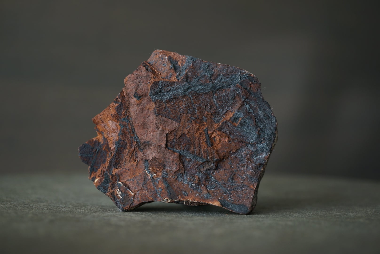細やかな縞模様は、酸化鉄を含む泥質頁岩に刻まれた葉脈の痕跡。