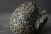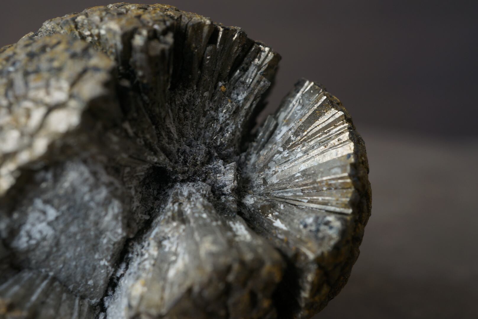 立方晶のパイライトが放射状に結晶化し、丸みを帯びたユニークな形状をしています。