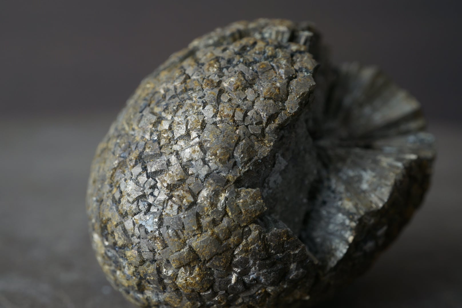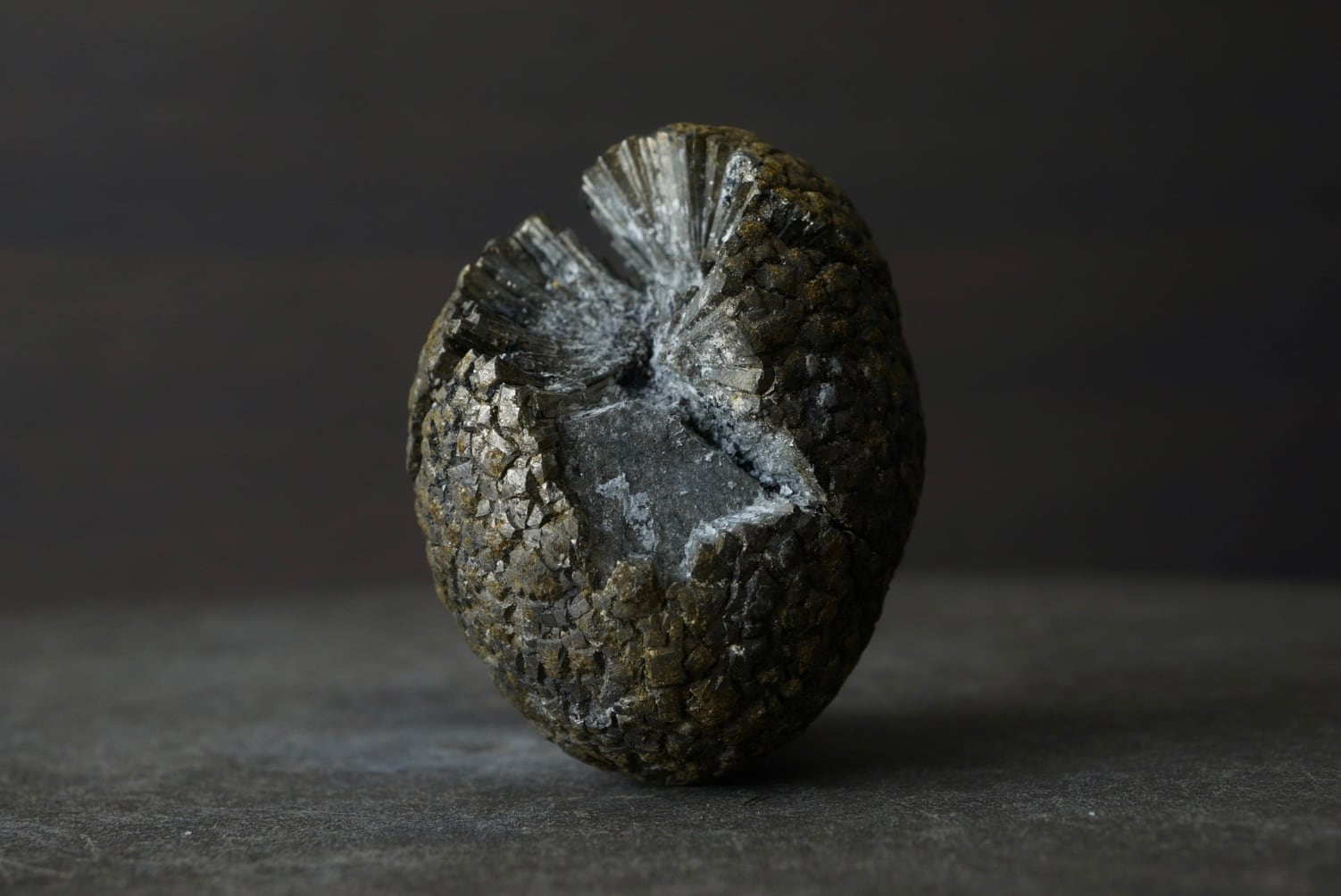 本石は球体の一部分が欠けており、内部の結晶構造が露出しています。