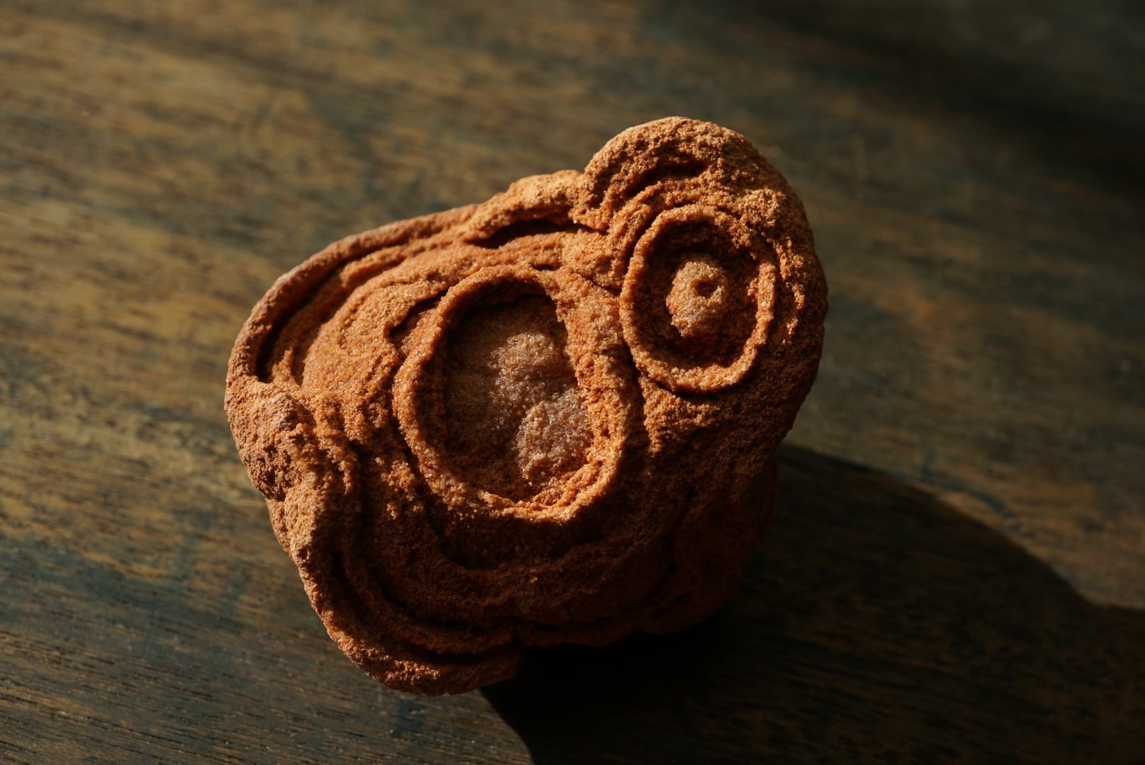 モロッコ産のものは同心円状の赤い球状で産出され、中でも本石のように目玉模様が連なって表れたものは大変希少です。