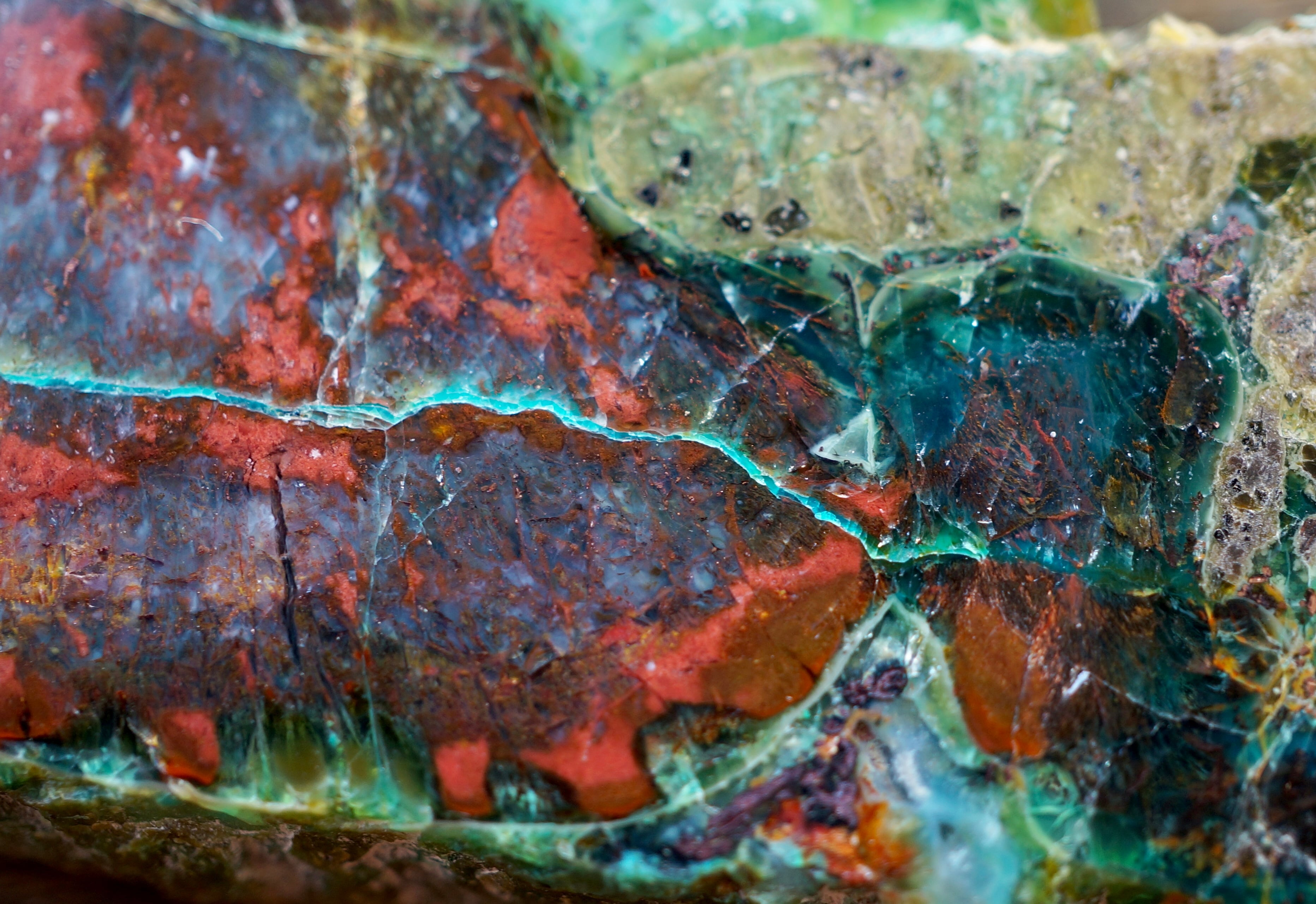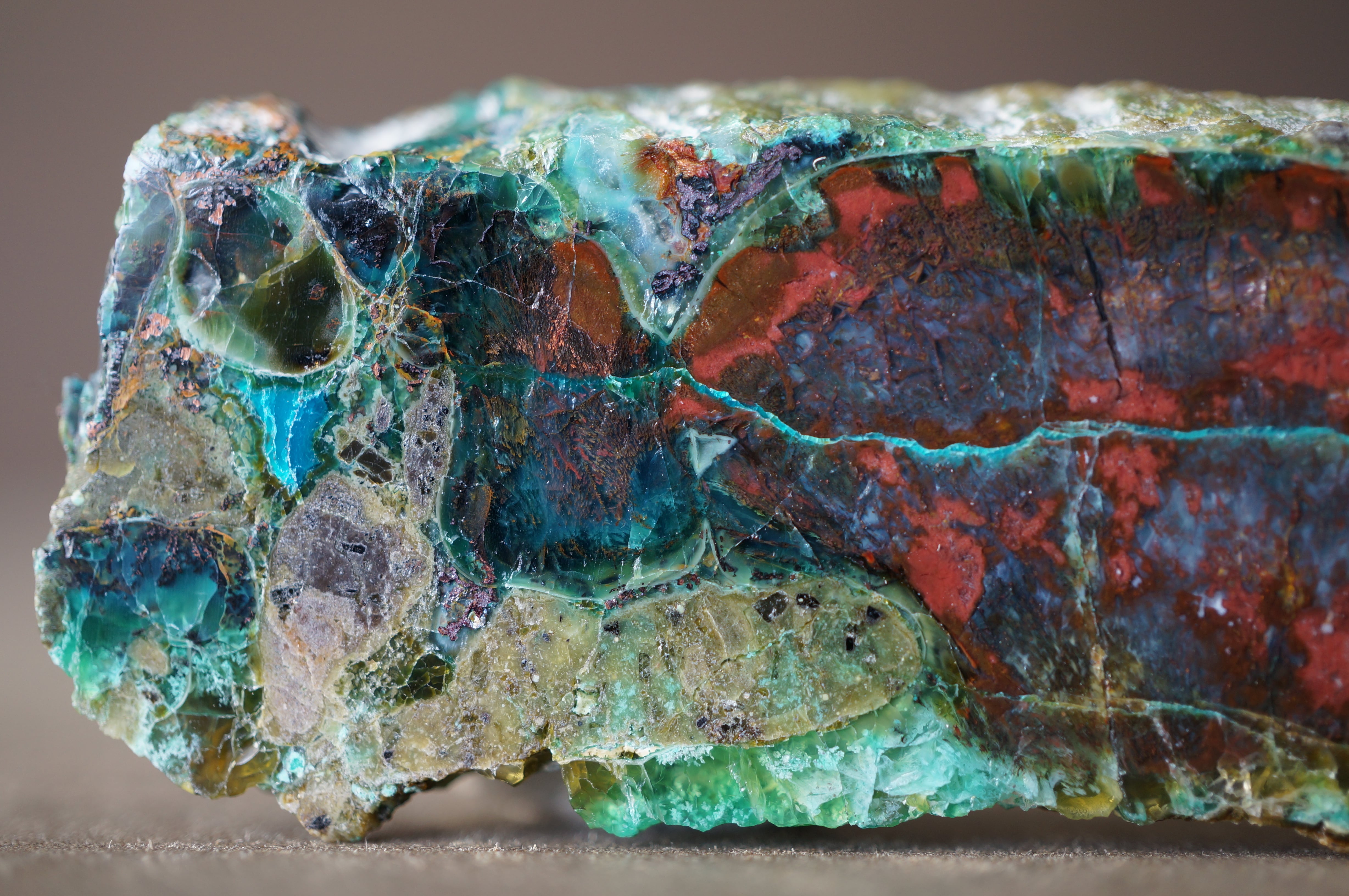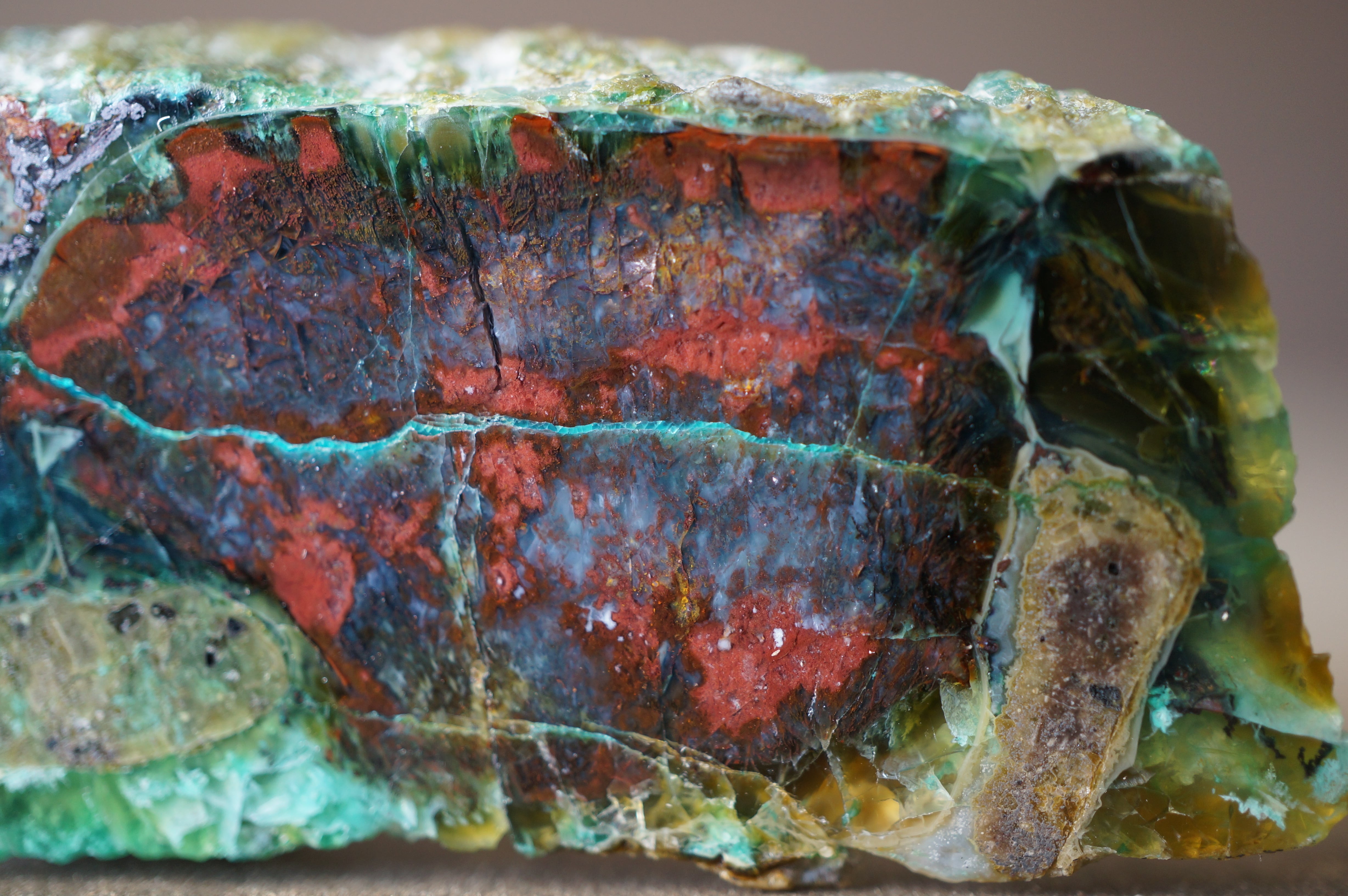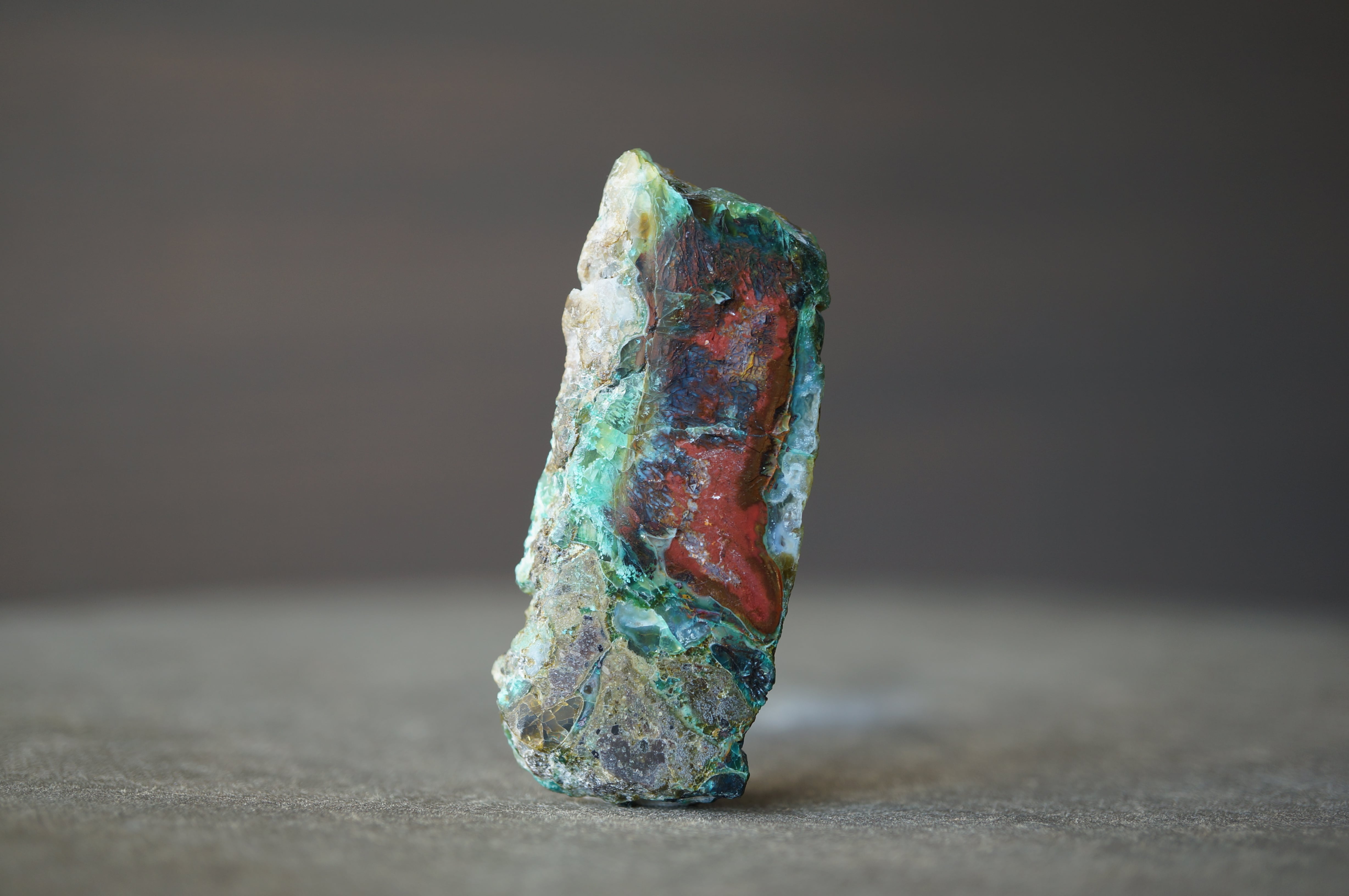 太古の木が長い時間をかけて珪化する過程で、銅を含む鉱液によって鮮やかに彩られました。