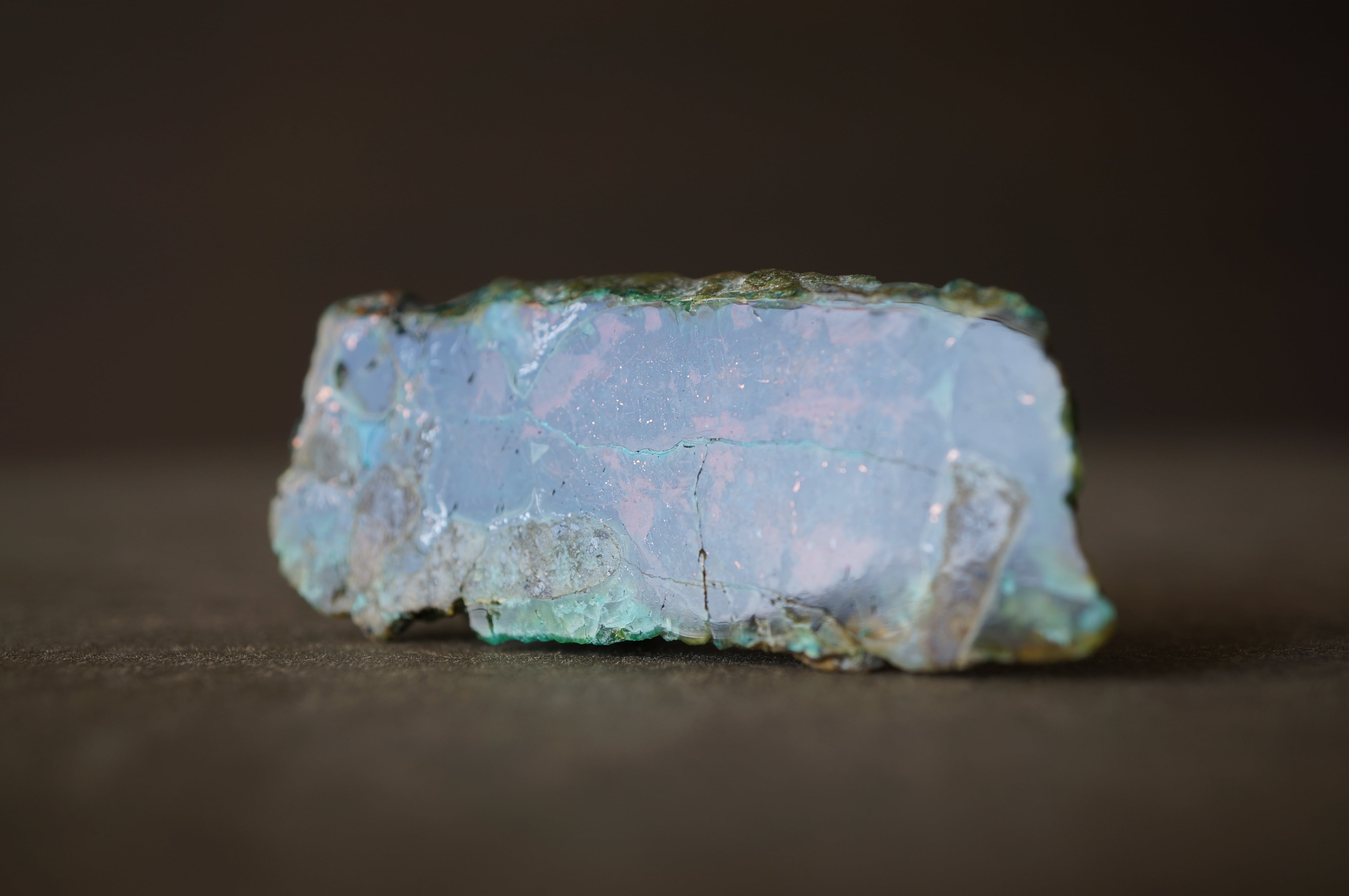 研磨された表面には、深い湖を覗くような奥行きのある色彩と、きらびやかな金属光沢が混在し、他の鉱物では得られない独特の視覚効果を見せています。
