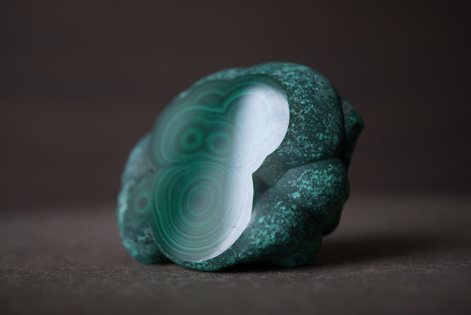 マラカイト特有のサイケデリックな断面と鍾乳状の柔らかな質感の両面を楽しむことができる珍しい仕立てとなっております。