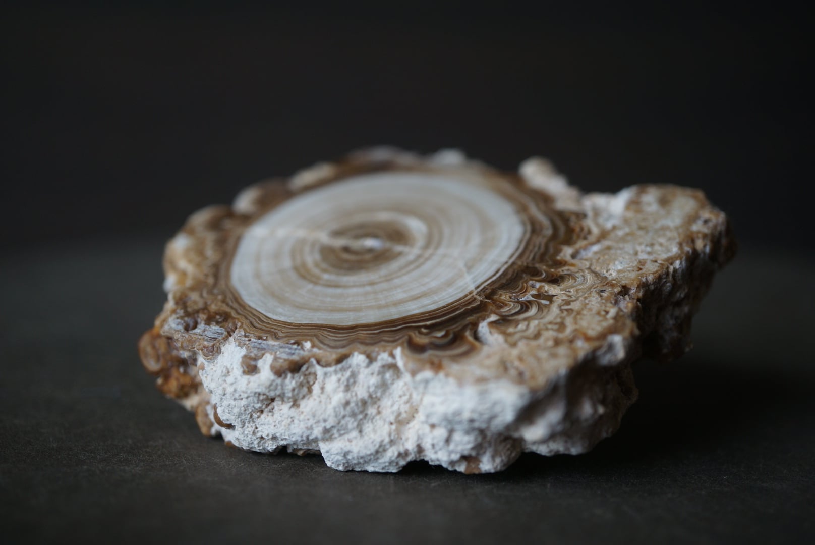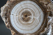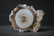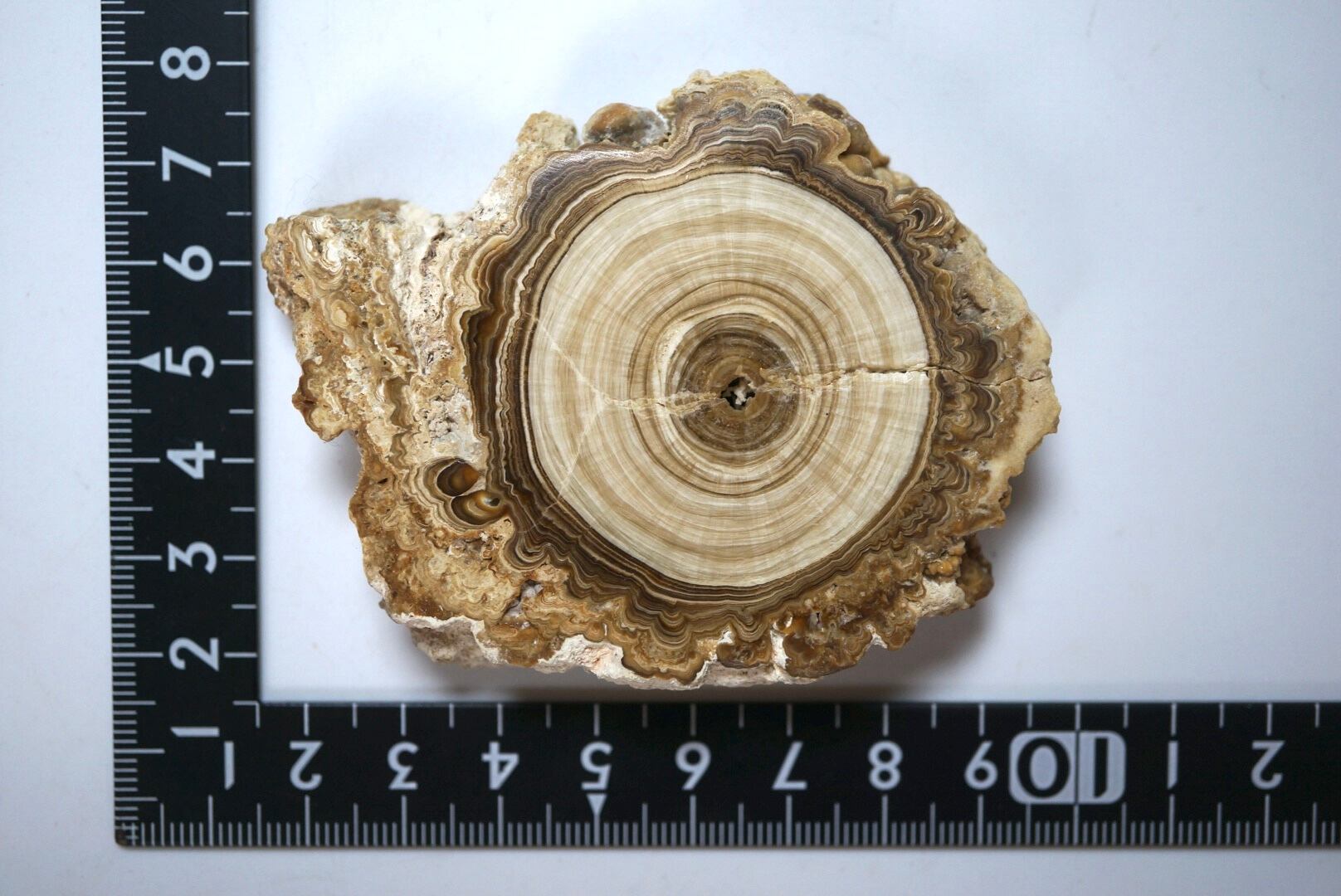 モロッコ中部 アヤチ山地で採取された「Cave Popcorn」とも呼ばれる鍾乳石の一種で、断面を磨くとまるで樹木の年輪のような縞模様が現れます。