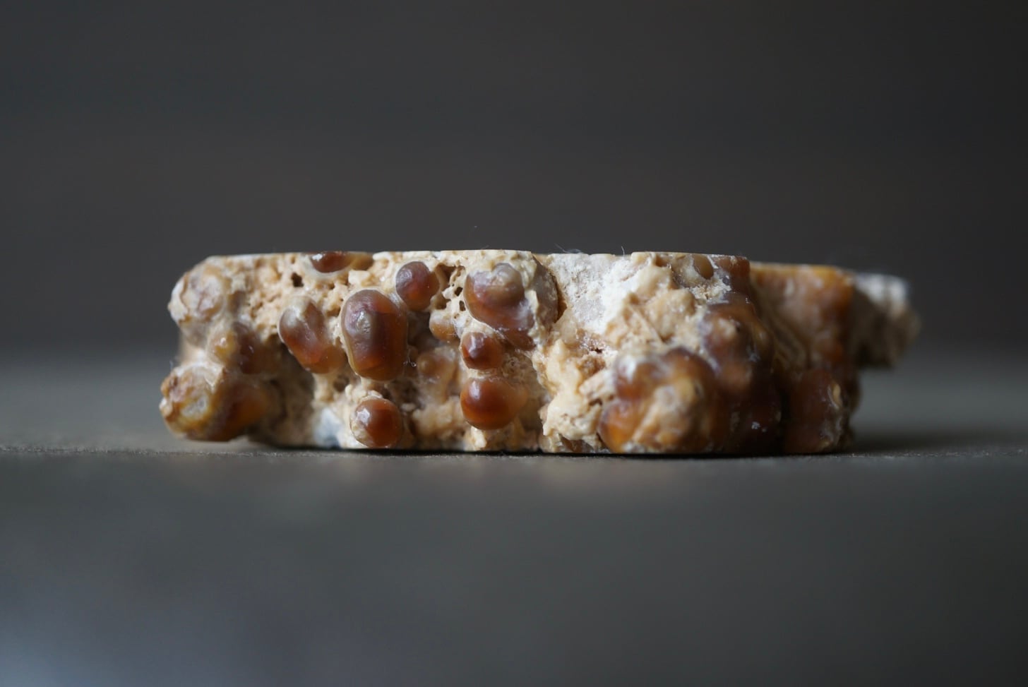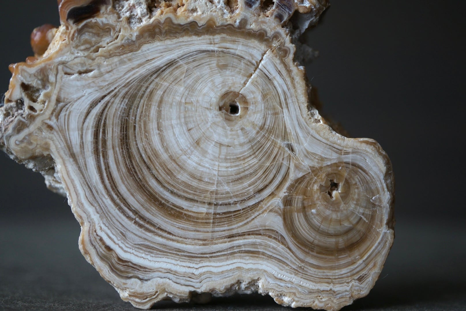 モロッコ中部 アヤチ山地で採取された「Cave Popcorn」とも呼ばれる鍾乳石の一種で、断面を磨くとまるで樹木の年輪のような縞模様が現れます。