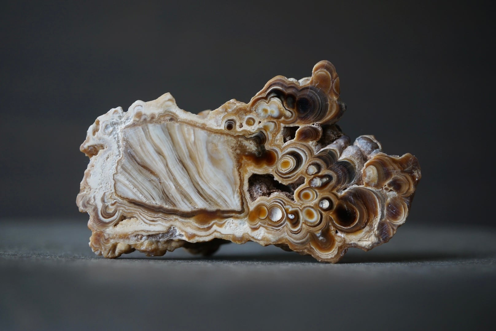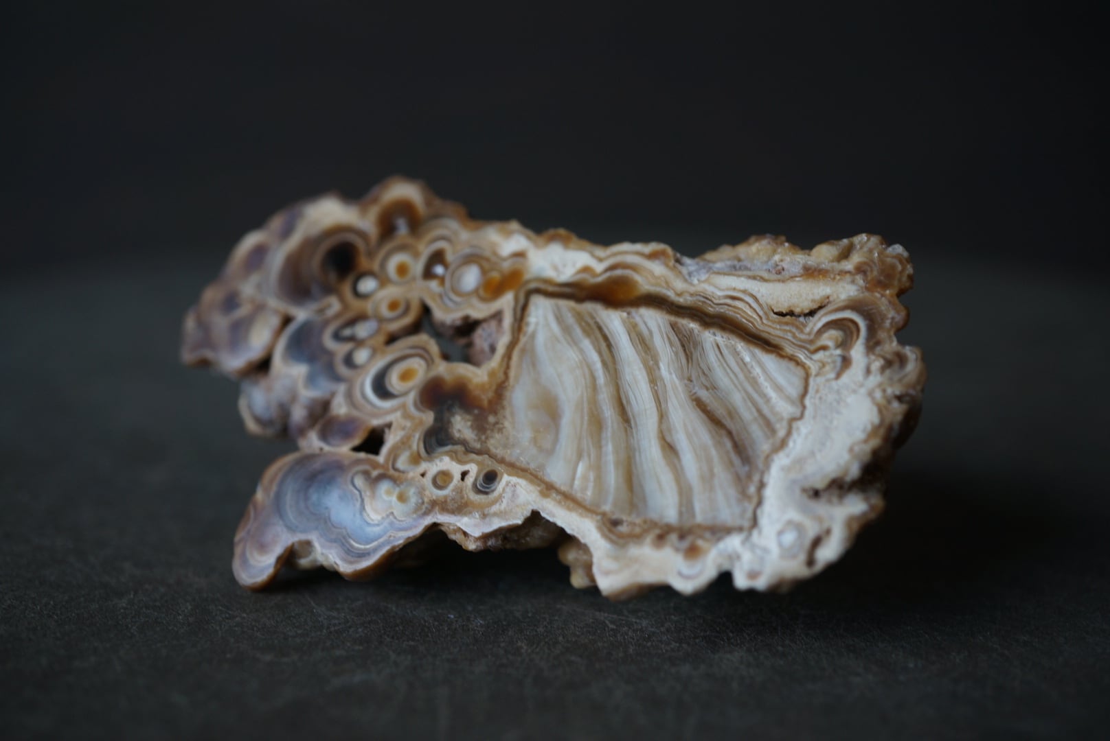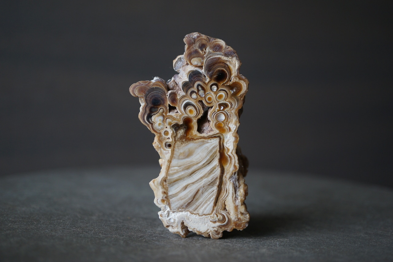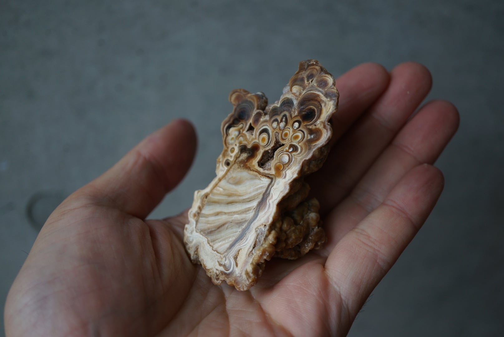 モロッコ中部 アヤチ山地で採取された「Cave Popcorn」とも呼ばれる鍾乳石の一種で、断面を磨くとまるで樹木の年輪のような縞模様が現れます。