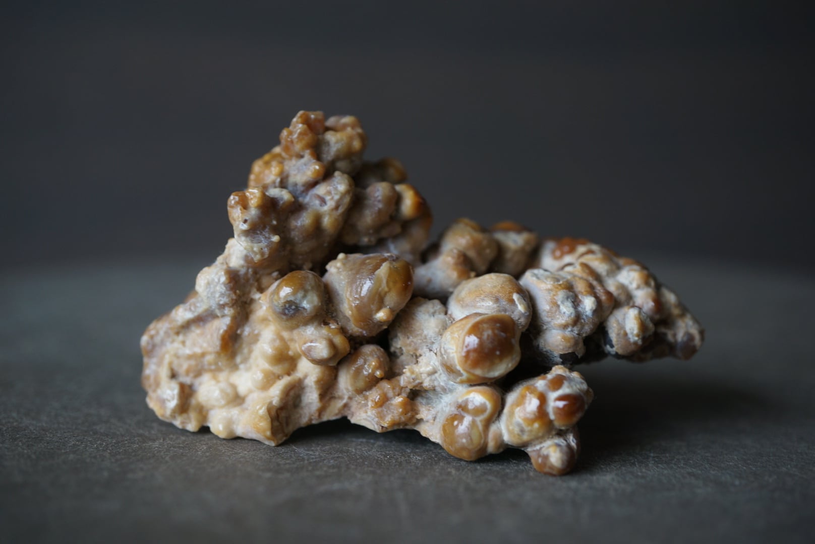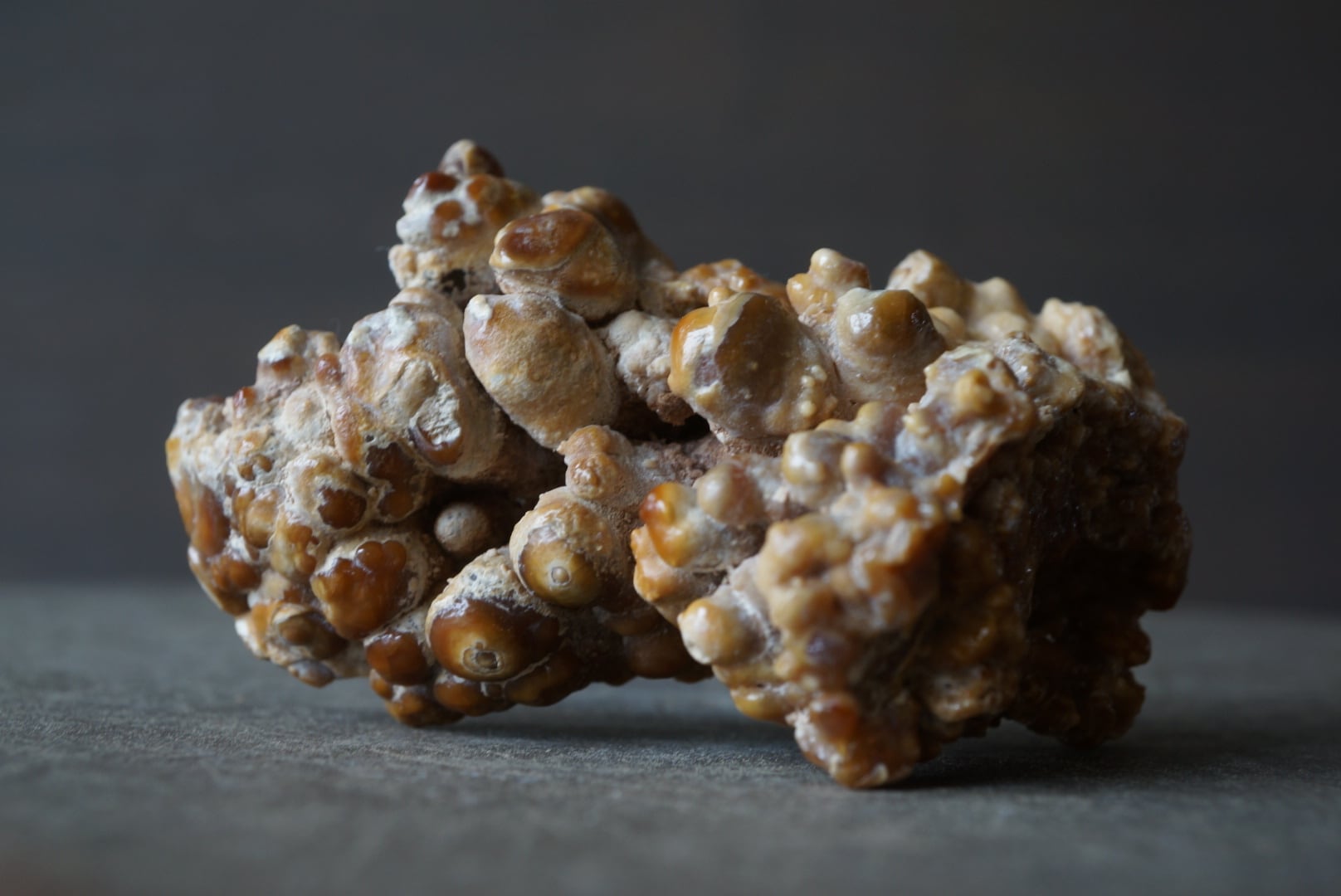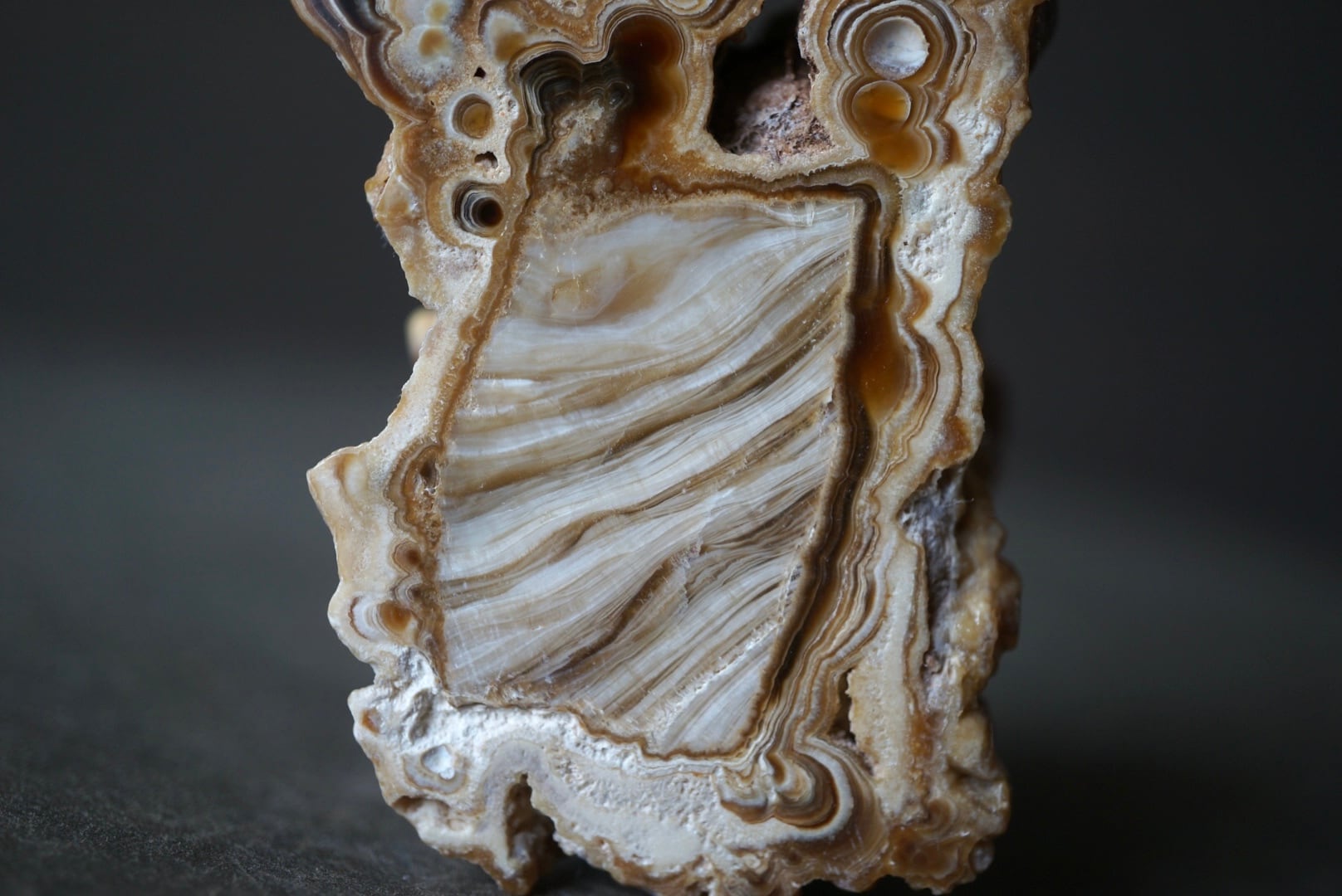 モロッコ中部 アヤチ山地で採取された「Cave Popcorn」とも呼ばれる鍾乳石の一種で、断面を磨くとまるで樹木の年輪のような縞模様が現れます。