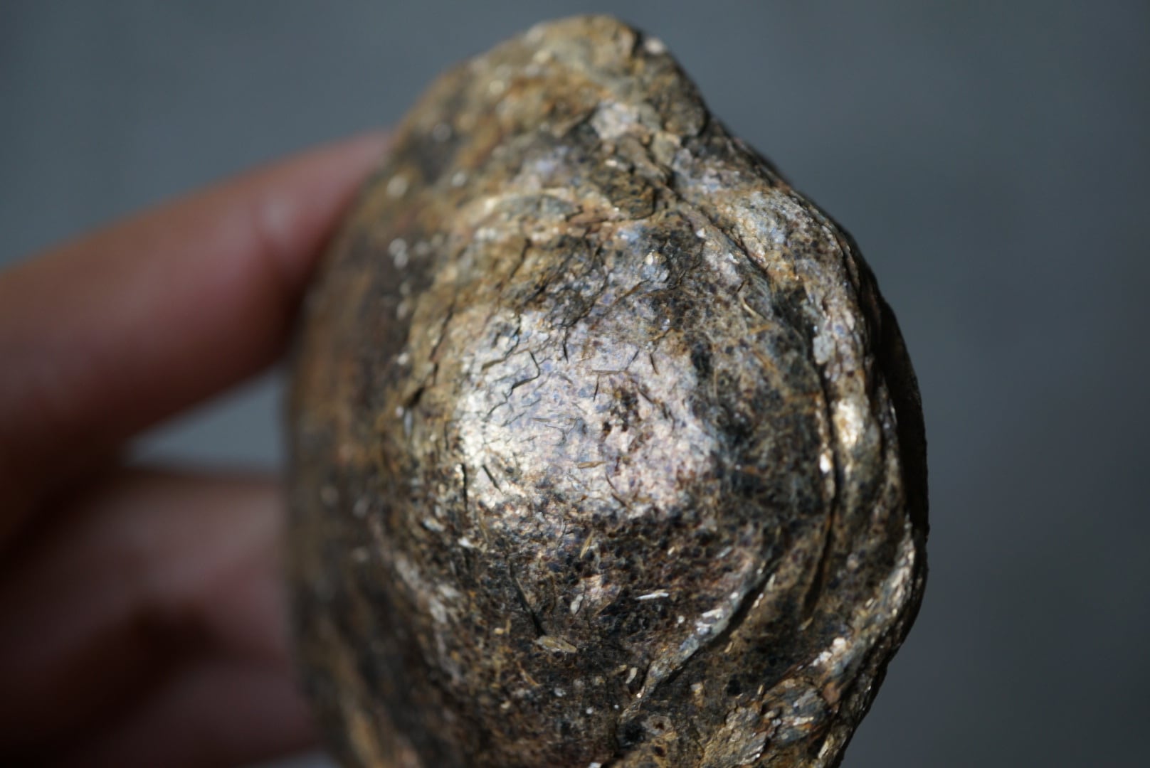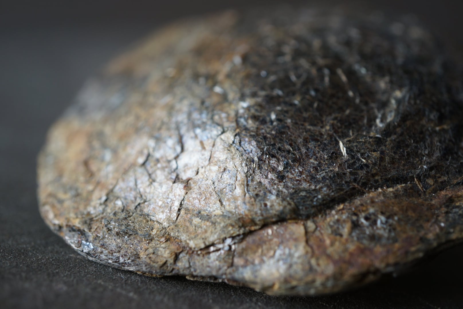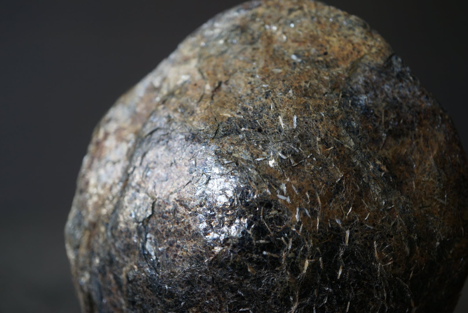鉄やマグネシウムを含むことで黒褐色から黒色を呈し、結晶面は光を受けるたびに銅色の金属的な閃きを返します。