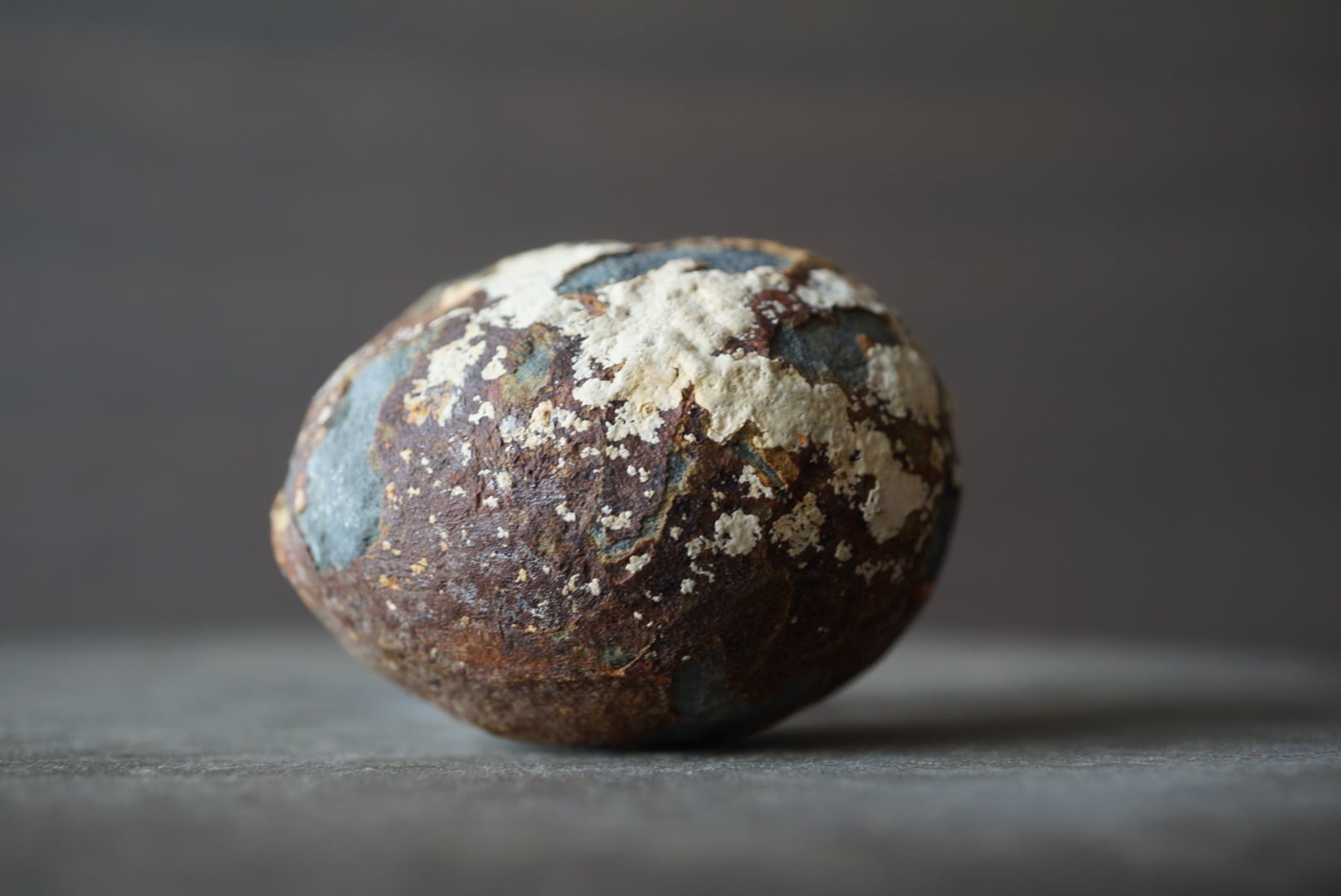本産地の藍鉄鉱は魚の骨等の有機物をコアに、海水中の鉄とリンが微生物の作用で沈着し、長い時間をかけて結晶化したものと考えられています。
