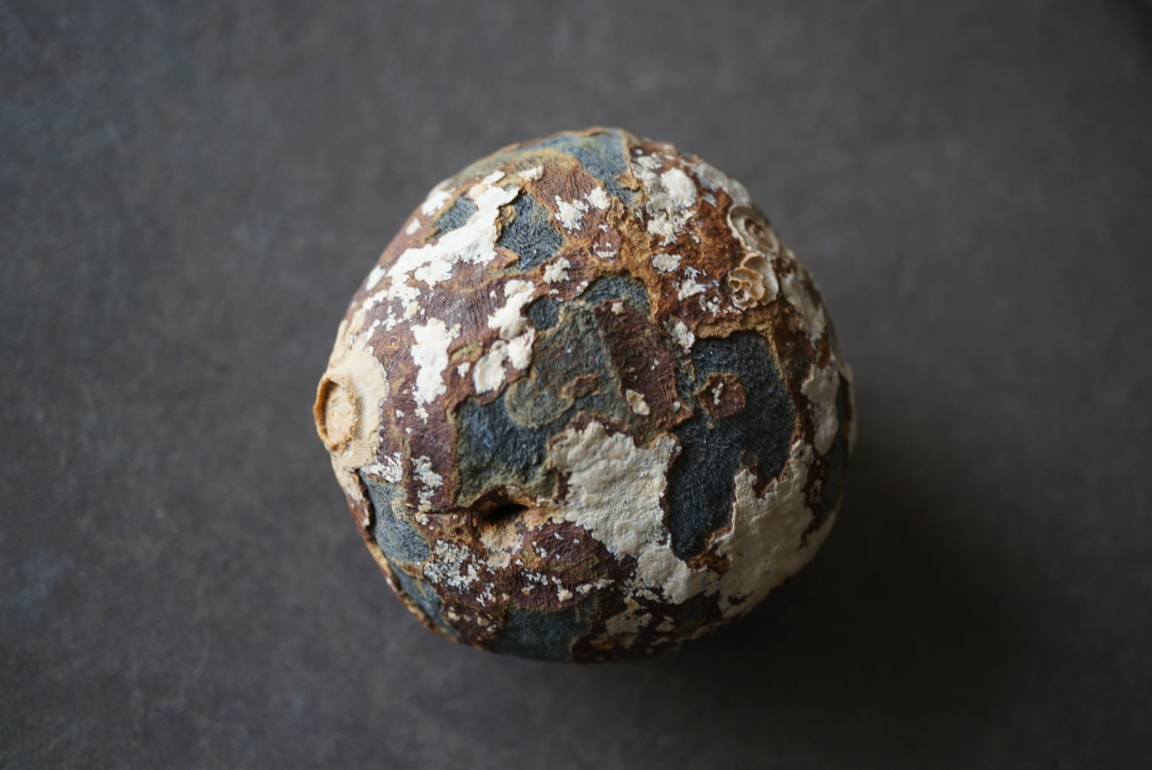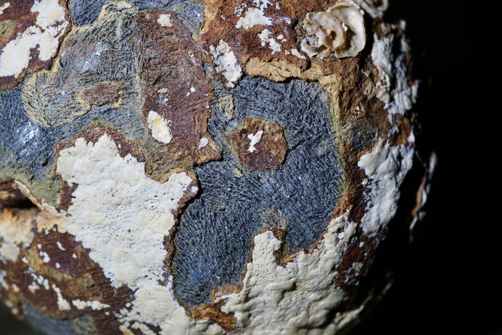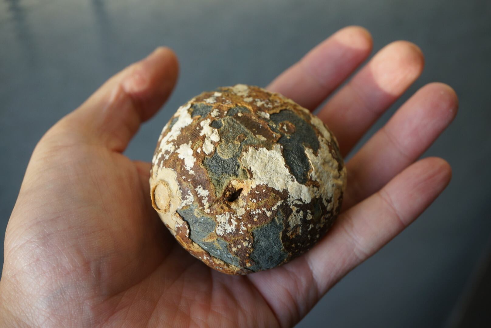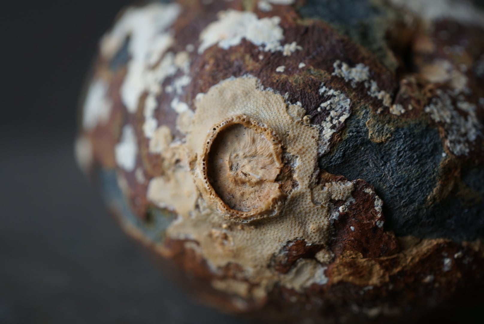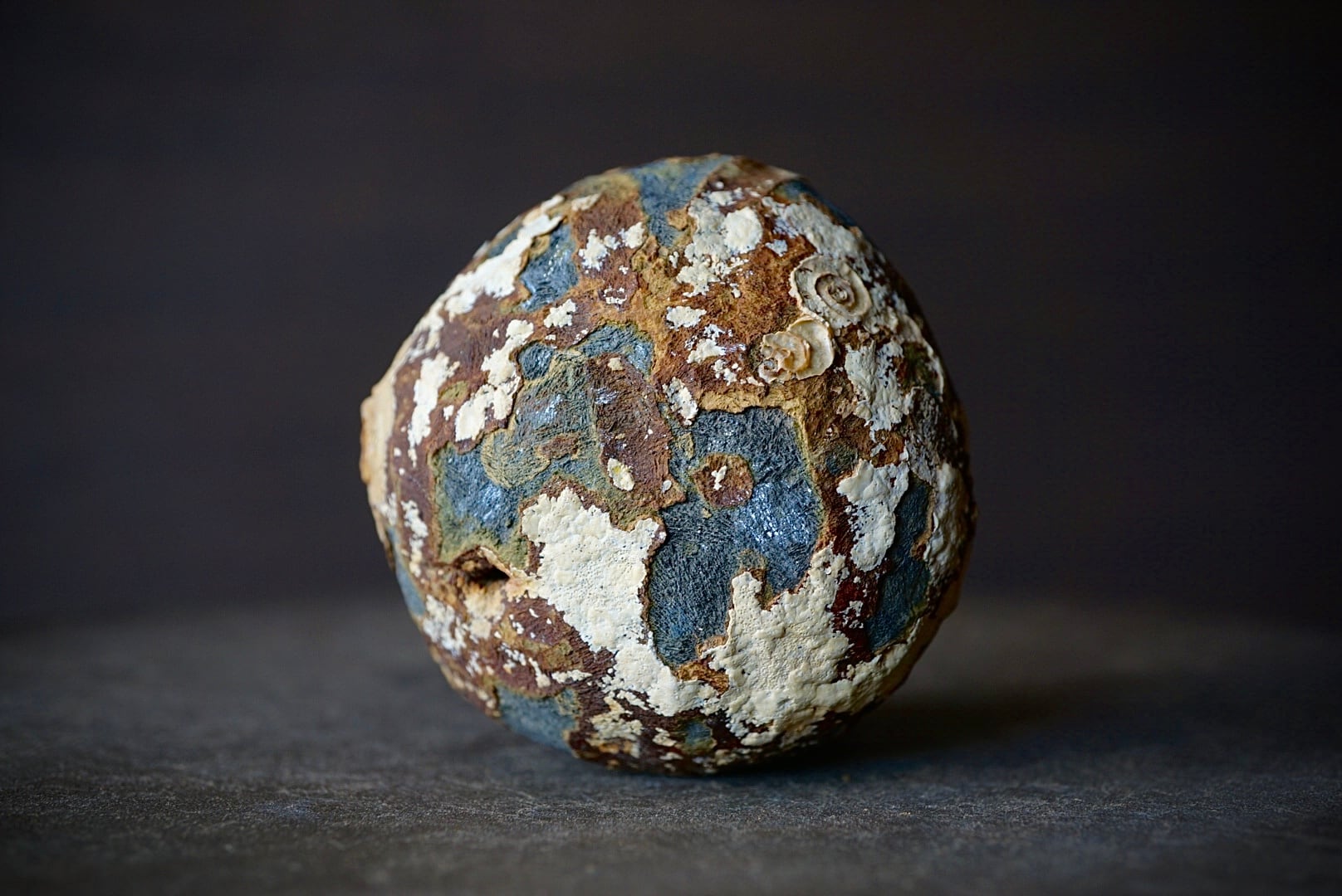表面には貝殻やコケムシらしき海洋生物の痕跡が不規則な模様を描き、ひとつの惑星のような表情を見せています。