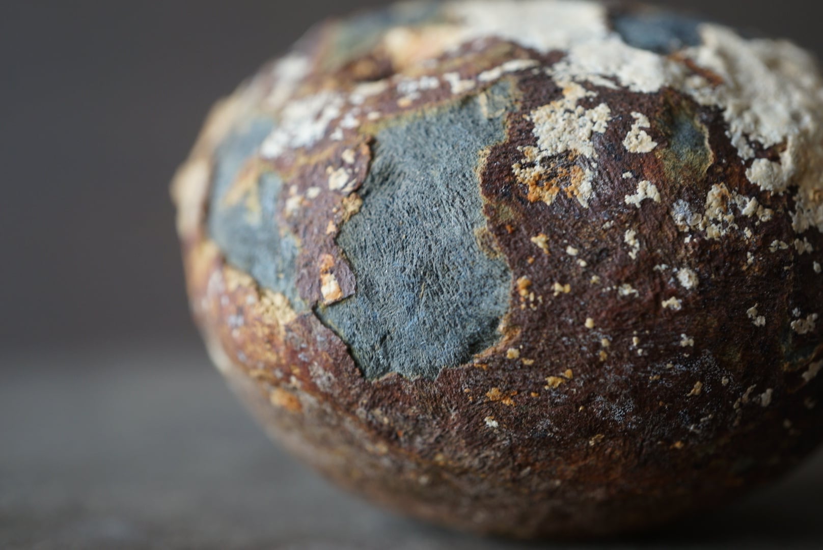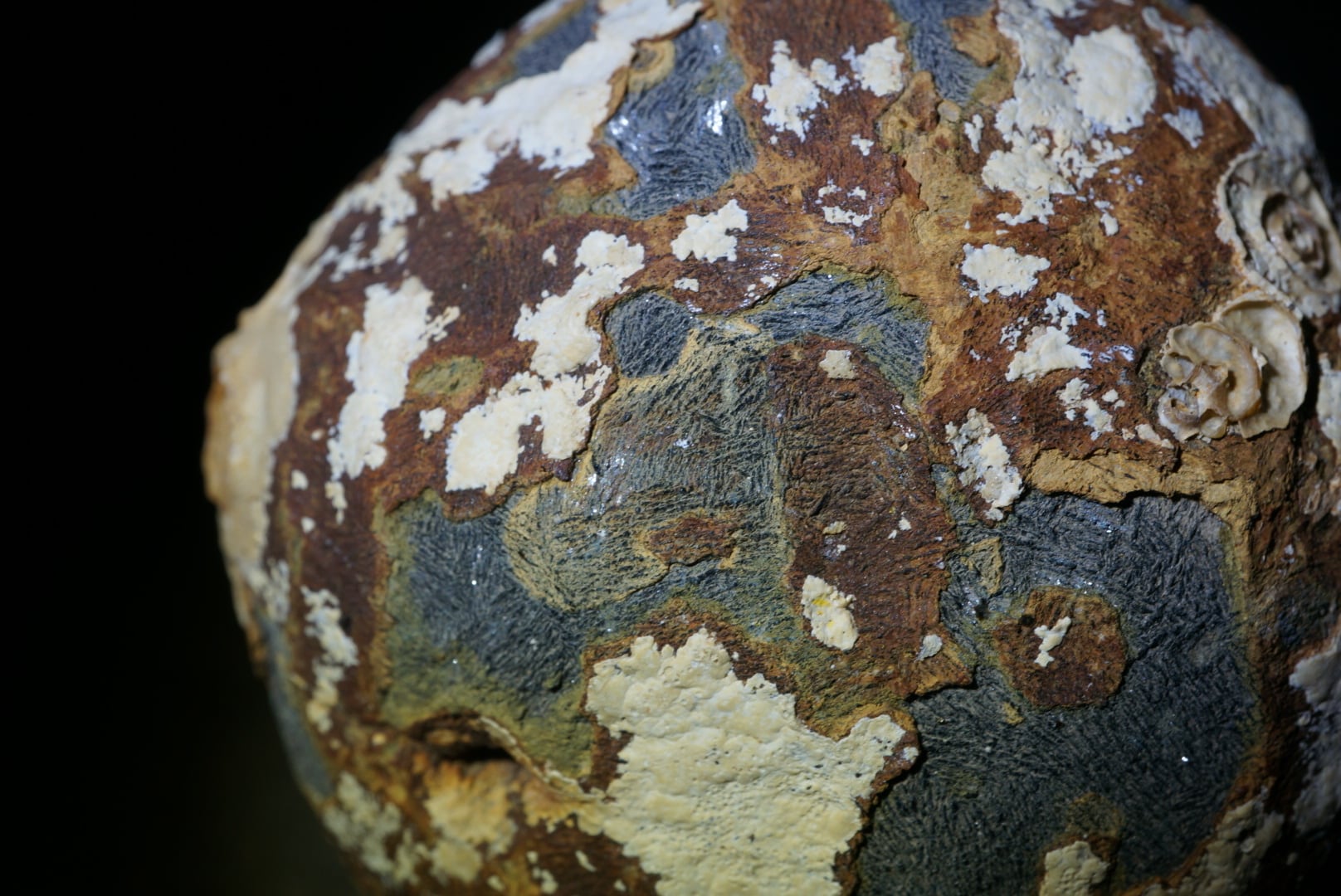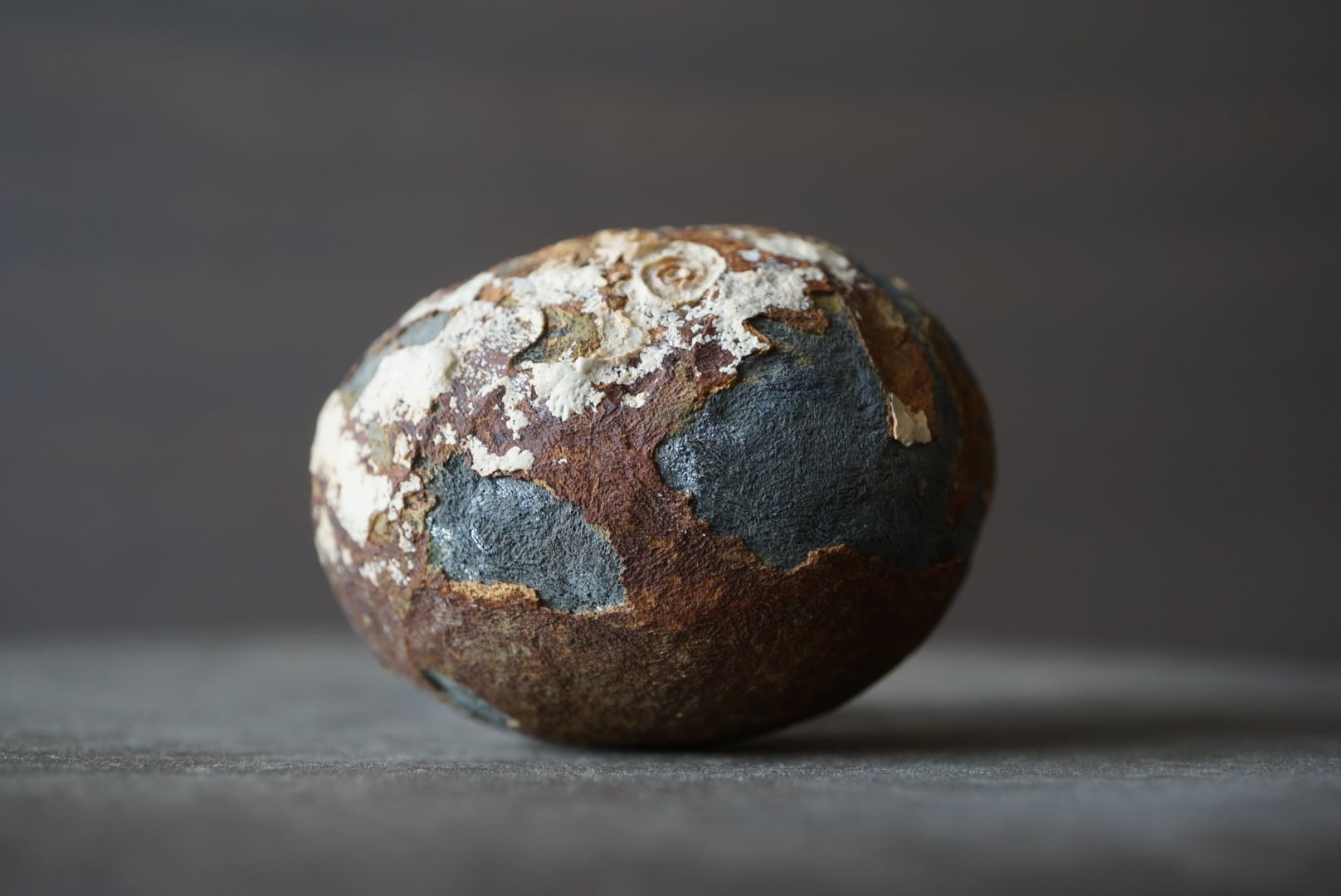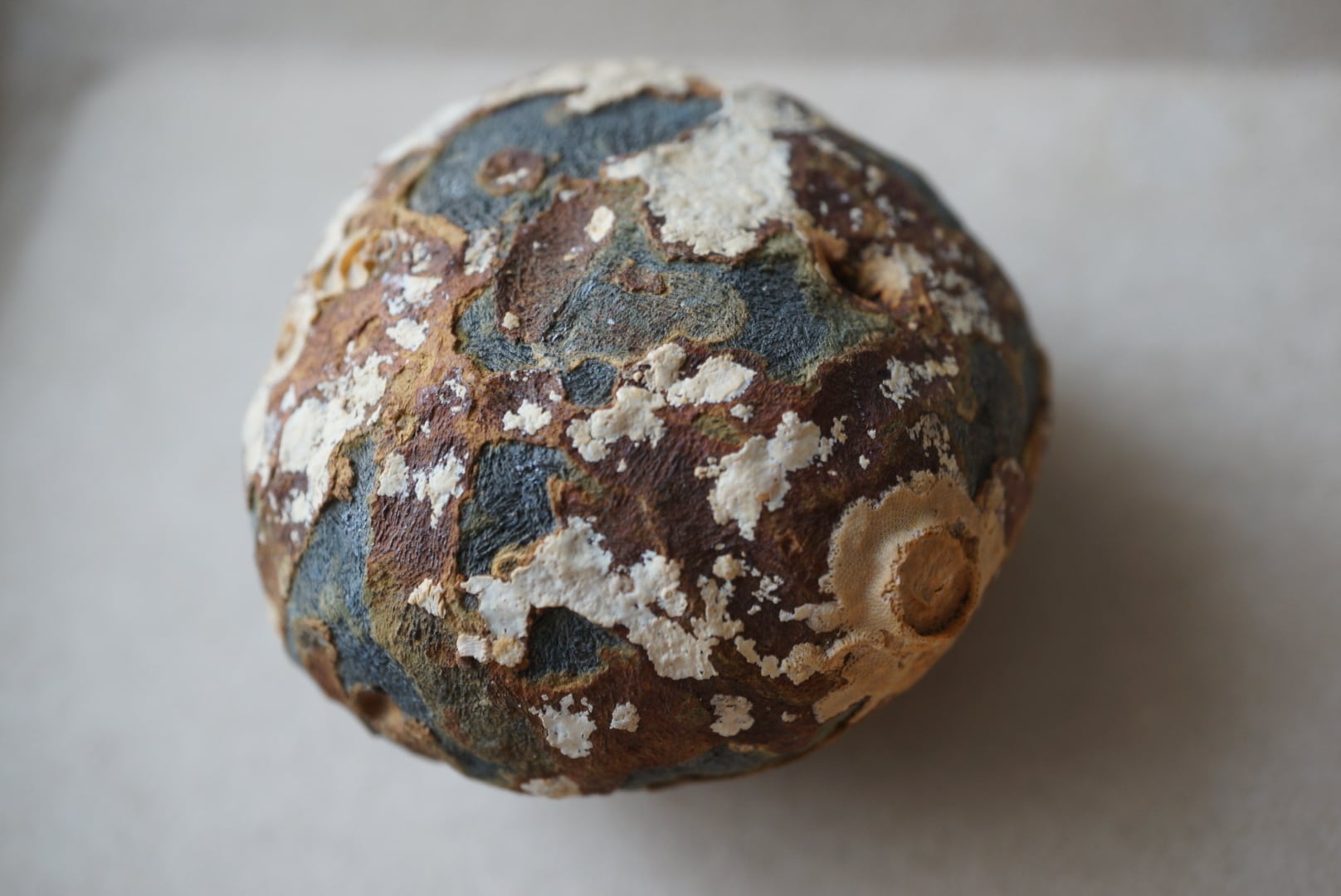 表面には貝殻やコケムシらしき海洋生物の痕跡が不規則な模様を描き、ひとつの惑星のような表情を見せています。