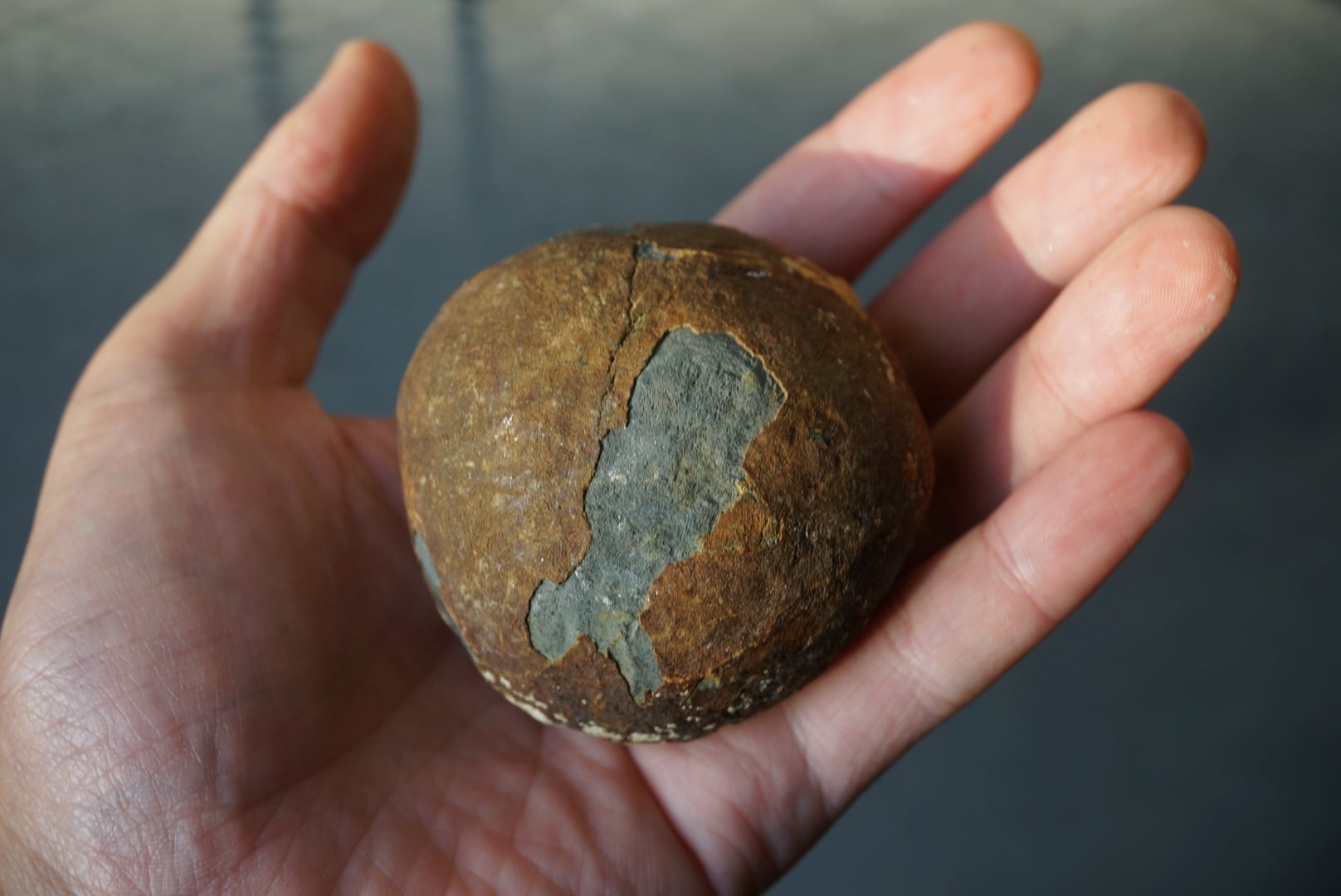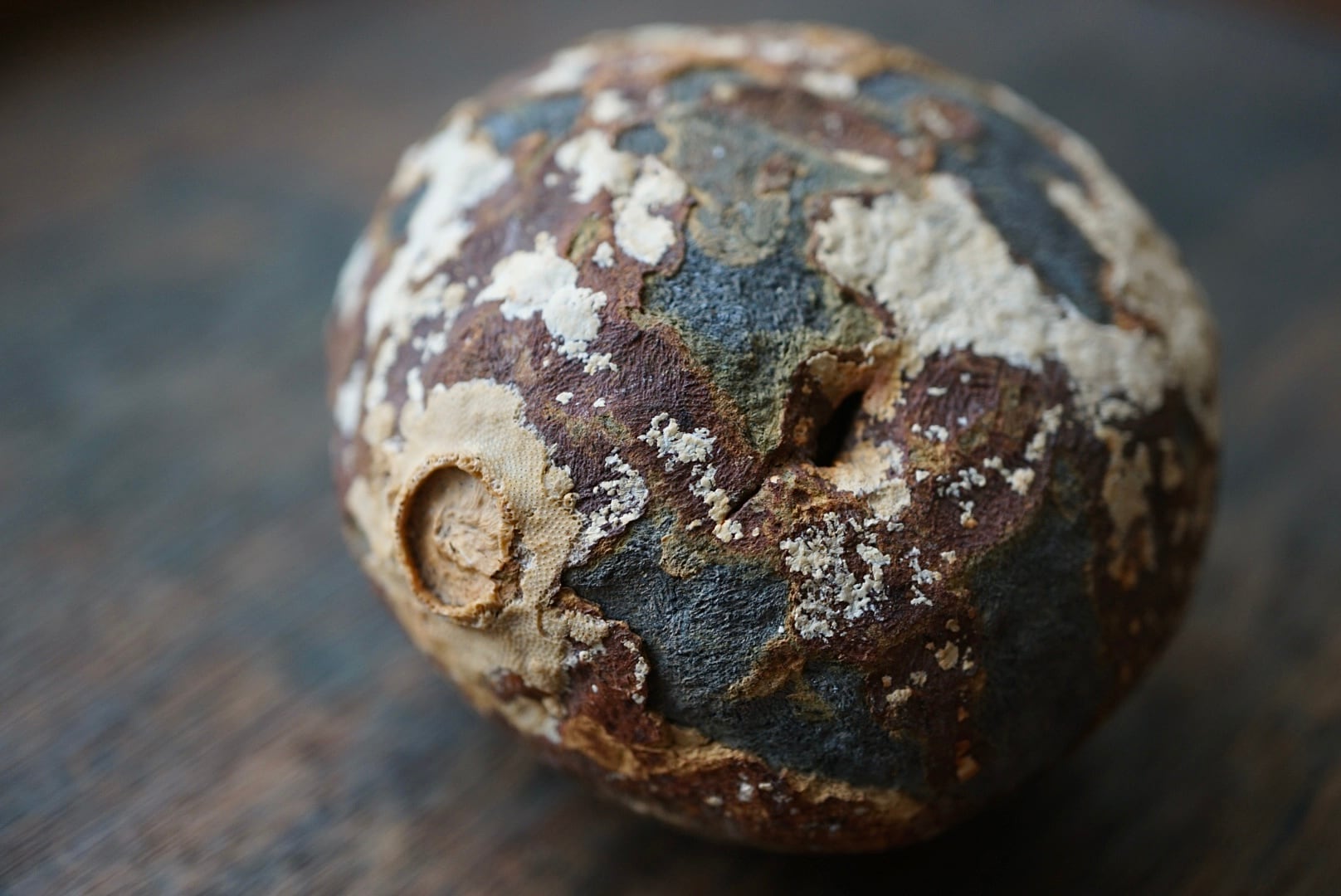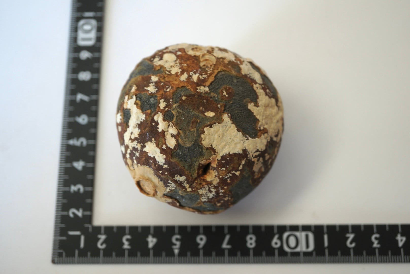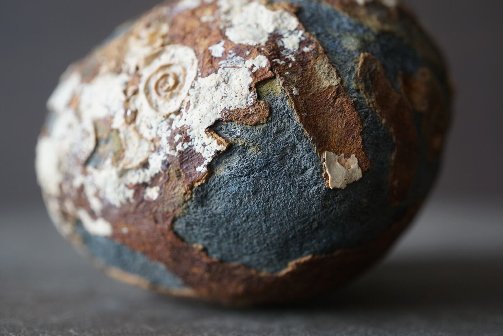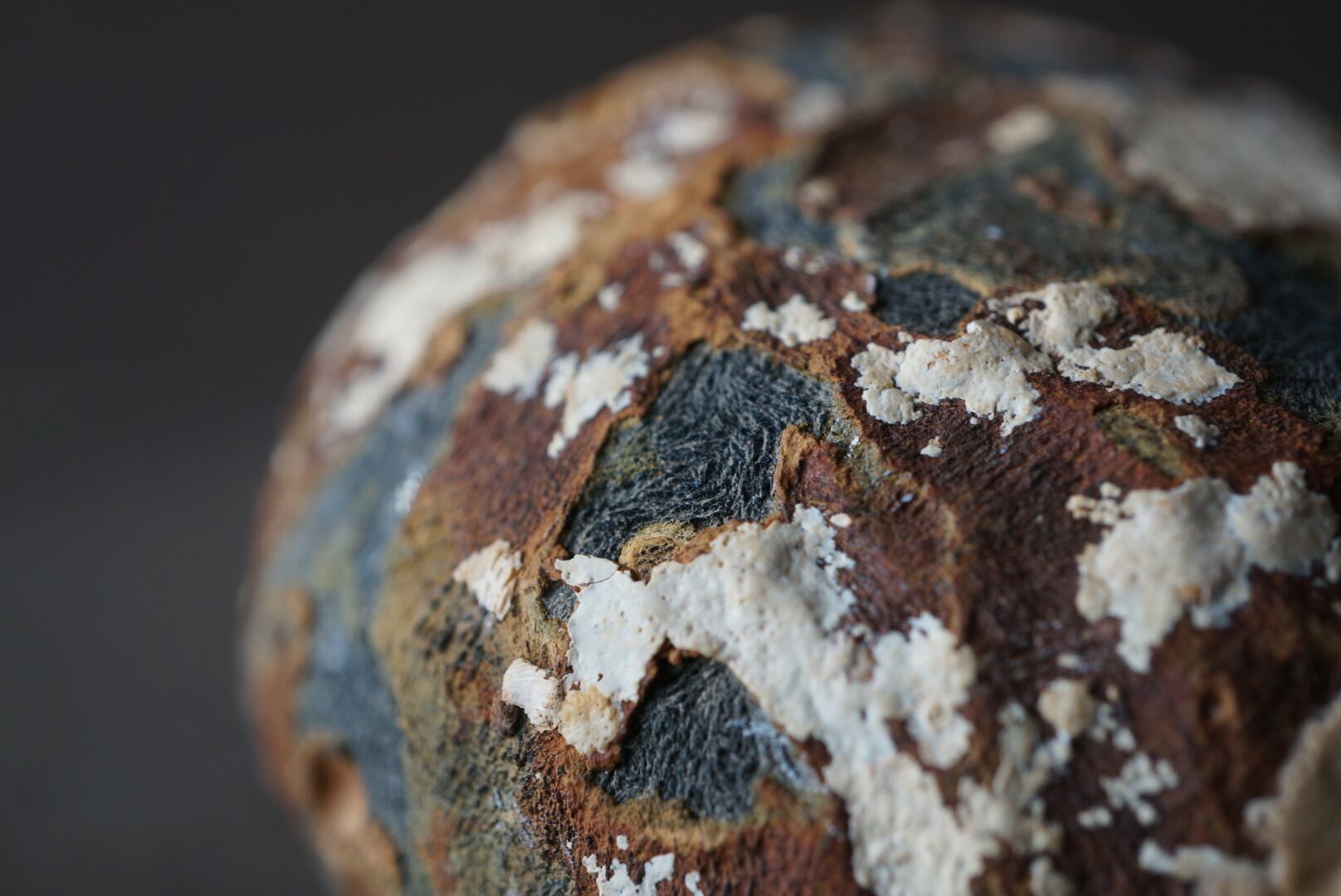 表面には貝殻やコケムシらしき海洋生物の痕跡が不規則な模様を描き、ひとつの惑星のような表情を見せています。