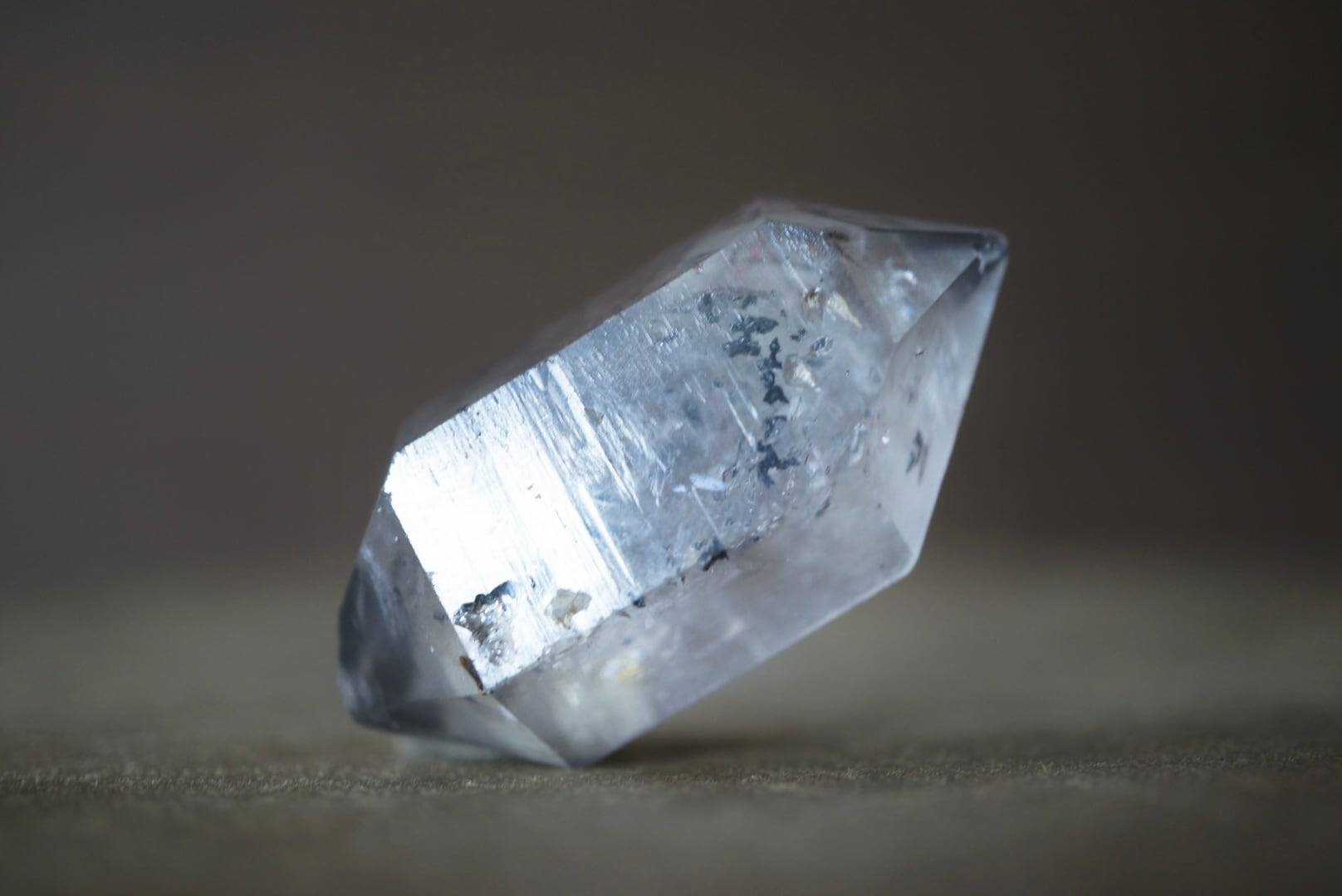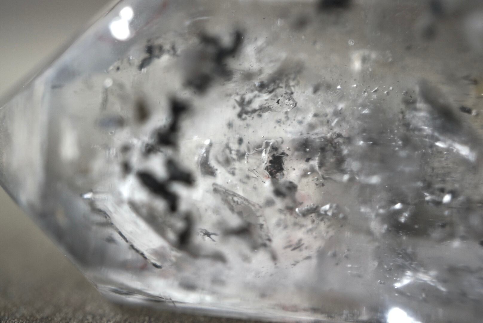 結晶の中心部にはわずかな水のゆらめきが閉じ込められ、傾けるとその存在がかすかに現れます。