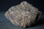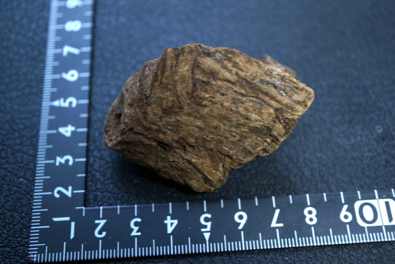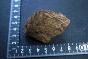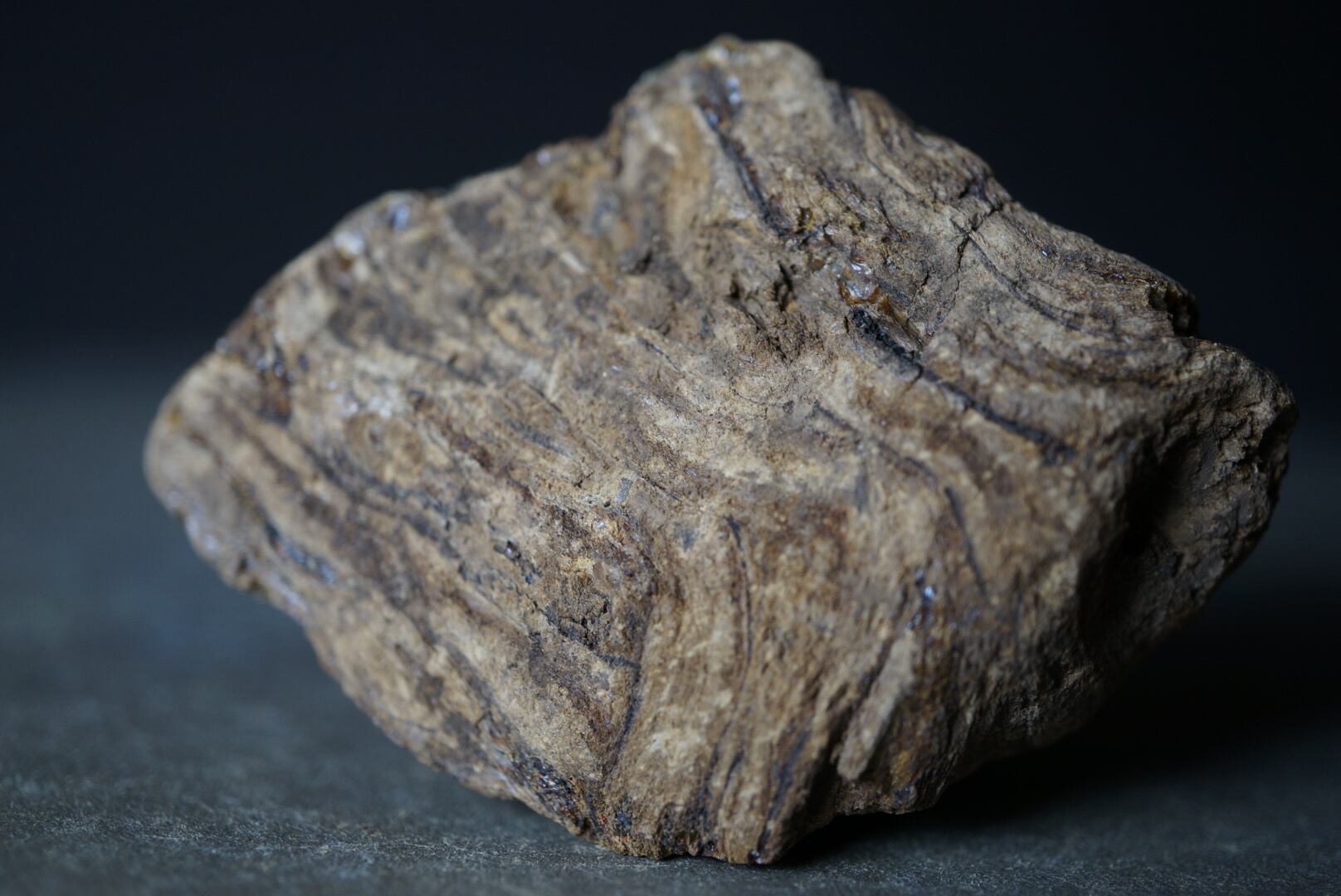 当時の森林環境を示す木質片がそのまま残り、組織の間に樹脂が染み込みながら硬化した構造が見られます。